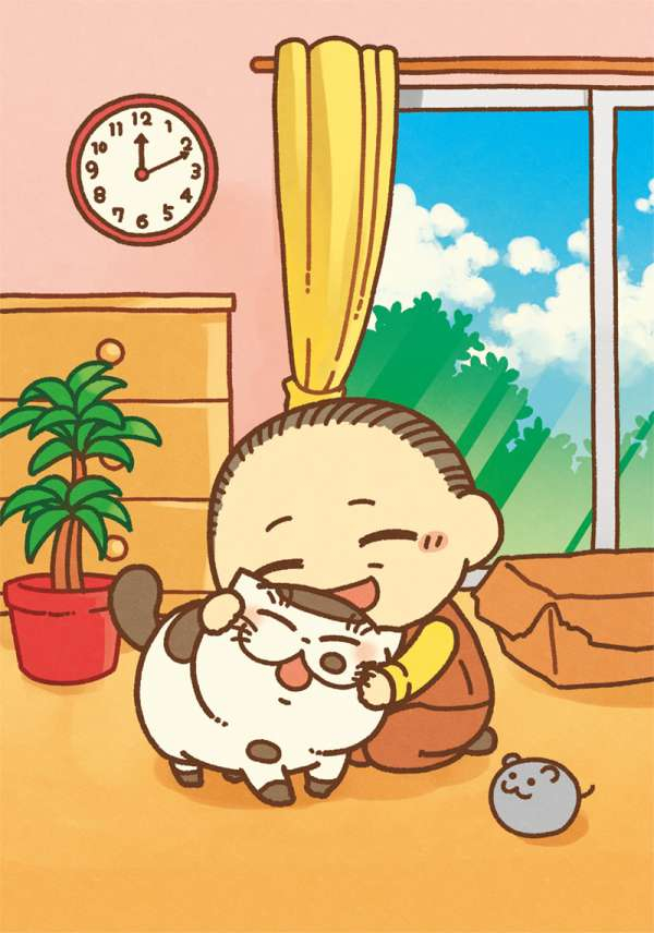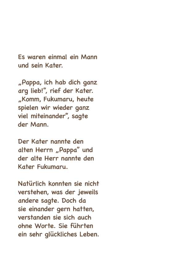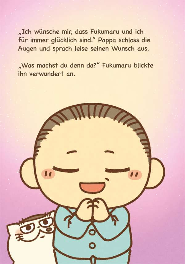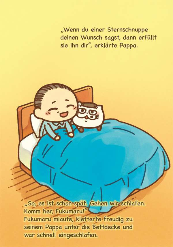 Der ältere Herr und sein rundlicher Kater Fukumaru haben sich sehr lieb. Auch wenn sie nicht dieselbe Sprache sprechen, verstehen sie einander, und jeder Tag ist für sie voller Glück. Als eines Nachts eine große Sternschnuppe am Himmel erscheint, wünscht sich Fukumaru, dass er und sein Herrchen für immer glücklich sein werden. Doch da passiert etwas Wundersames: die Sternschnuppe wird größer und größer! Als Fukumaru ihr voller Begeisterung nachjagt, trifft er plötzlich zwei sonderbare Wesen, die ihn um etwas bitten: „Hallo, Flauschkugel, würdest du uns ein wenig Glück geben?“
