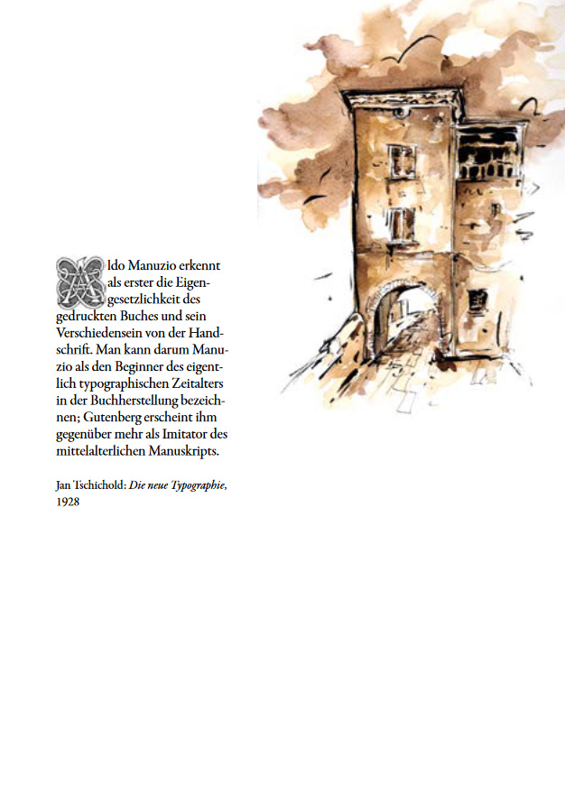 "Aldo Manuzio erkennt als erster die Eigengesetzlichkeit des gedruckten Buches und sein Verschiedensein von der Handschrift. Man kann darum Manuzio als den Beginner des eigentlich typographischen Zeitalters in der Buchherstellung bezeichnen; Gutenberg erscheint ihm gegenüber mehr als Imitator des mittelalterlichen Manuskripts."