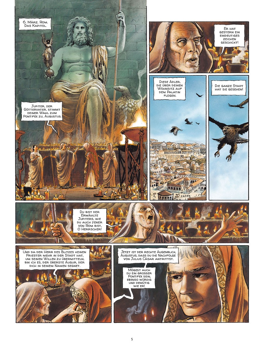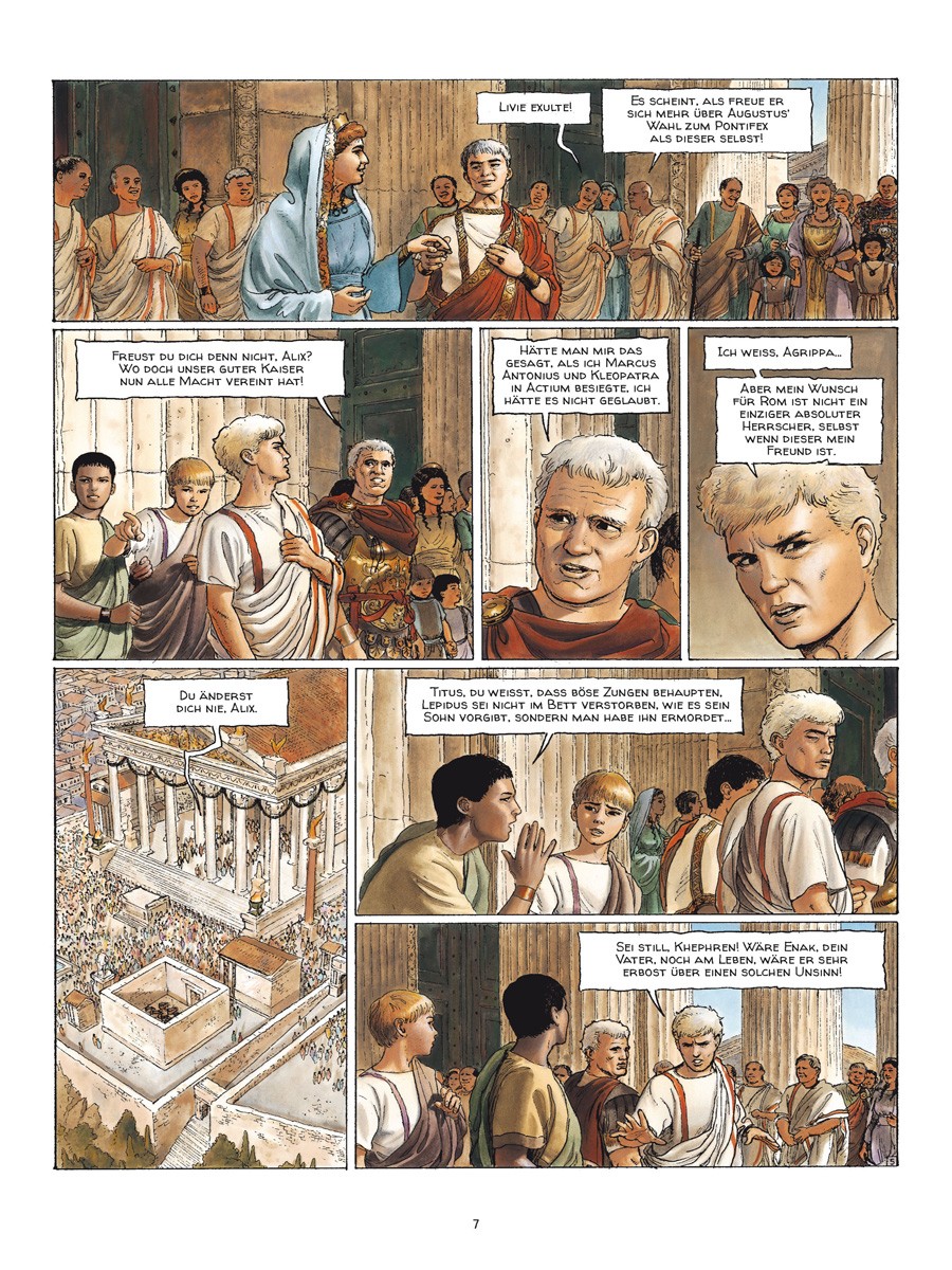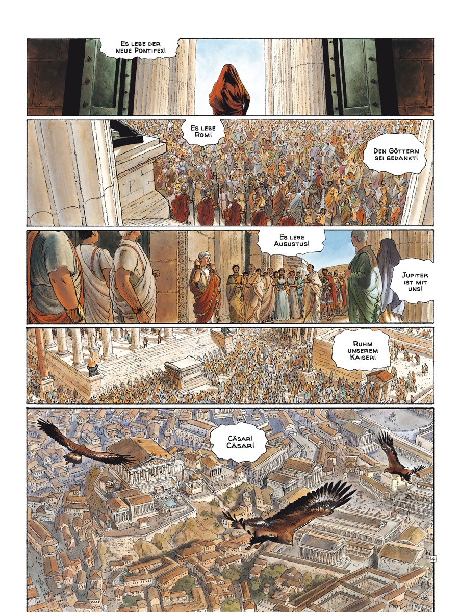 12 v. Chr. – Marcus Aemilius Lepidus, Pontifex von Rom, und Agrippa, der vom mächtigen Kaiser Augustus zu seinem Nachfolger ernannte Politiker, werden auf mysteriöse Weise von Adlern getötet, die ihre Eingeweide zerreißen. Von diesen Vorfällen beunruhigt, beauftragt Augustus seinen alten Freund, den Senator Alix Gracchus, die Fälle diskret zu untersuchen. Eine Ermittlung, die Alix, unterstützt von seinen Söhnen Titus und Kephren (der leibliche Sohn Enaks, den Alix nach dessen Tod adoptierte) auf die Spur des rätselhaften Herrn der Vögel führt. Doch die Gefahr ist noch lange nicht gebannt, sie bedroht nun sogar den Kaiser in Person. Und Alix wird schließlich herausfinden, das sich das gefährlichste Raubtier im Herzen von Rom versteckt, dort, wo es niemand vermutet hätte... Ein neues Kapitel öffnet sich für die von Jacques Martin geschaffene berühmte Figur. Im reifem Alter zum Senator von Rom aufgestiegen, erlebt Alix neue und spannende Abenteuer, die von Valérie Mangin erdacht und von Thierry Démarez prachtvoll in Szene gesetzt wurden. Ein Ereignis!