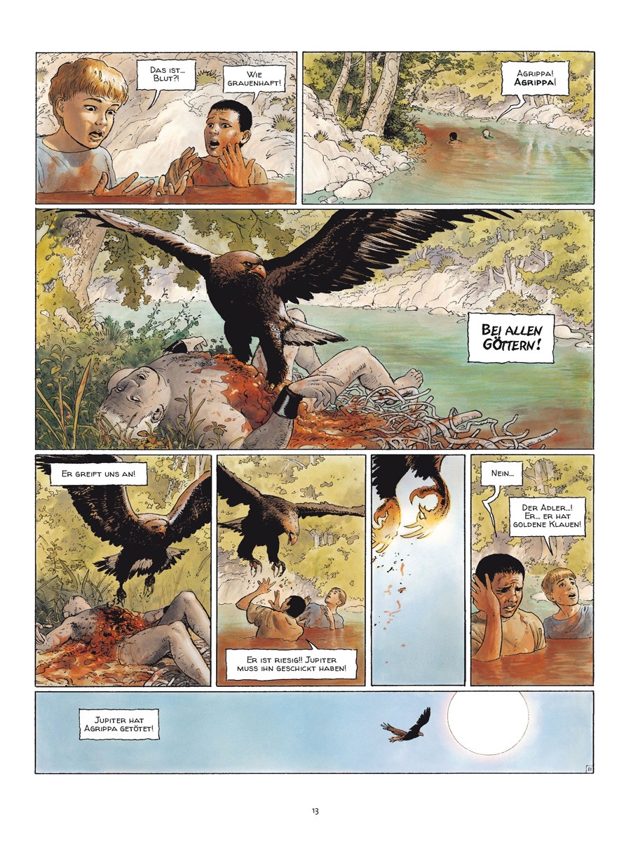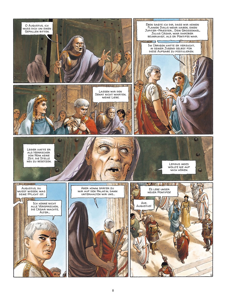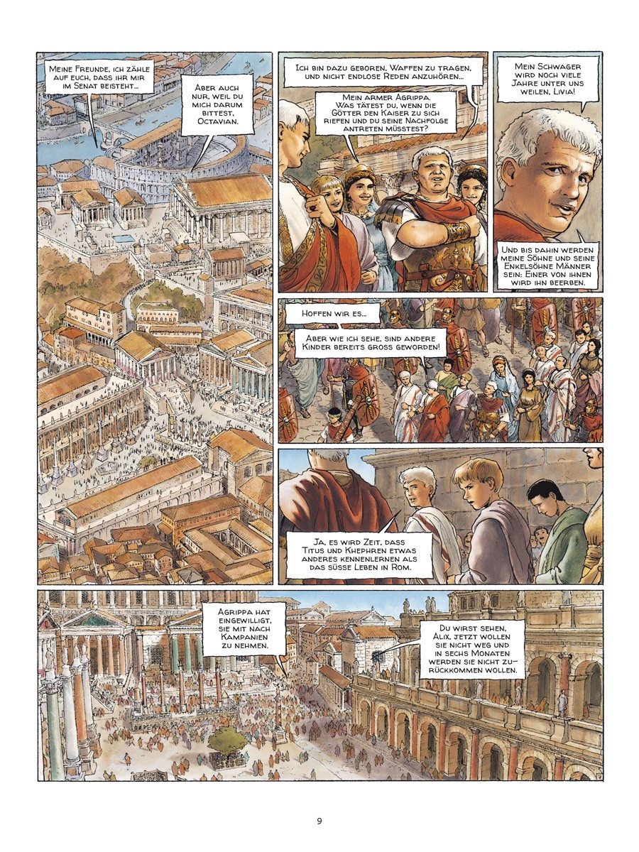 12 v. Chr. – Marcus Aemilius Lepidus, Pontifex von Rom, und Agrippa, der vom mächtigen Kaiser Augustus zu seinem Nachfolger ernannte Politiker, werden auf mysteriöse Weise von Adlern getötet, die ihre Eingeweide zerreißen. Von diesen Vorfällen beunruhigt, beauftragt Augustus seinen alten Freund, den Senator Alix Gracchus, die Fälle diskret zu untersuchen. Eine Ermittlung, die Alix, unterstützt von seinen Söhnen Titus und Kephren (der leibliche Sohn Enaks, den Alix nach dessen Tod adoptierte) auf die Spur des rätselhaften Herrn der Vögel führt. Doch die Gefahr ist noch lange nicht gebannt, sie bedroht nun sogar den Kaiser in Person. Und Alix wird schließlich herausfinden, das sich das gefährlichste Raubtier im Herzen von Rom versteckt, dort, wo es niemand vermutet hätte... Ein neues Kapitel öffnet sich für die von Jacques Martin geschaffene berühmte Figur. Im reifem Alter zum Senator von Rom aufgestiegen, erlebt Alix neue und spannende Abenteuer, die von Valérie Mangin erdacht und von Thierry Démarez prachtvoll in Szene gesetzt wurden. Ein Ereignis!