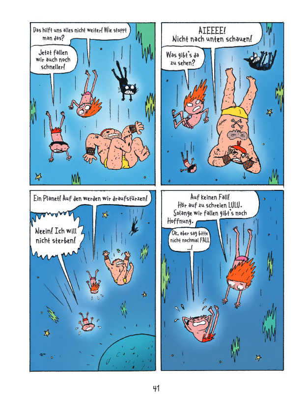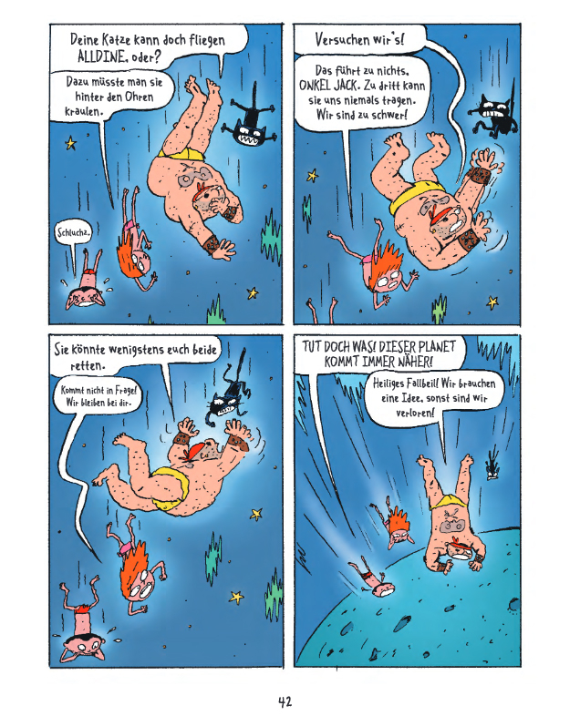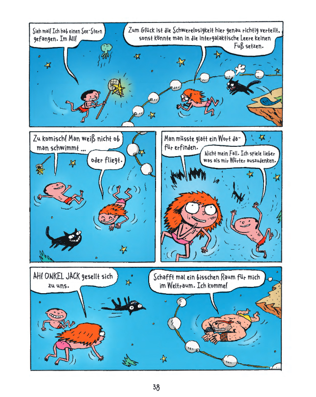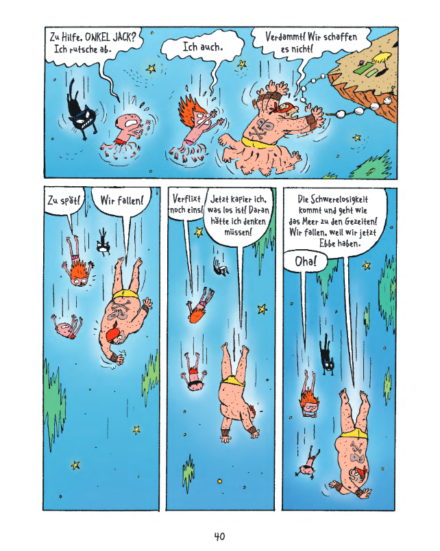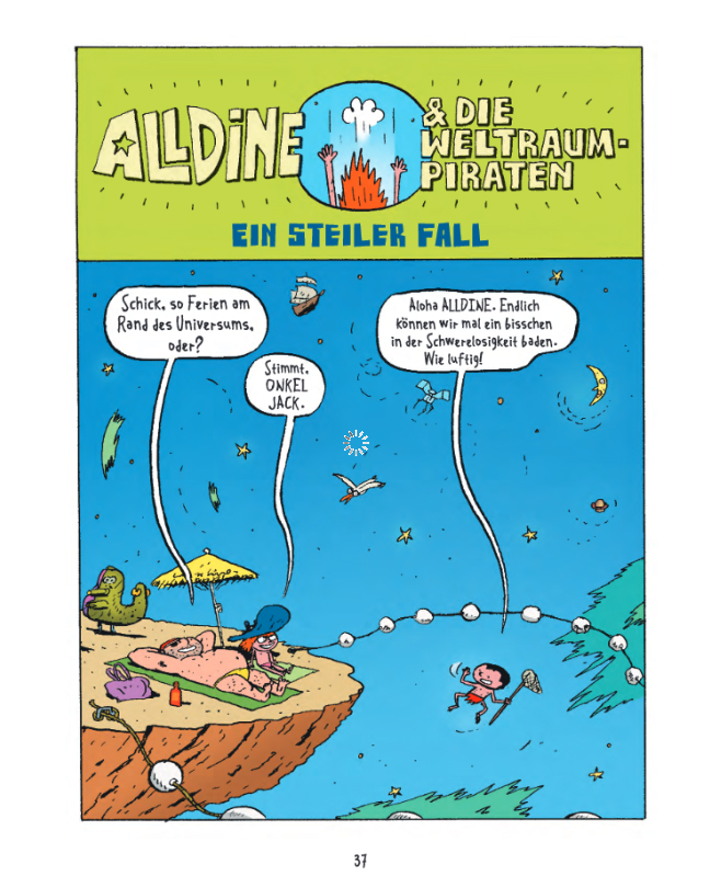 In Band 1: »NABELSCHAU« verkünden SUPERMUSKELPROTZ und Dr. KNAUTSCH den Ausnahmezustand, interessieren sich für Bauchnabel, holen Engel vom Himmel, kidnappen die fünf Sinne und spielen ein grausames Orgelkonzert. Außerdem müssen die Weltraumpiraten die Geheimnisse des Universums aufdecken, sich eines lästigen Fans erwehren und sogar die Ferien von ALLDINE am Rande des Universums entpuppen sich als große Gefahr.