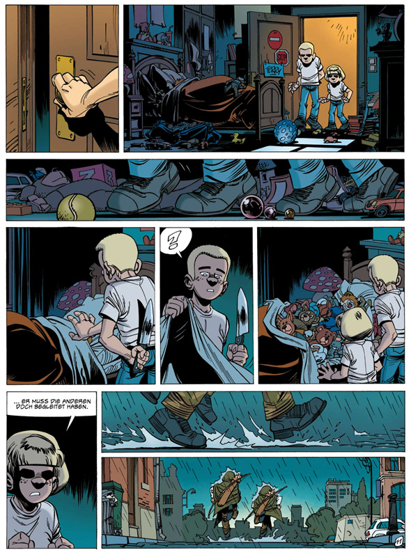 Nach Dodjis Beerdigung beschließen die Kinder, die geheimnisvolle rote Zone auch ohne ihren verstorbenen Anführer zu untersuchen. Dieses stellt sich als keine gute Idee heraus, denn dort bricht nach und nach alles in sich zusammen. Außerdem wird Terry von Alexander und Selene verfolgt, die ihm mit Pfeil und Bogen sicherlich nichts Gutes wollen. Und als der Sog des Wassers immer stärker wird, überstürzen sich die Ereignisse...Mit diesem fünften Band beenden Bruno Gazzotti (der Zeichner von Soda) und Fabien Vehlmann (der neue Szenarist von Spirou und Fantasio) den ersten Zyklus.