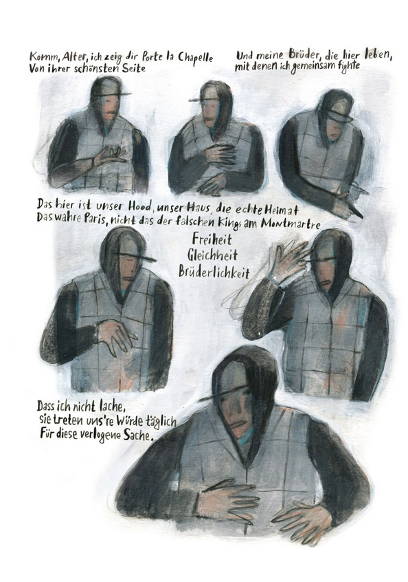 Constantin Satüpo hat vor Ort recherchiert und stellt uns einige Bewohner dieser Obdachlosenzeltstadt vor. Das Besondere dabei ist, dass der gesamte Erzähltext als Rap geschrieben wurde. Der Sprechgesang pocht und hämmert durch diese Reportage und nimmt die Leser*innen mit in die harte Realität der französischen Metropole.