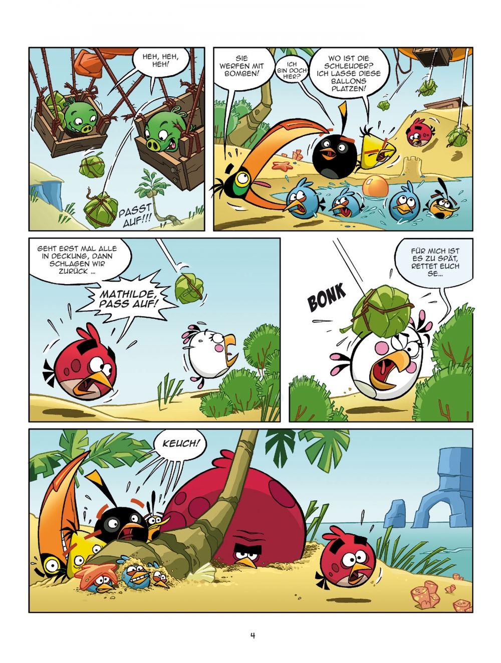 Können die Schweine mit einer hinterhältigen Propaganda-Aktion an die heißbegehrten Vogeleier kommen? Oder ist der Zusammenhalt des Vogelschwarms stark genug? Welche Auswirkungen hat die Erfindung des Tonbandgeräts auf den Frieden auf Piggy Island? Was hat es mit dem riesigen Vergnügungspark der Schweine auf sich? Und wird Matilda ihr liebevoll verkünstleltes Gemälde an den Mann (oder Vogel oder Schwein) bringen können?