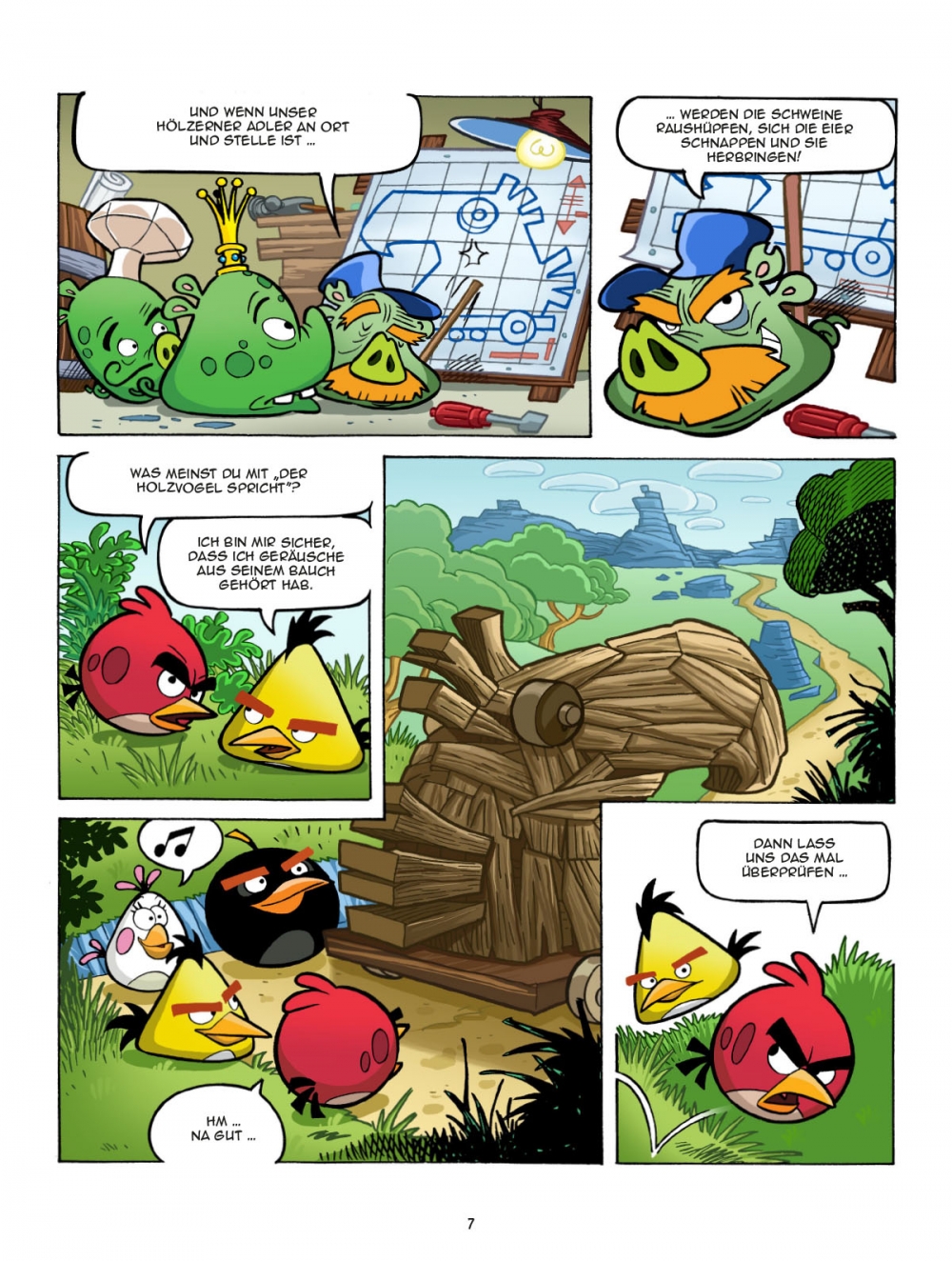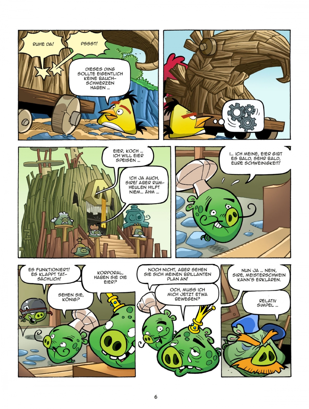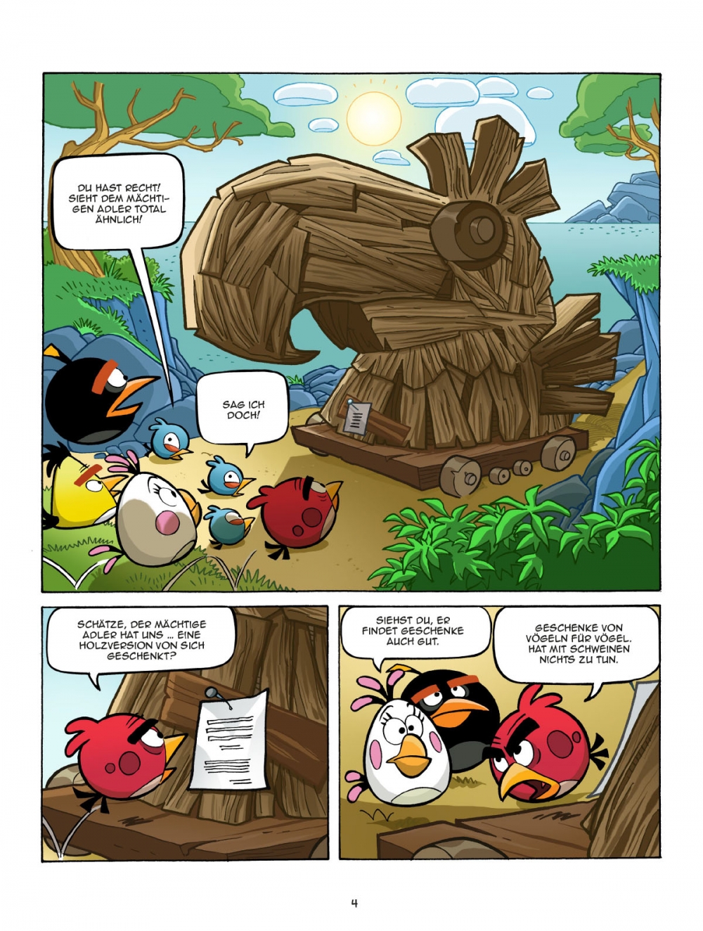 In diesem neuesten Band ihrer Comicabenteuer greifen die Schweine in die uralte trojanische Trickkiste, um endlich an die köstlichen Vogeleier heranzukommen. Doch auch die gefiederten Überflieger haben die eine oder andere List auf Lager.