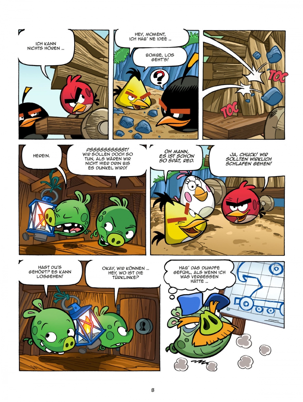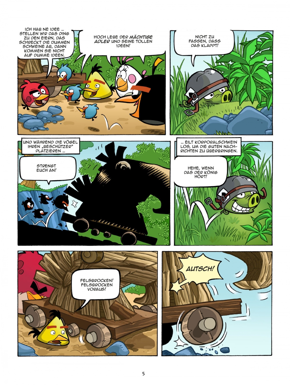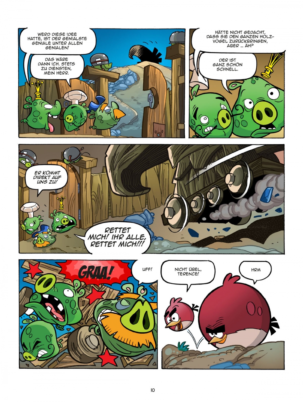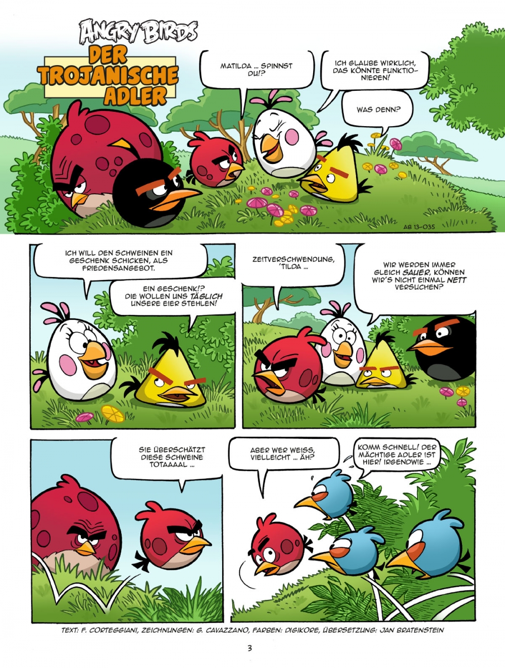In diesem neuesten Band ihrer Comicabenteuer greifen die Schweine in die uralte trojanische Trickkiste, um endlich an die köstlichen Vogeleier heranzukommen. Doch auch die gefiederten Überflieger haben die eine oder andere List auf Lager.