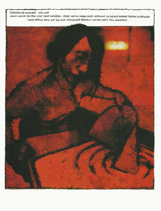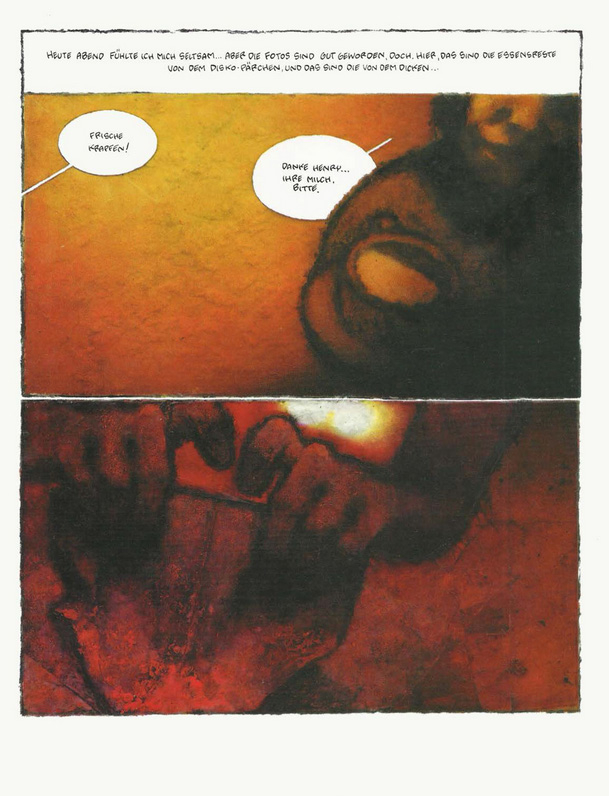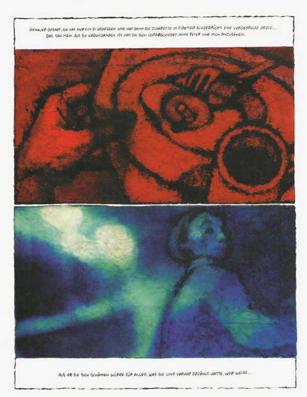 Die stille Melancholie der gesprochenen Wörter und geschriebenen Sätze setzt sich in der Gestaltung der Bilder fort. Während die Konturen der oft nur schemenhaft zu erkennenden Personen und Gegenstände in einem tiefen, dunklen und dick aufgetragenen Schwarz gehalten sind, setzt Stefano Ricci die Leuchtkraft der Farben als Gegenmittel ein. Die Intensität der Farben steigert und ergänzt den poetischen Reichtum von Gabriella Giandellis Sprache. Wie zwei Hälften eines Dyptichons kleben die Bilder mit ihrer rauhen Struktur auf den Seiten und laden den Betrachter zu einer visuellen Reise in den malerischen Kosmos von anita ein.