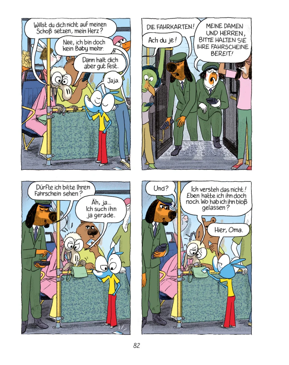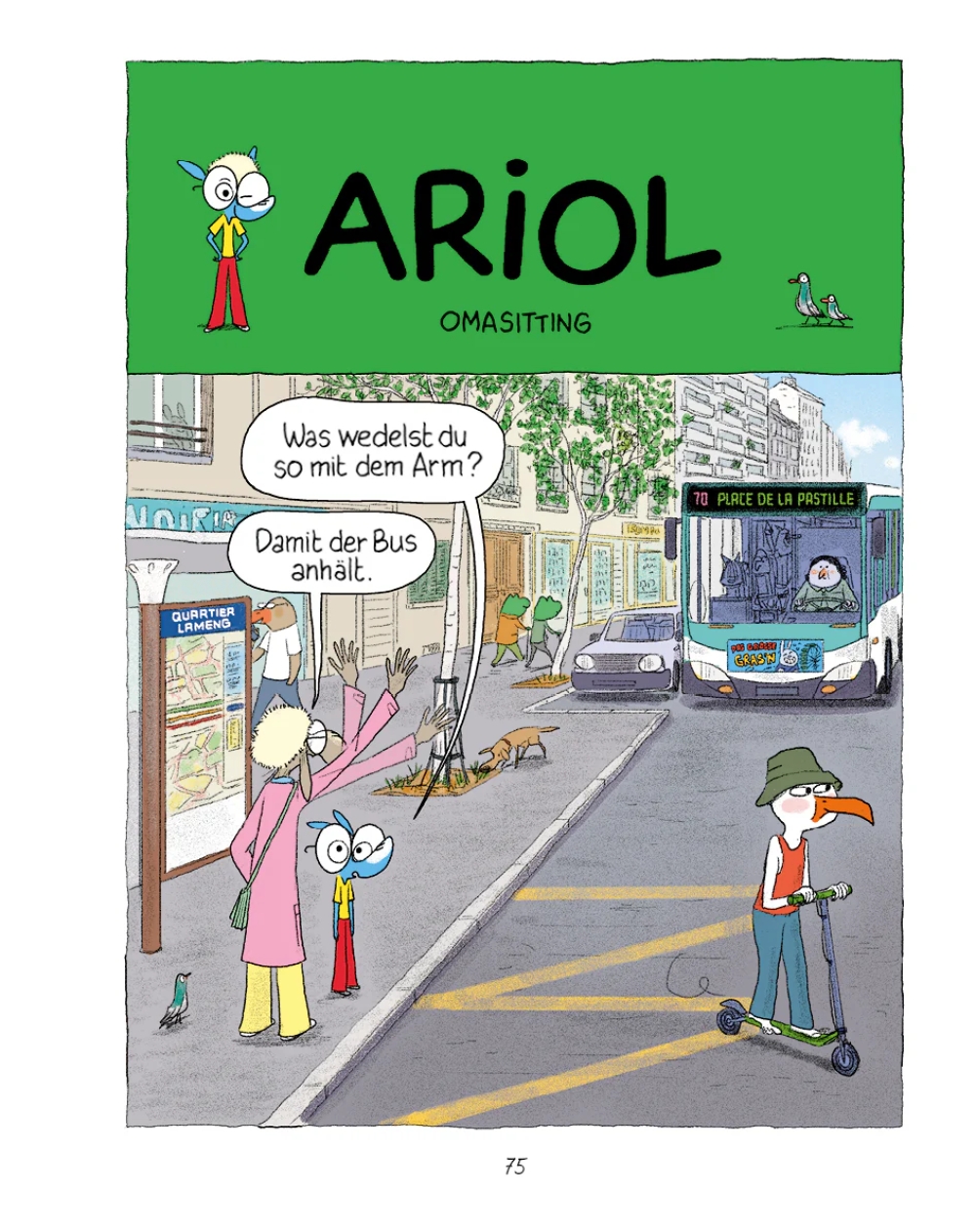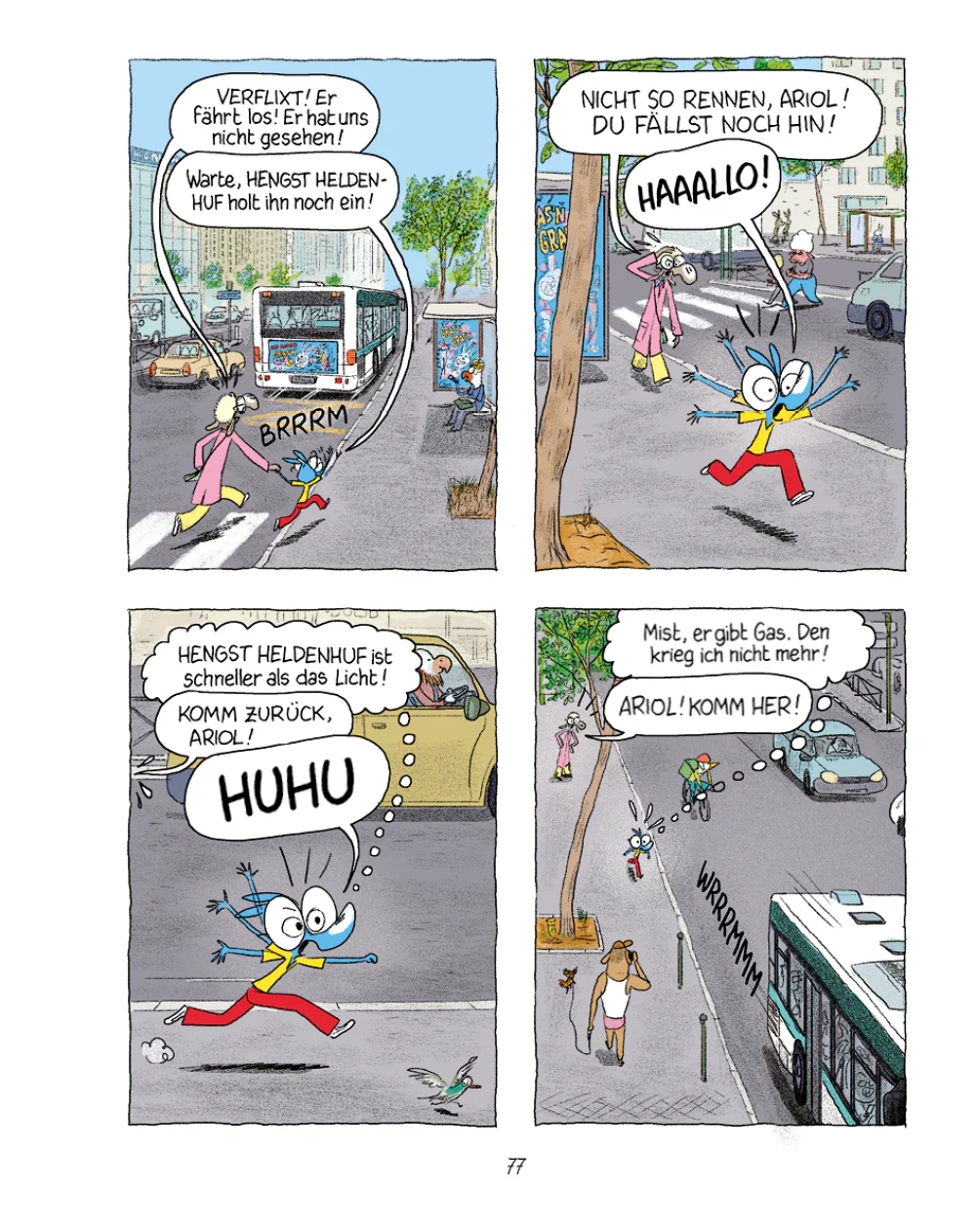 Zwölf neue "Ariol"-Geschichten übers Abschreiben („Psst, Ariol, wie schreibt man 'Bonbon'?“„H-A-U… A-B!“), die geflügelten Worte adeliger Ahnen („Nur weil wir Esel sind, sind wir noch lange keine Esel“) und Steine-Ditschen mit Opa („AAARGH! Mein Ischias!“).