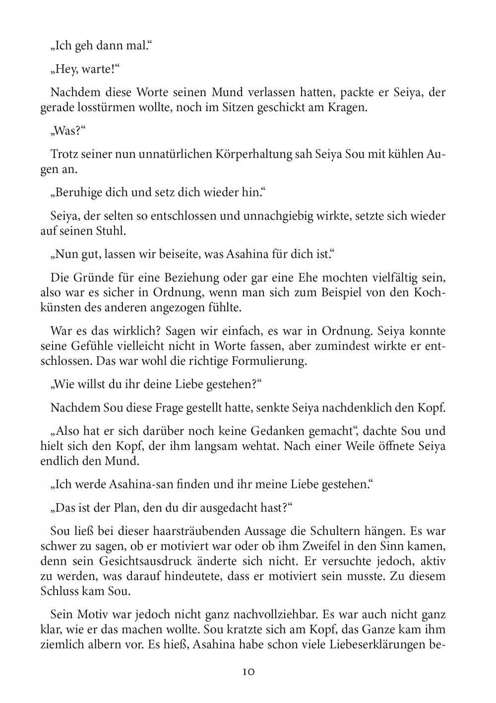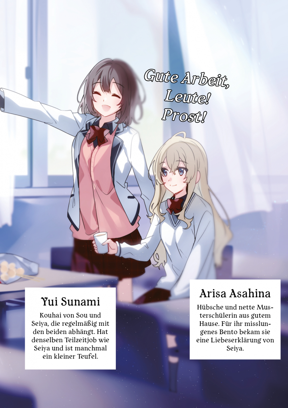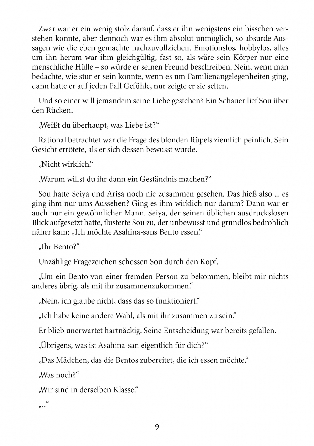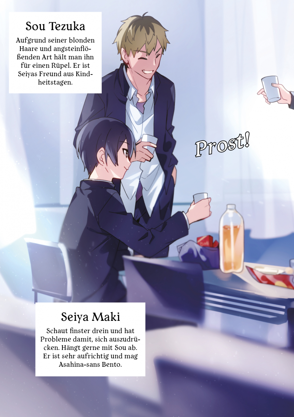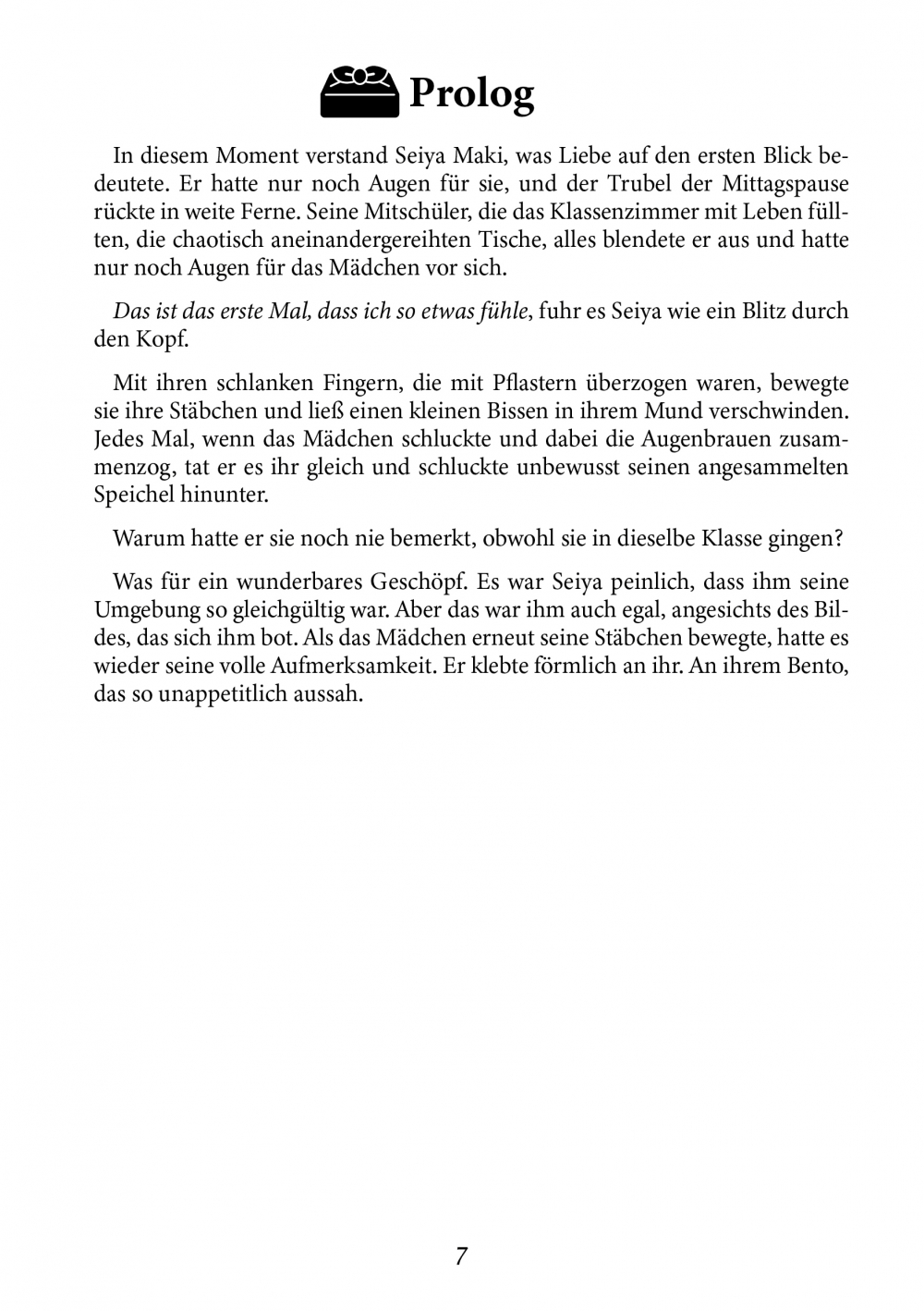 Arisa fühlt sich auf den Arm genommen und gibt Seiya wütend einen Korb. Doch seine Freundlichkeit und sein unermüdlicher Beistand bei ihren Sorgen und Ängsten lassen in ihr immer mehr Gefühle aufkeimen … bis sie sein Geheimnis erfährt, über das niemand Bescheid wissen darf. Wie wird die Beziehung der beiden verlaufen? Und warum möchte Seiya unbedingt Arisas Bento essen?