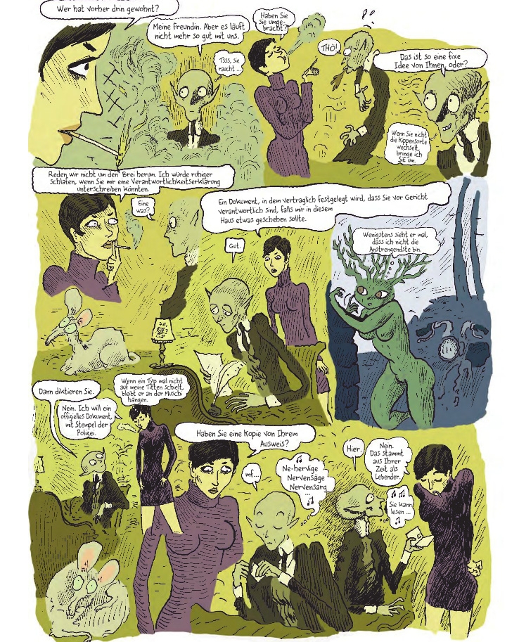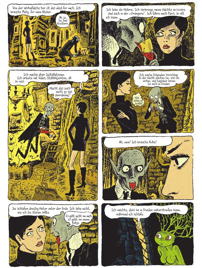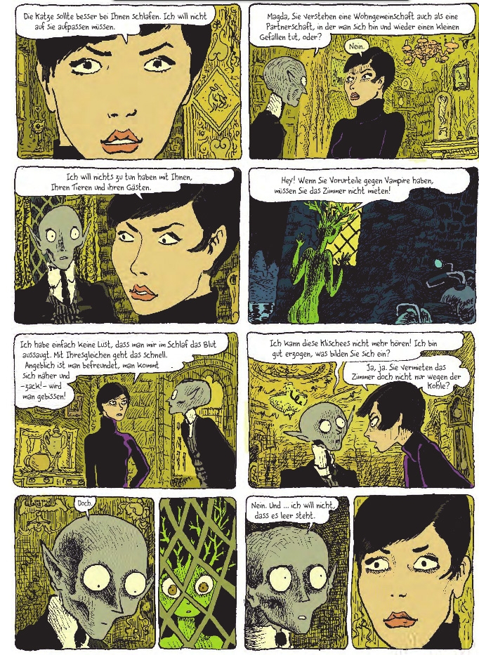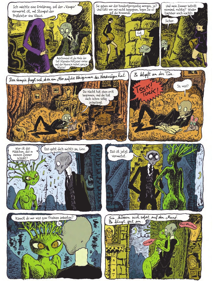 Aspirine vereint die letzten zwei Bände von Joann Sfars Comic-Klassiker Grand Vampir und den Abschlussband Le Bestiaire Amoureux, in dem das französische Multitalent sämtliche Figuren seiner Vampir-Reihe noch mal Revue passieren und ein letztes Mal aufeinander treffen lässt.