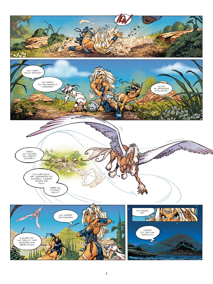 Das Griechenland der Mythologie. Aus dieser Epoche wurden uns die wunderbarsten Legenden überliefert. Und dies ist eine von ihnen: die fantastische Legende von Atalante. Gleich nach ihrer Geburt von ihrem Vater ausgesetzt und von der Göttin Hera dazu verurteilt, ohne Liebe zu leben, wird sie von Waldwesen aufgenommen. Die Nymphen, Satyre und Dryaden lehren sie die Sprache der Tiere. Zur schönen Abenteuerin herangewachsen, begleitet sie die Argonauten auf ihrer Suche nach dem Goldenen Vlies. Ihr ist es als einziger Frau erlaubt, den großen griechischen Helden auf diesem fantastischen Abenteuer zu folgen.