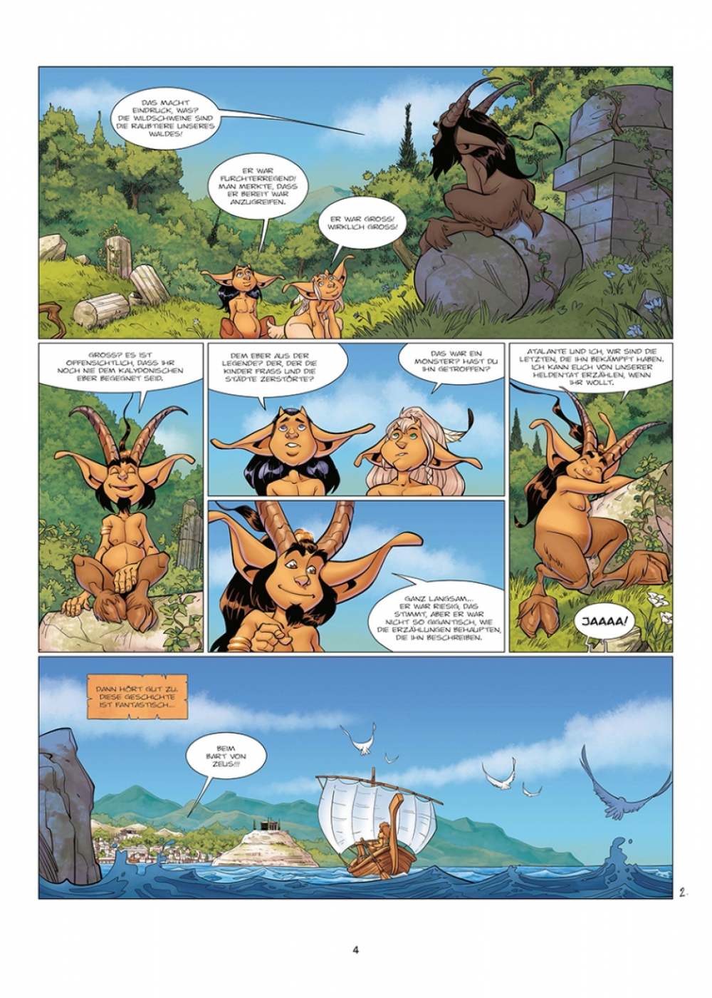 Die Argonauten sind einem riesigen, zerstörerischen Wildschwein auf der Spur. Atalante, Pyros und Herakles schließen sich ihrer Jagd an, und schon bald entbrennt ein erbarmungsloses Duell zwischen Atalante und dem Untier. Denn das Schwein steht unter dem Schutz der Artemis! Wem wird die Gunst der Göttin letztlich gelten?