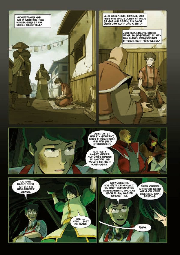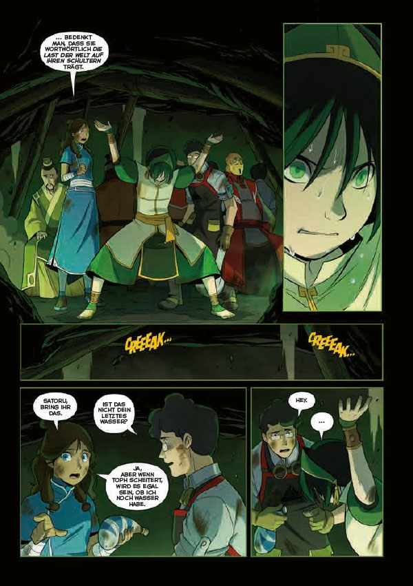 Die Freunde befinden sich wieder mitten in einer Zerreißprobe. Müssen Traditionen rigide bewahrt werden? Ist der Fortschritt überhaupt noch aufzuhalten? Während jeder sich weiter auf seine Sichtweise der Dinge versteift, stoßen Katara und Sokka, die zwischen den Fronten stecken, zufällig auf die skrupellosen Machenschaften der Fabrikbesitzer und damit auf die verheereden Seiten der modernen Arbeitswelt. Einer Welt, der gegenüber Toph und die anderen aus Angst, Unwissenheit oder Alternativlosigkeit lieber die Augen und die Sinne verschließen wollen. Doch auch Aang muss auf der anderen Seite erkennen, dass es nicht einfach ist, das Alte in die Gegenwart hinüberzuretten. Vor allem nicht, wenn sich die Vergangenheit als gewaltiger Dämon zeigt, der mit Dröhnen und Gezeter klar zu verstehen gibt, dass ihm die aktuelle zivilisatorische Entwicklung mehr als zuwider ist …