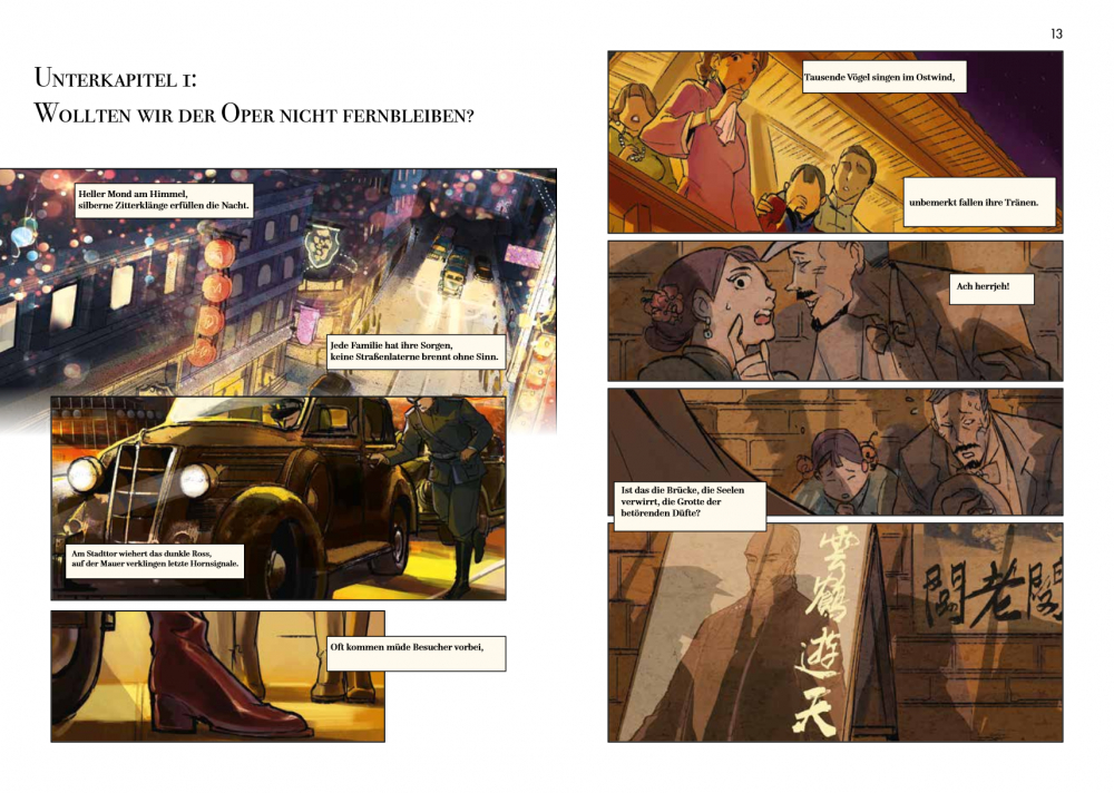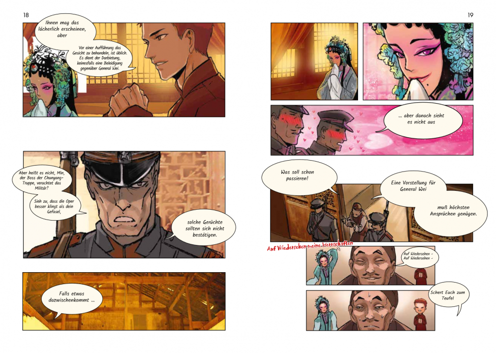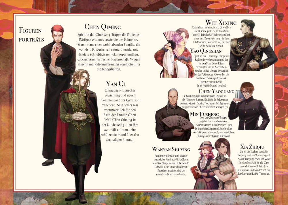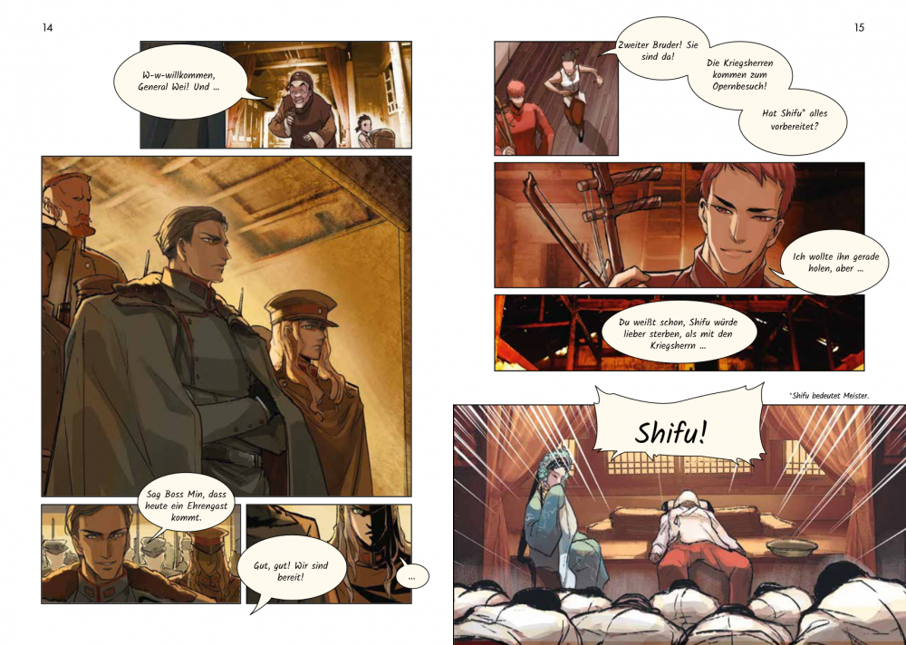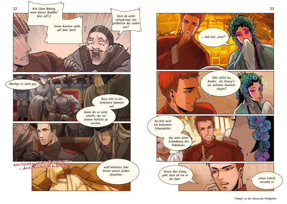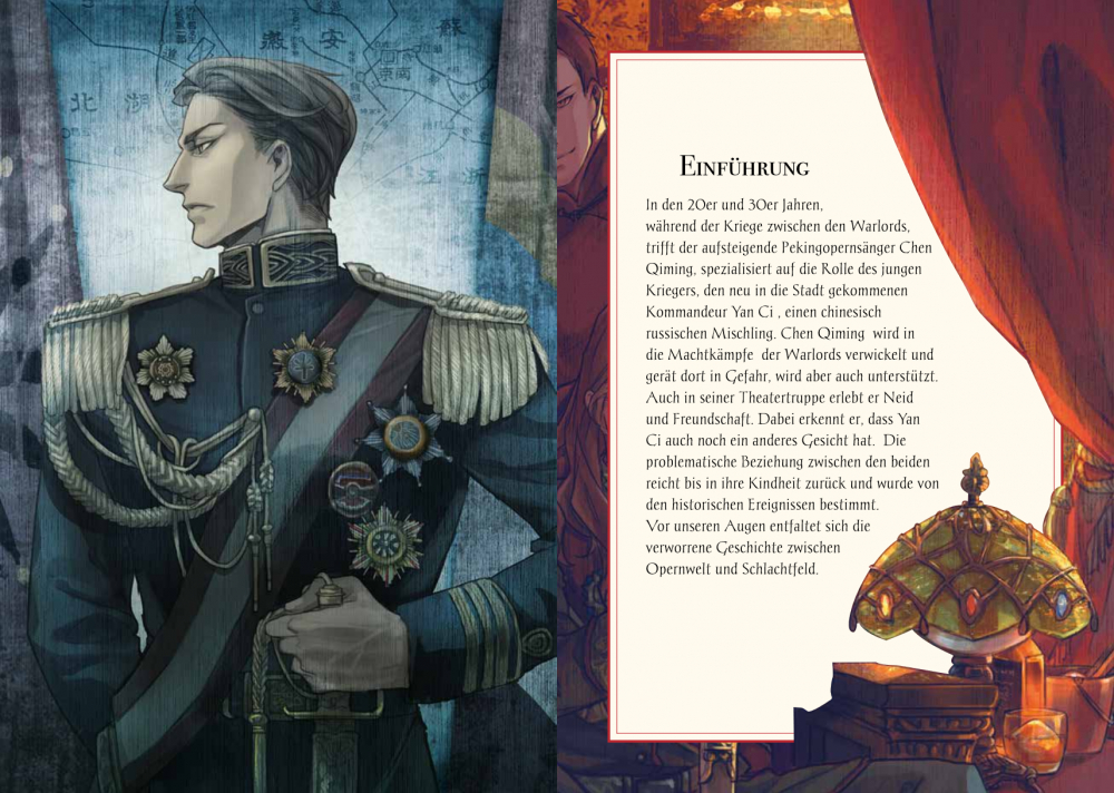 Yancheng, eine fiktive, an Peking angelehnte Stadt in Nordchina, in den 1920er und 30er Jahren, Warlords haben das Land unter sich aufgeteilt. Da begegnet Chen Qiming, ein aufsteigender Stern am Pekingopernhimmel, dem jungen russisch-chinesischen Kommandeur Yan Ci. Es stellt sich heraus, dass ihre Verbindung bis in die Kindheit zurückreicht. Doch bevor das geklärt werden kann, werden die beiden in die Intrigen zwischen den Pekingoperntruppen und den Machtkampf zwischen den Warlords verwickelt. Wir erleben die aufregende Welt der Pekingoper, wo auf und hinter der Bühne immer wieder mit den Geschlechterrollen gespielt wird. Die Handlung der Stücke spiegelt die Konflikte im realen Leben, poetische Operntexte kontrastieren mit der drastischen Umgangssprache der Protagonisten. Grandios gezeichnet, mit viel Witz und Tempo entfaltet sich vor unseren Augen eine verworrene Geschichte zwischen Opernbühne und Schlachtfeld.