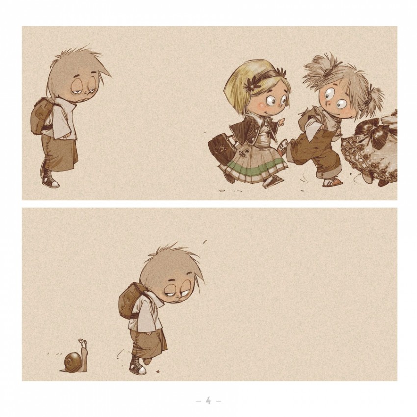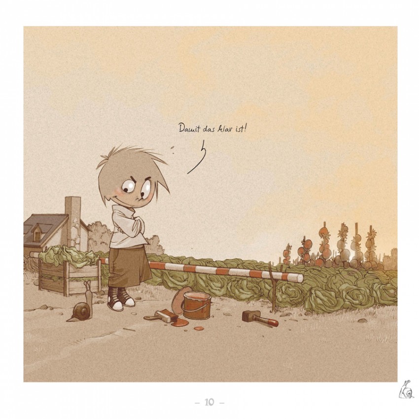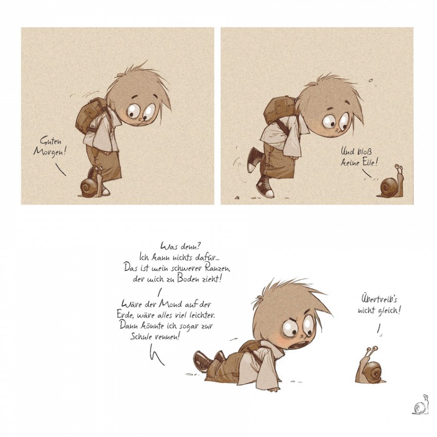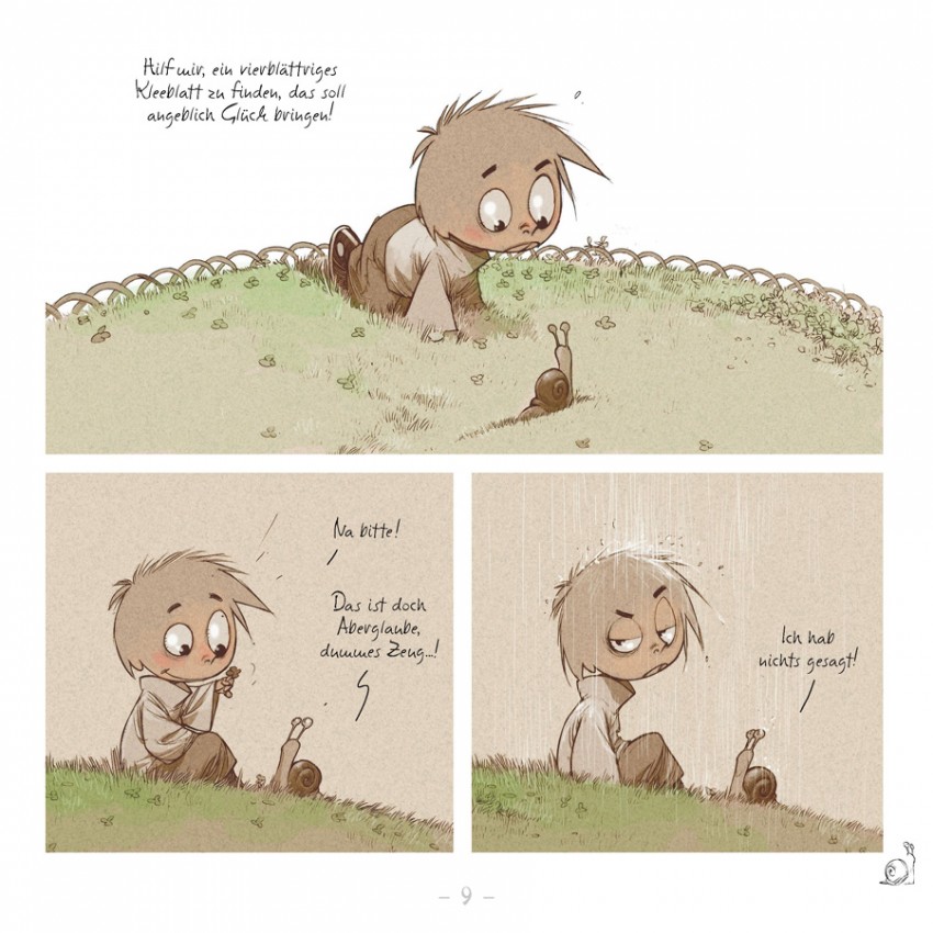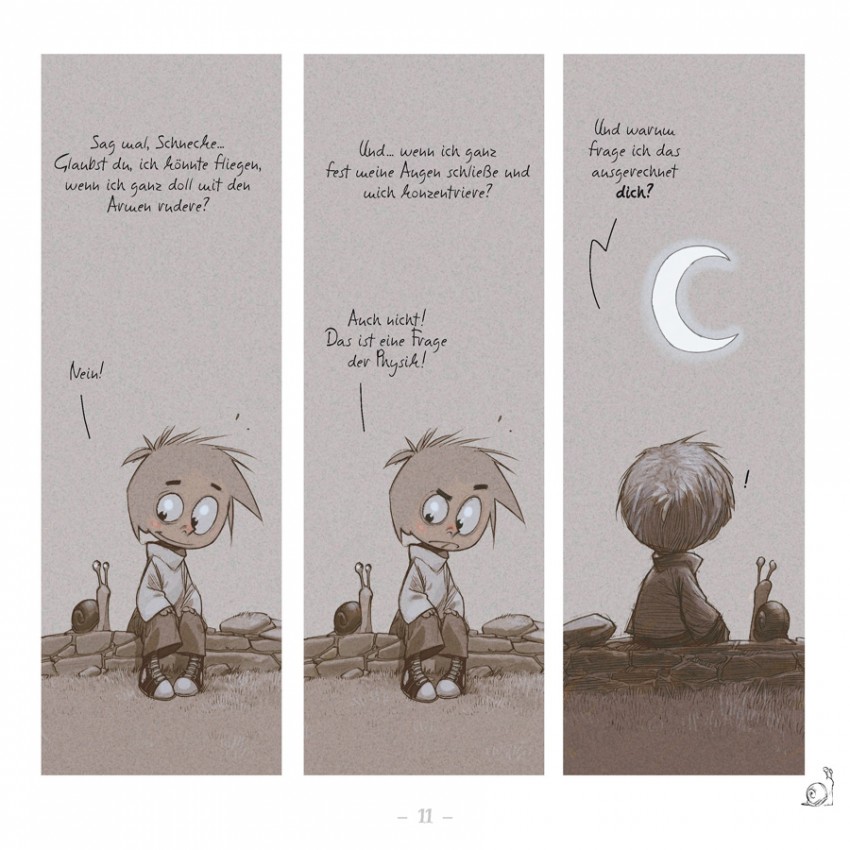 In kurzen Geschichtchen, die Traumepisoden nicht unähnlich sind, schaut sich der kleine blonde Strubbelkopf die Sterne und den Mond an, philosophiert mit seinem Freund, der Schnecke und beobachtet die Welt um sich herum ganz genau.