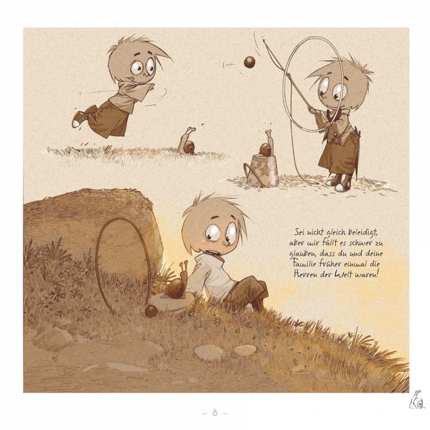 Changierend zwischen Comic und Illustration schuf der ansonsten eher für heroische Fantasy (z.B. »Das verlorene Paradies« und »Die Legende der Drachenritter«, beide bei Splitter) bekannte Künstler Alberto Varanda träumerisch anmutende Bilder in sanfter Sepia-Kolorierung, die den Leser eintauchen lassen in die fantastische Welt der Kindheit.