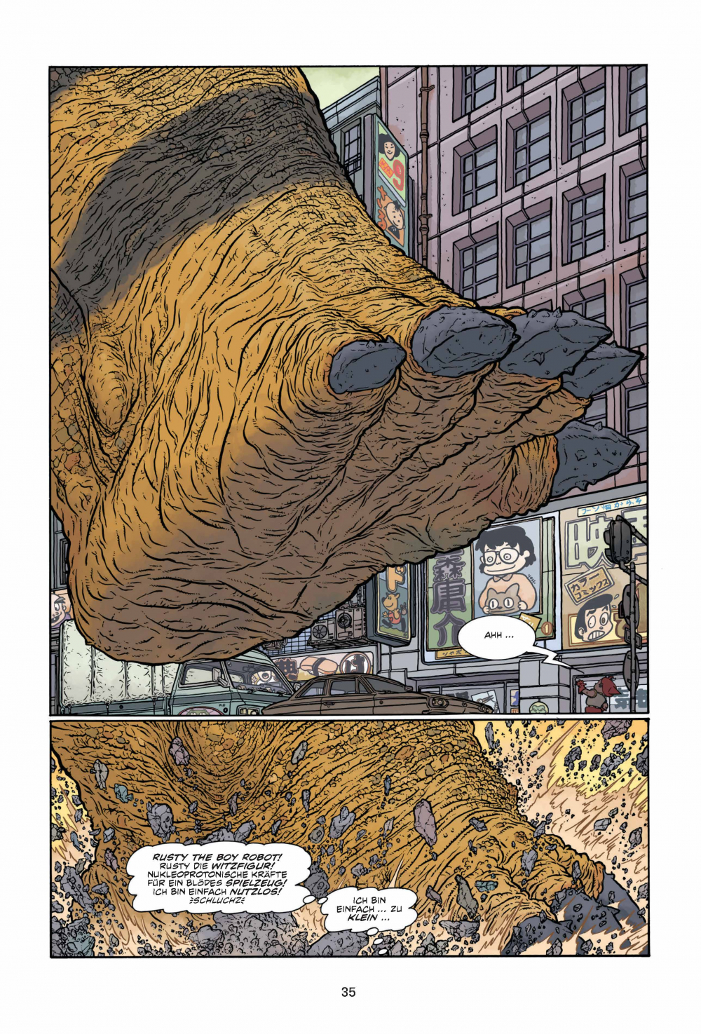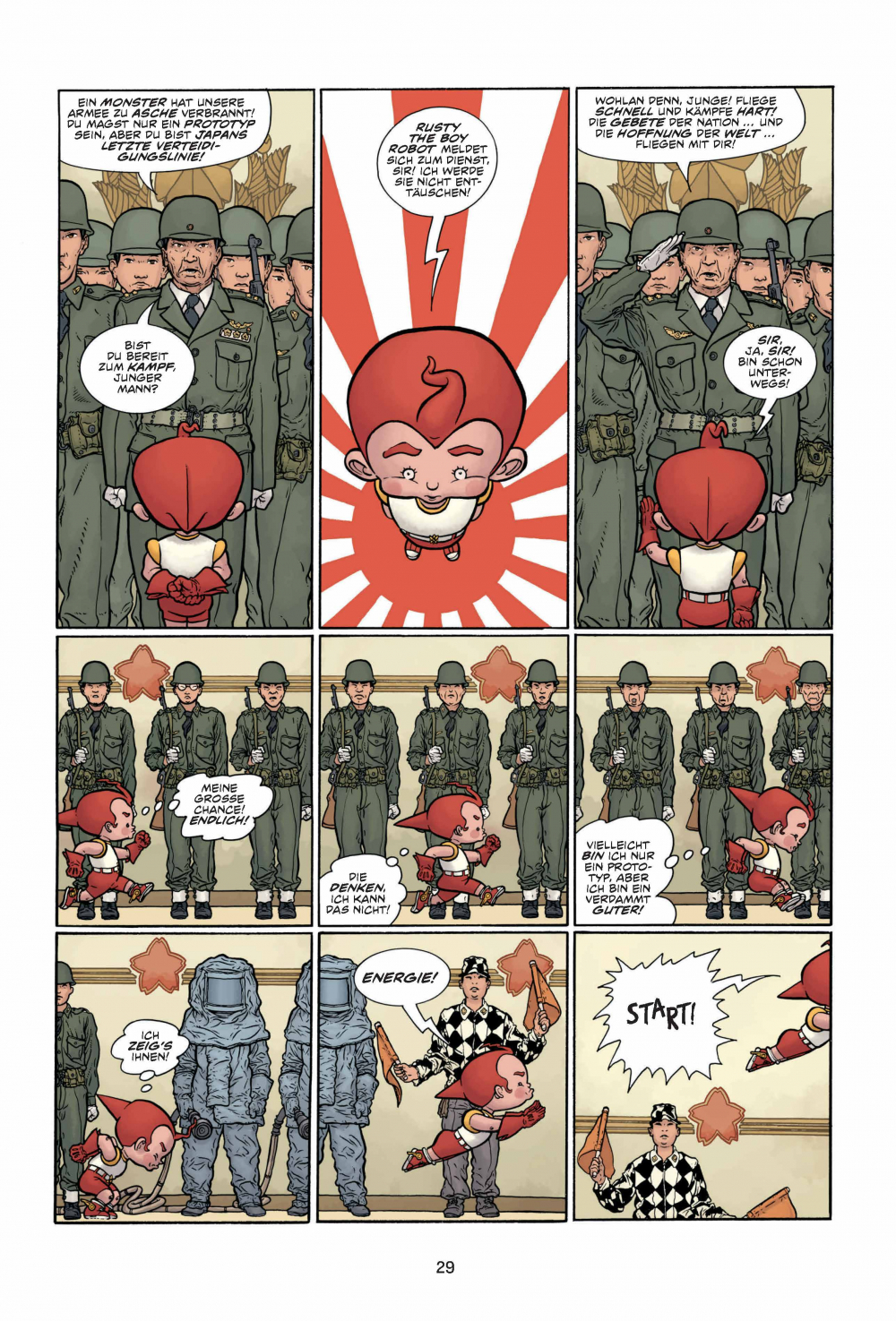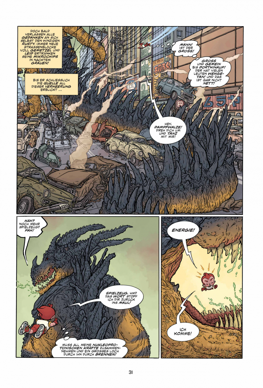 Achtung, Comic-Freunde, hier spielt die Musik! Hier kommen Action und Abenteuer, hier kommen THE BIG GUY AND RUSTY THE BOY ROBOT! Macht euch bereit für eine Achterbahnfahrt durch die Köpfe von Frank Miller und Geoff Darrow, jenen Comic-Titanen, die euch bereits mit HARD BOILED knallhart den Wahnsinn getrieben haben! Egal ob junger Wilder oder junggebliebener Monsterfilm-Freak: THE BIG GUY AND RUSTY THE BOY ROBOT bringt deine Schaltkreise zum Glühen und zeigt dir alles, was du immer in einem Comic sehen wolltest ... und zwar in GROSSAUFNAHME!