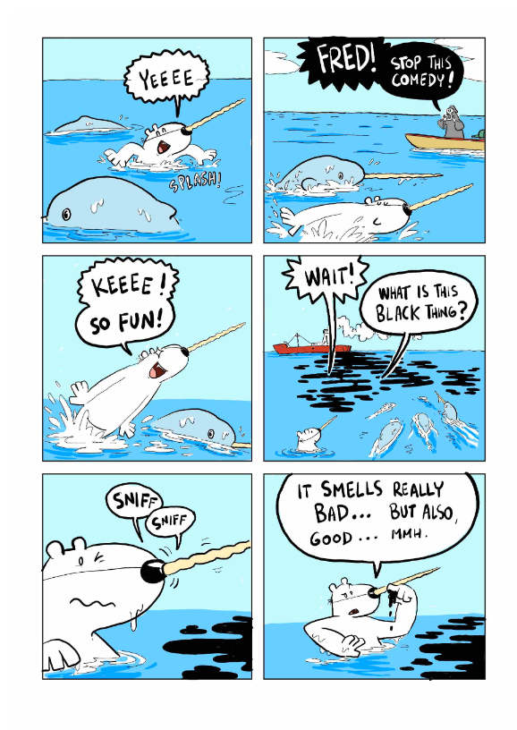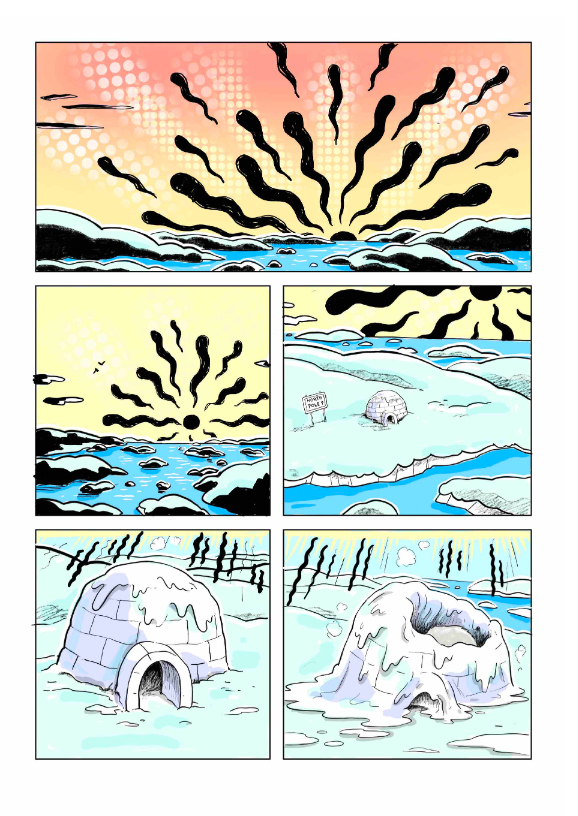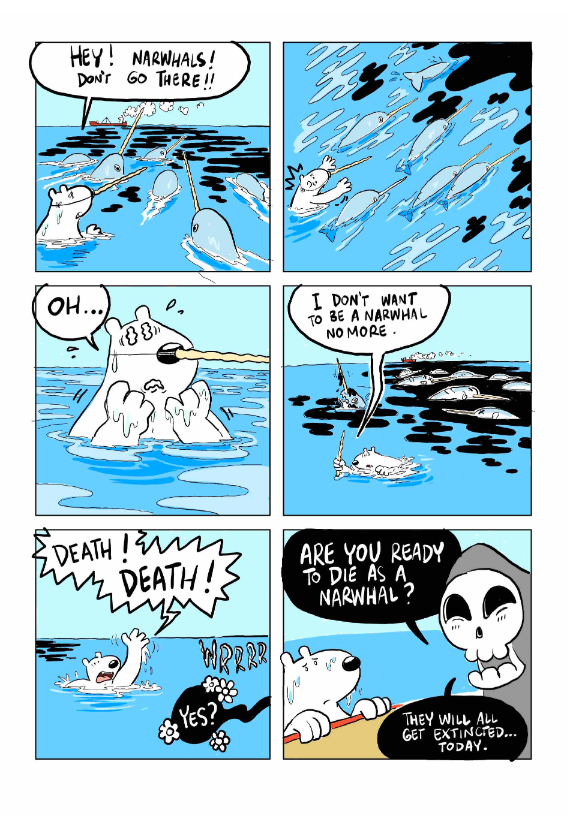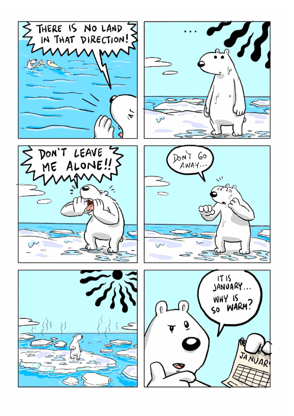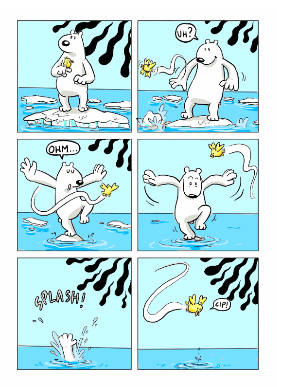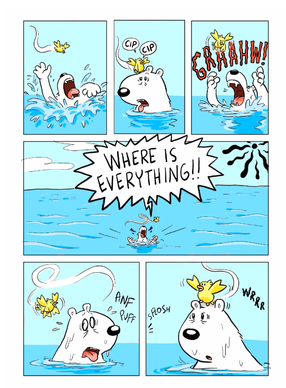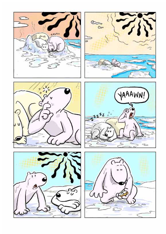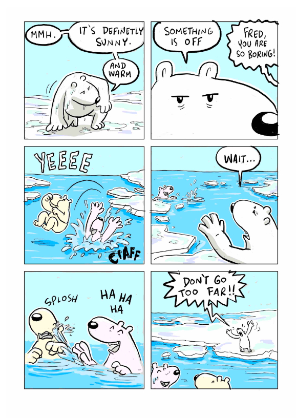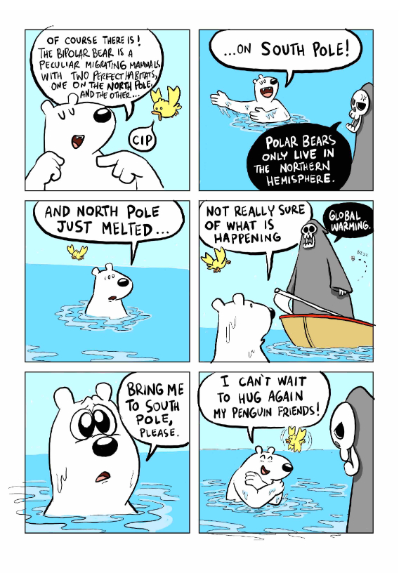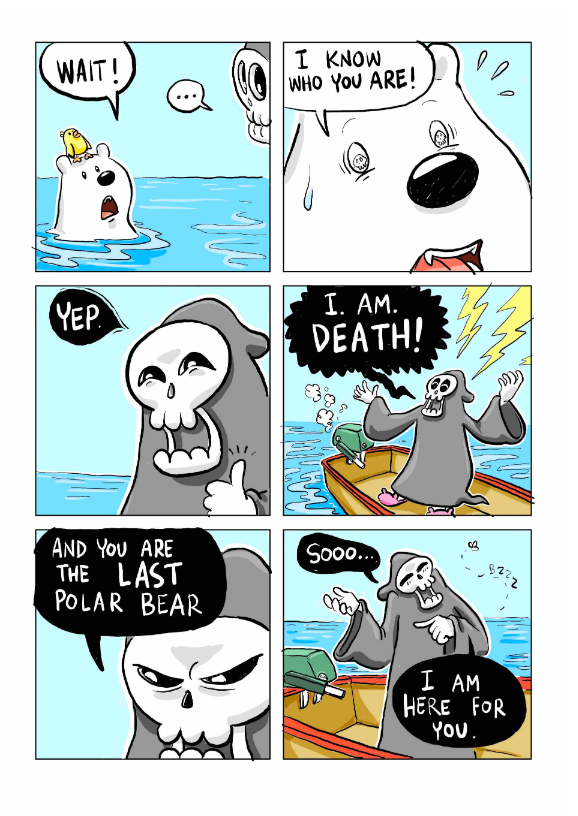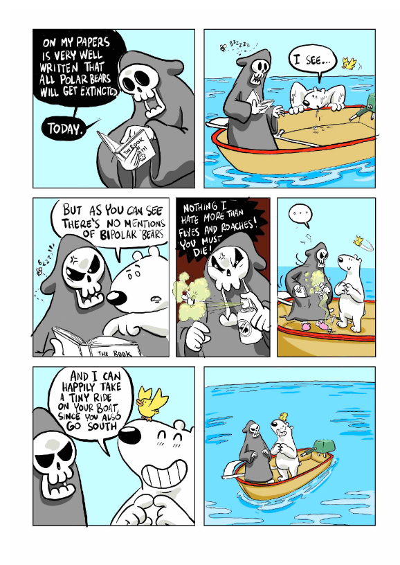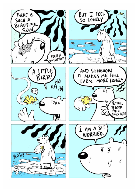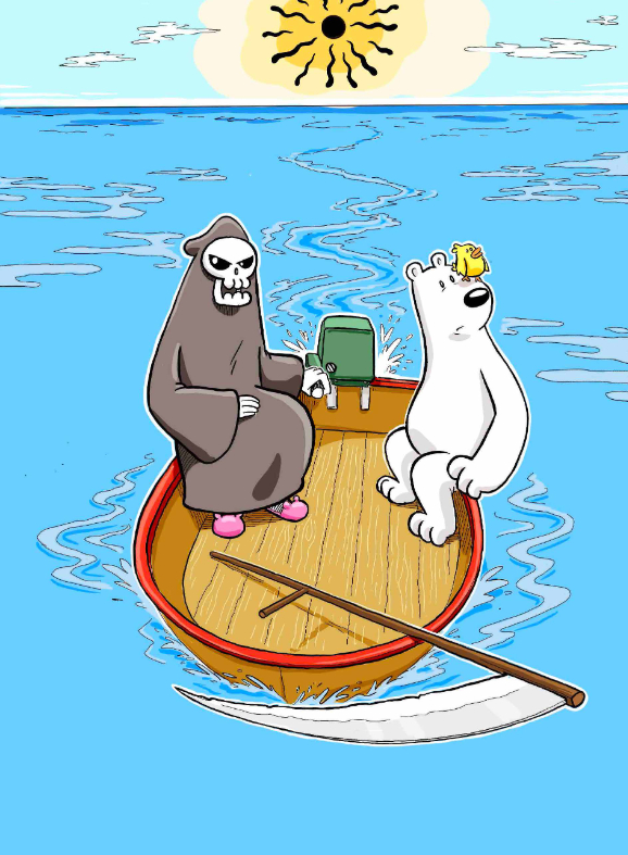 Dies ist der Plot: Die Eisbären wachen schon Anfang Januar auf, das Eis schmilzt um sie herum und zuletzt auch die Scholle unter dem Protagonisten „Bipolarbär“. Der personifzierte Tod kommt per Motorboot angetuckert, um ihn abzuholen. Die Reise beginnt.