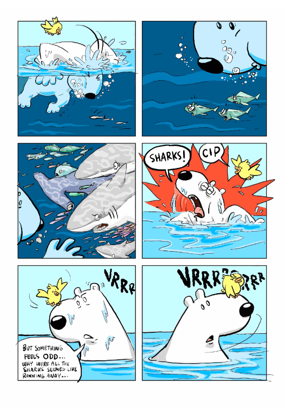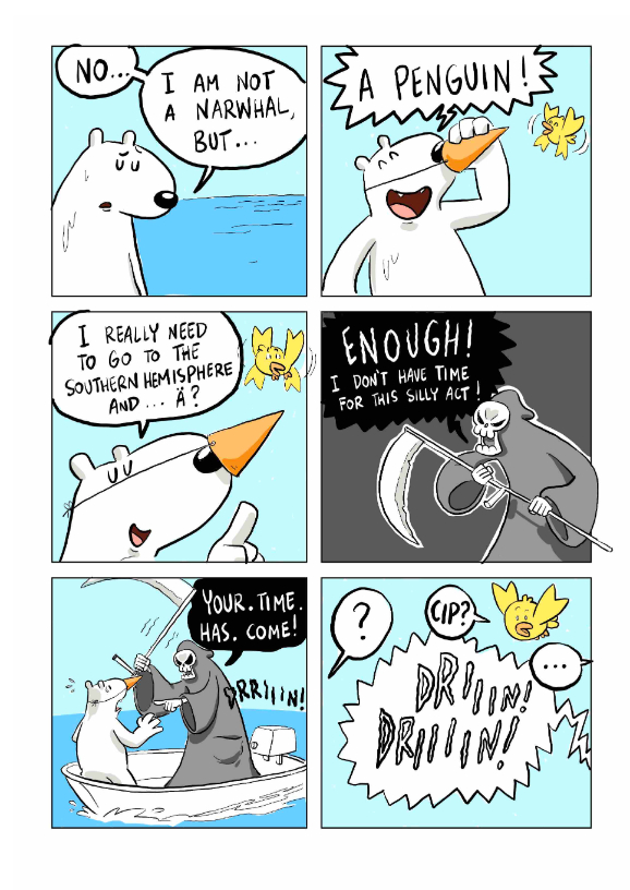 Tod und Bipolarbär haben zwar komplett unterschiedliche Ziele, aber mehr oder weniger stetig geht es Richtung Südpol, wo Bipolarbär hofft, auf Artgenossen oder neue Freunde zu stoßen.