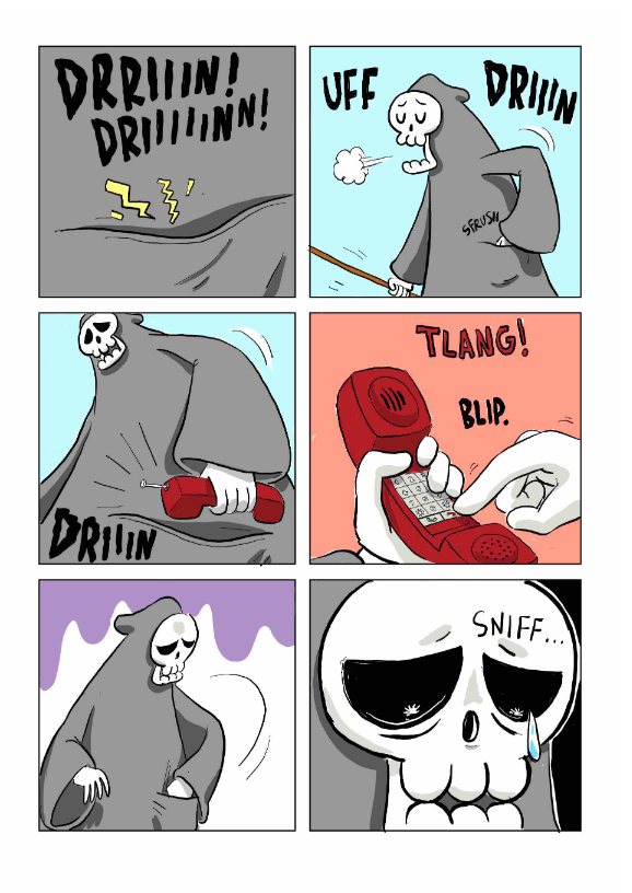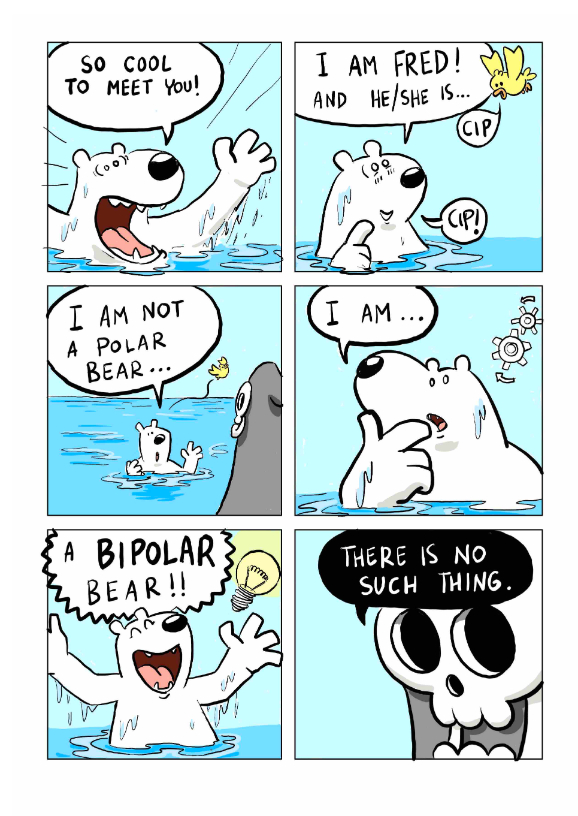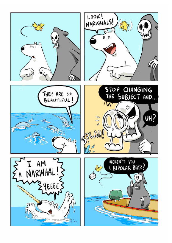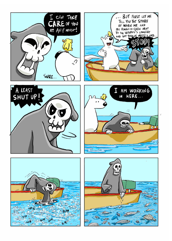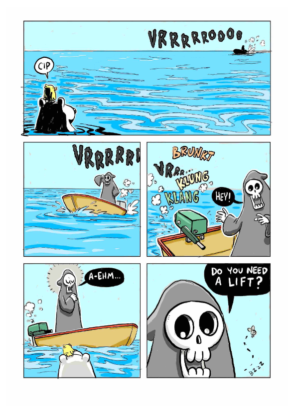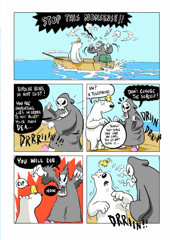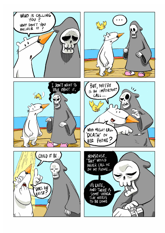 Auch das versucht Bipolar Bär ihm auszureden. Er könne ja auch mal Pause machen, mal was andres machen, sich ein Sabbatical nehmen zum Beispiel. Und der Tod ist ja selbst nicht ganz unbefangen, was das Thema Tod betrifft...