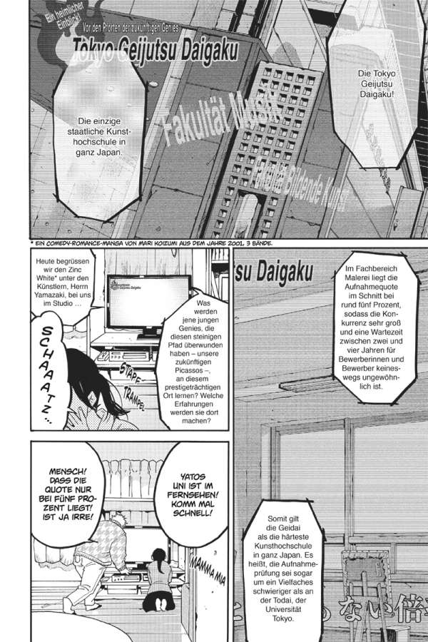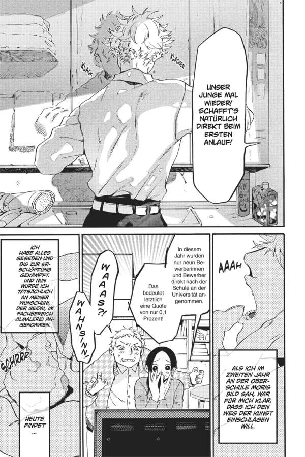 Sieh die Welt mit neuen Augen! Yataro Yaguchi hat gute Noten – aber keine Leidenschaft. Er trinkt, raucht und treibt sich bis nachts in der Stadt herum. Aber glücklich macht ihn das nicht. Und nun, kurz vor dem Schulabschluss, muss er sich fragen, ob das wirklich alles ist, was er vom Leben zu erwarten hat. Da kommt er durch einen Zufall mit der Malerei in Kontakt – und plötzlich sieht er die Welt mit anderen Augen. Ohne jede Erfahrung beschließt er, sich für eine Kunstakademie zu bewerben. Doch die Aufnahmeprüfung ist hart … und ihm bleibt nicht mehr viel Zeit!