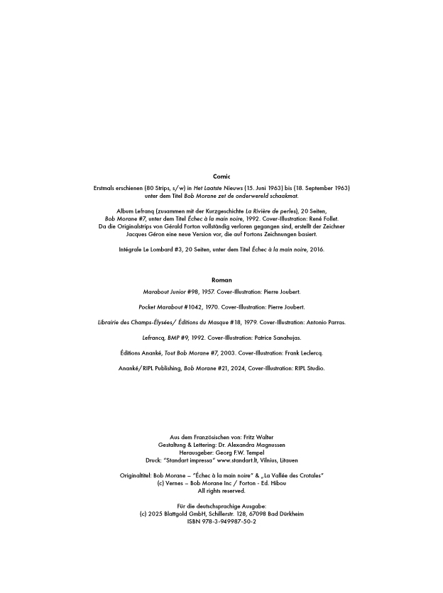 Der Band enthält die beiden Abenteuer La vallée des crotales (Das Tal der Klapperschlangen) und Échec à la main noire (Schach der Schwarzen Hand), beide aus dem Jahr 1963. Letzteres wurde wegen verschollener Vorlagen von Jacques Géron (Yalek) in Fortons Stil neu gestaltet.