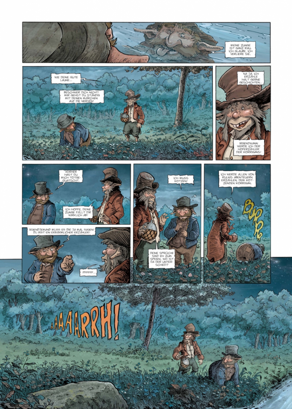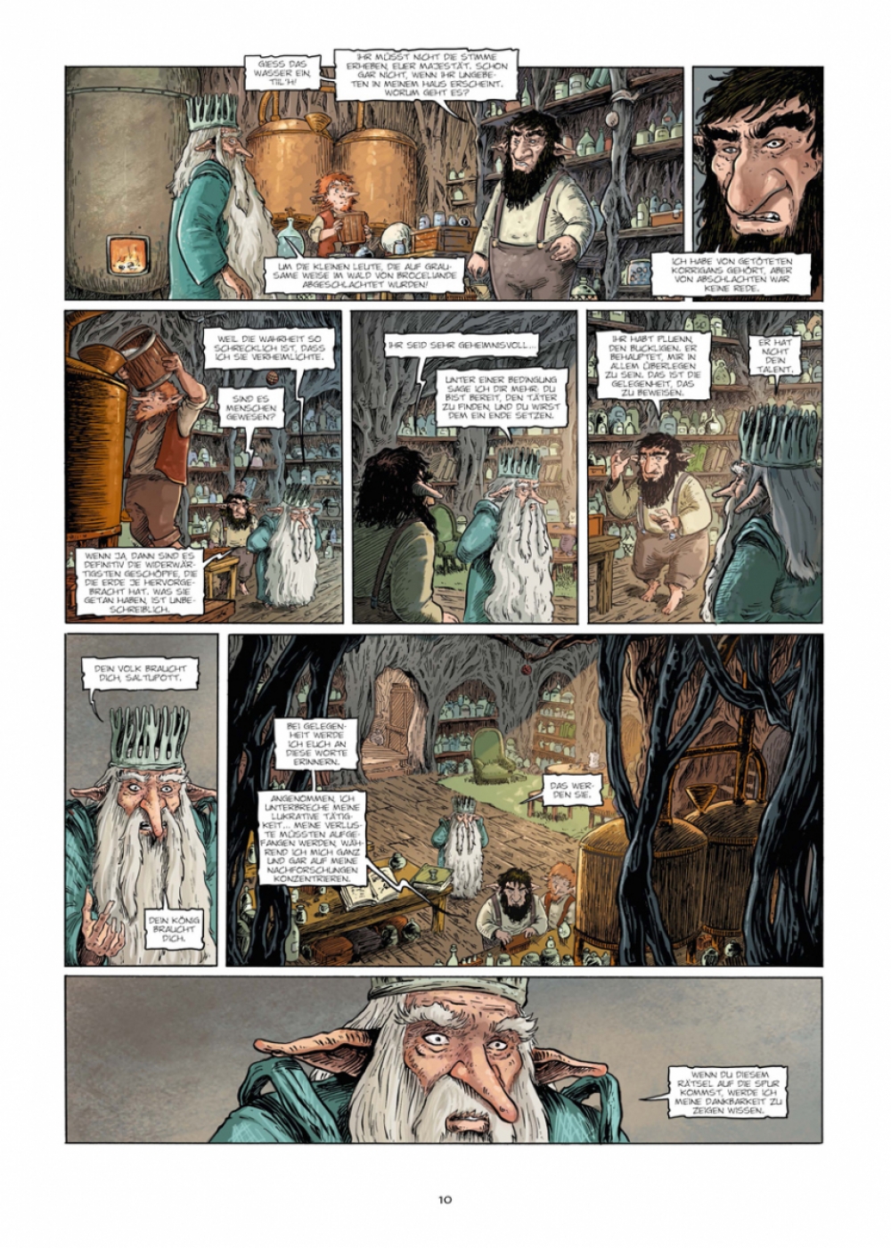 Die Angst geht um in Broceliande. Irgendwas oder -wer tötet Korrigans. Kor’net, ihr König, lässt darum seinen Vetter Saltupott rufen, der so gewieft ist wie geldgierig, damit dieser die Ursache findet. Mit seinem Gehilfen Tiil’h bricht Saltupott zum Tatort auf und stößt dort auf nichts als Verwüstung. Nicht nur, dass es Tote gegeben hat, auch die Natur selbst ist abgestorben – als ob etwas ihre Lebenskraft aufgesaugt hätte. Als würde das, was seine Mitbrüder umbringt, auch die ganze Umgebung »verbrennen«... Ein modernes Comic-Märchen voller Magie, Feen und Kobolden, in dem bekannte Charaktere der Arthussagen neue Rollen einnehmen. »Brocéliande« gibt dem Sehnsuchtsort Wald einen mythologischen Anstrich, gespickt mit reichlich Action und Humor und präsentiert in zauberhaften Zeichnungen.