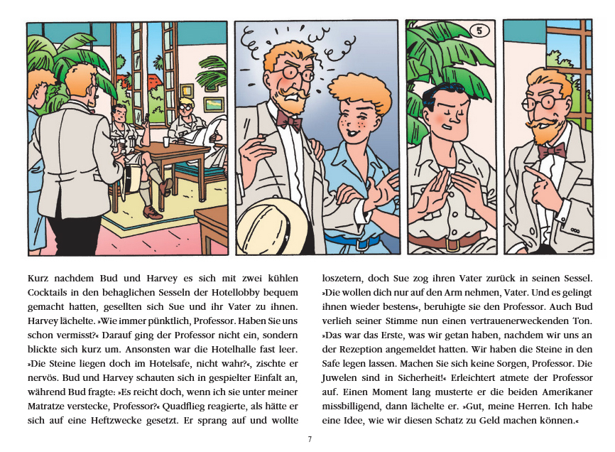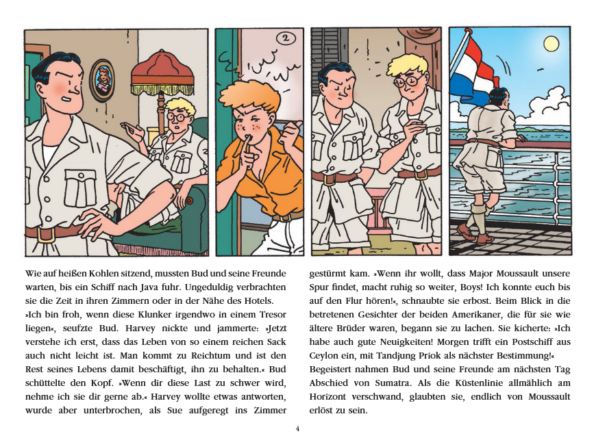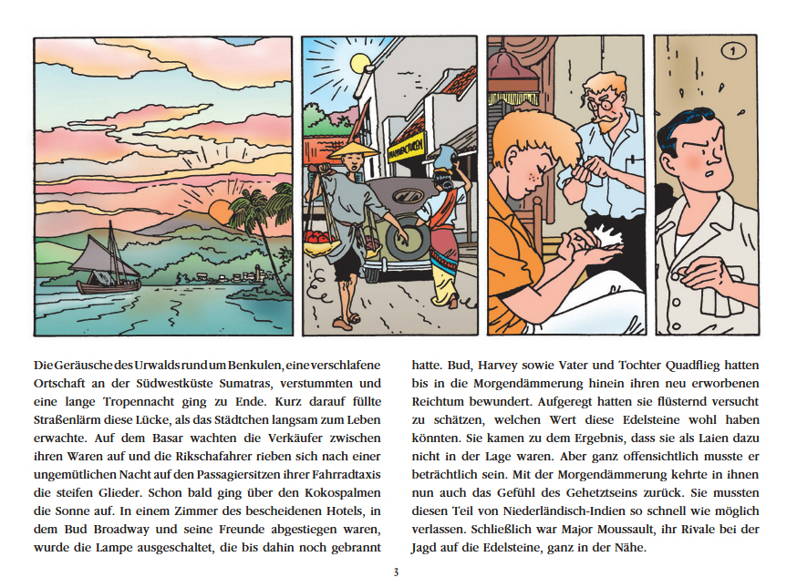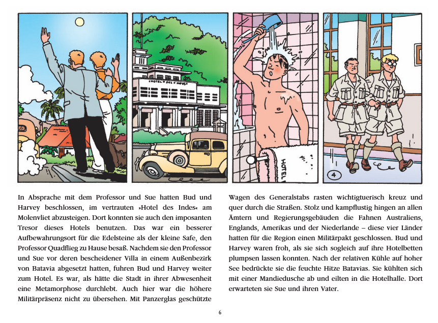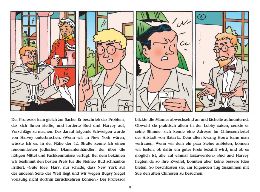 Bud und seine Freunde suchen kurzfristig nach einem Weg, Raffles’ Juwelen zu Geld zu machen. Als Bud die Edelsteine in einer Vorstadt von Batavia bei einem chinesischen Juwelier schätzen lassen möchte, wird er von der chinesischen Triade entführt. Bei seiner Flucht hilft ihm ein asiatisches Mädchen, das er gleich unter seine Fittiche nimmt. Kurz darauf reisen Sue und Harvey in die Vereinigten Staaten, um mit einem jüdischen Diamantenhändler Kontakt aufzunehmen. Unterdessen trifft Bud seinen alten Freund Lewis und fährt mit ihm nach Borneo.