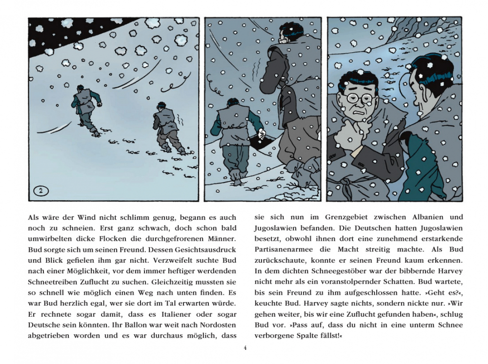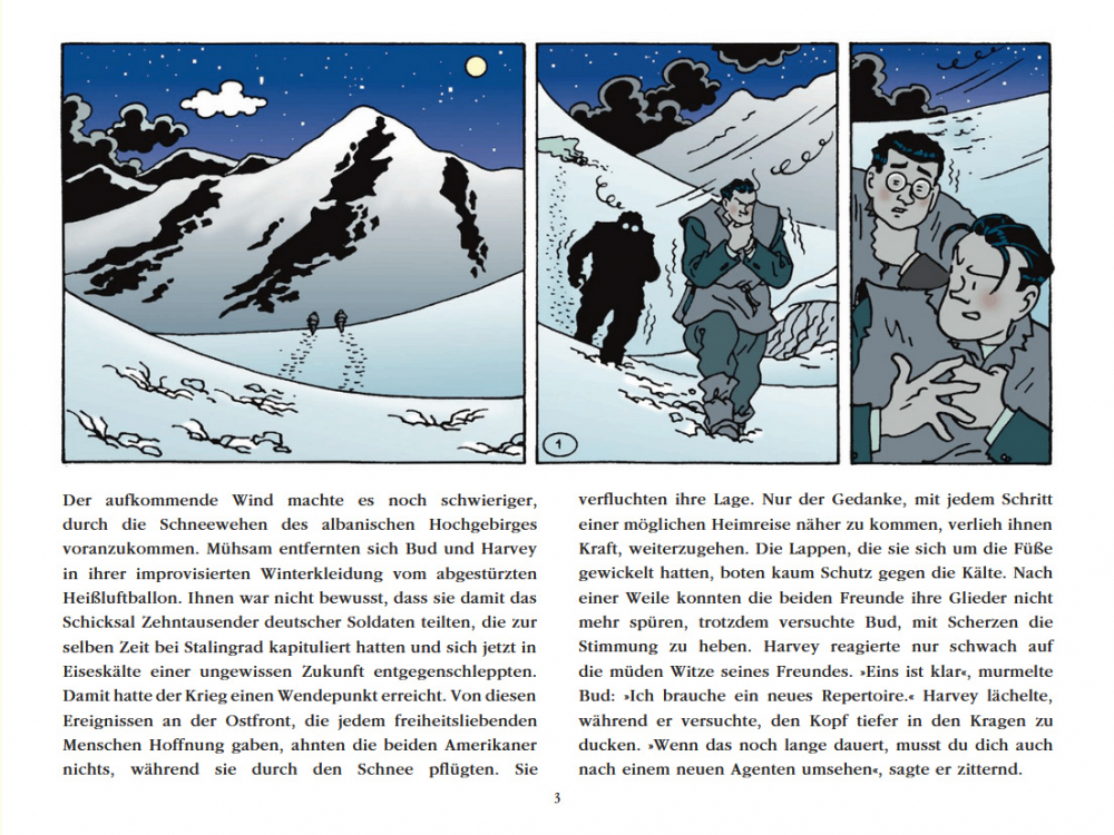 Aus der Feder von Eric Heuvel stammt auch dieser achte Integralband des Abenteuerstrips Bud Broadway, in dem nach klassischem niederländischem Muster der Text unter den Zeichnungen angebracht wurde. Nach den Ereignissen um Mussolinis Doppelgänger finden sich Bud und sein Freund Harvey in den albanischen Alpen wieder. Dort treffen sie auf eine Gruppe Partisanen, an deren Seite Bud in eine mittelalterliche Burg eindringt, um einen hochrangigen SS-Mann zu neutralisieren.