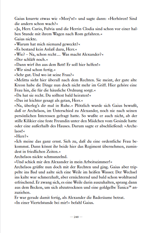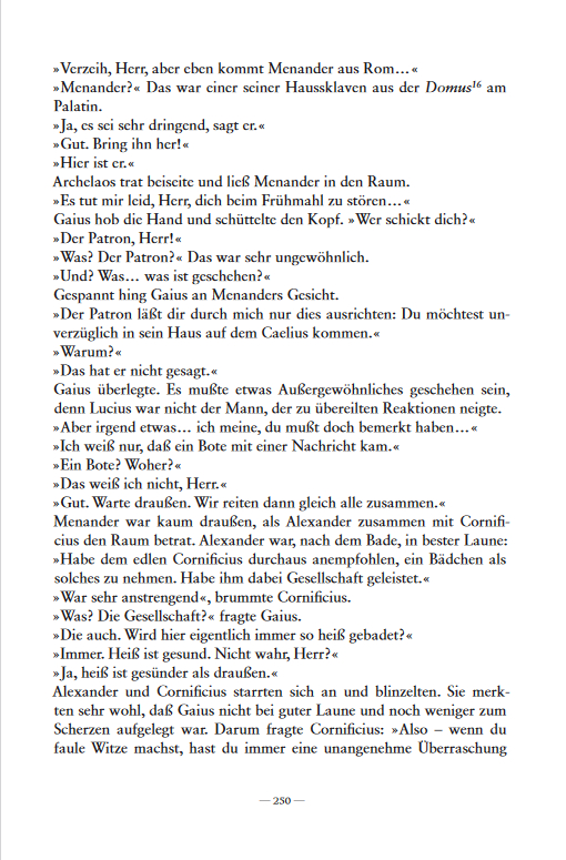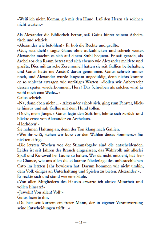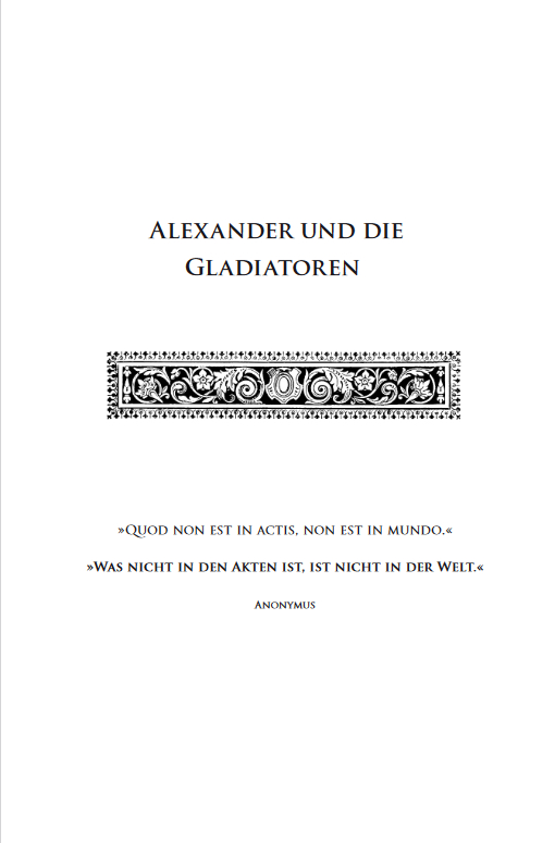 Mai 51 v. Chr.: Gaius Volcatius Tullus plant im Rahmen seiner Kandidatur zum Aedilen Gladiatorenkämpfe und beauftragt Alexander - seit einigen Wochen ein freier Mann - mit der Organisation. Alexander lernt bei seinen Bemühungen auch zwei junge reiche Kaufleute aus Gallien kennen. In ihrer Herberge kommt es zu einer fatalen Entdeckung und schon bald steht Alexander im Mittelpunkt dramatischer Ereignisse, die auch C.V.T.s Interesse wecken...