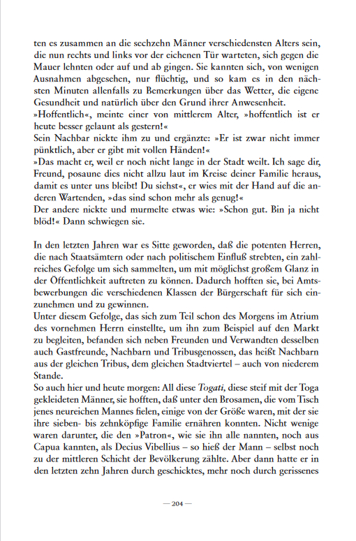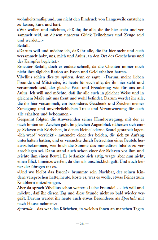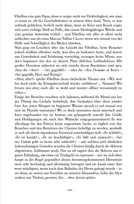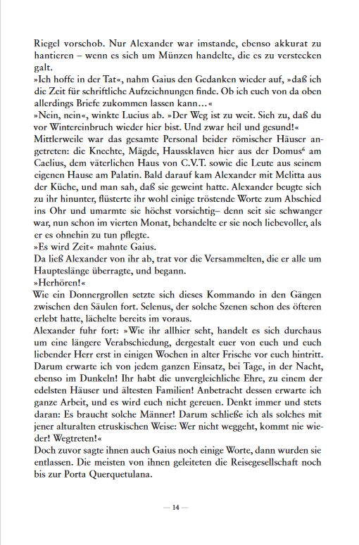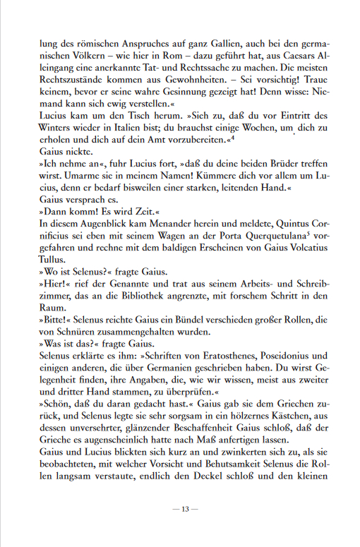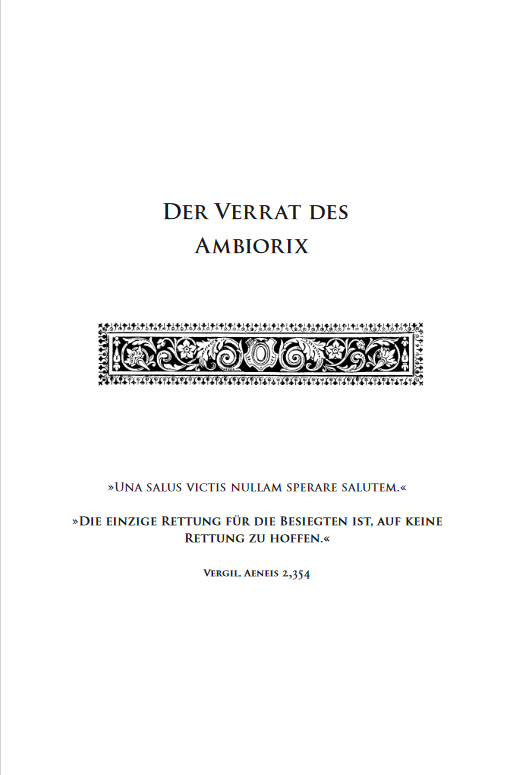 Gerade aus Pompeii zurück, findet C.V.T. ein Schreiben aus Gallien vor, das seinen sofortigen Aufbruch nach Norden, in Caesars Hauptquartier bei Narbo (Narbonne) notwendig macht: Er soll in Gesprächen mit den rechtsrheinischen, romfreundlichen Ubiern ihre Umsiedlung auf linksrheinisches Gebiet vorbereiten. Und er soll etwas über das Versteck und die Pläne des letzten großen Gegners Caesars in Erfahrung bringen: Ambiorix, Fürst der Eburonen. An der Stelle der späteren Colonia Claudia Ara Agrippinensium (Köln) geht C.V.T. mit Cornificius, Alexander und zwanzig Reitern über den Rhein und betritt gefährlichen Boden: Germanien…