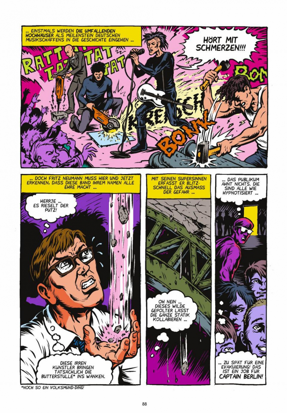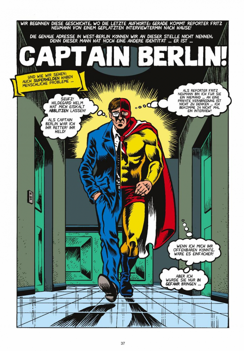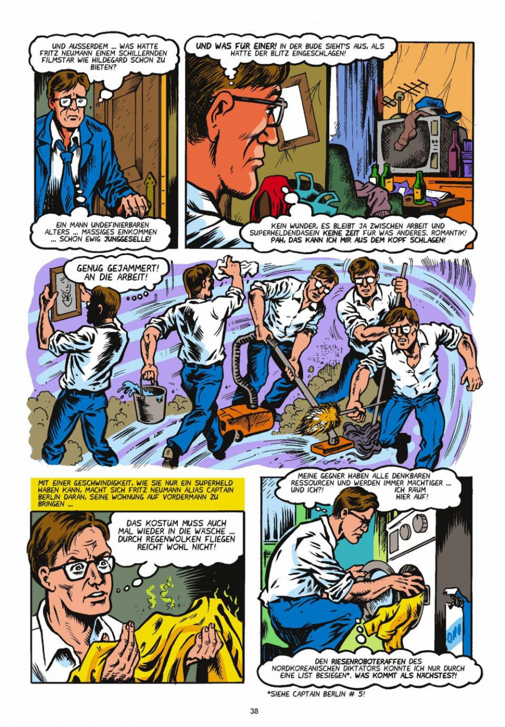 Wieder bekommt es Captain Berlin mit den unglaublichsten Bösewichten der Zeitgeschichte und anderen Supergegnern zu tun: Der nordkoreanische Diktator Kim Jong-il mit seinem Riesen-Gorilla-Robo Kim Kong, DDR-Oberhaupt Erich Honecker und sein linientreuer Ost-Superheld Genosse Berlin, der horrible VHS-Mann mit seinem hirnzersetzenden Videodrom-Strahler, Altnazi Otto Todt und die East-Side-Zombies aus Tschernobyl, Hollywoods einfältiger Superheld Einhorn mit dem Bilderheft des Todes und natürlich Captain Berlins Erzfeindin, die teuflische Femme Fatale Ilse von Blitzen, sie alle machen dem Helden der Hauptstadt in diesem 132 Seiten starken Brocken das Leben schwer!