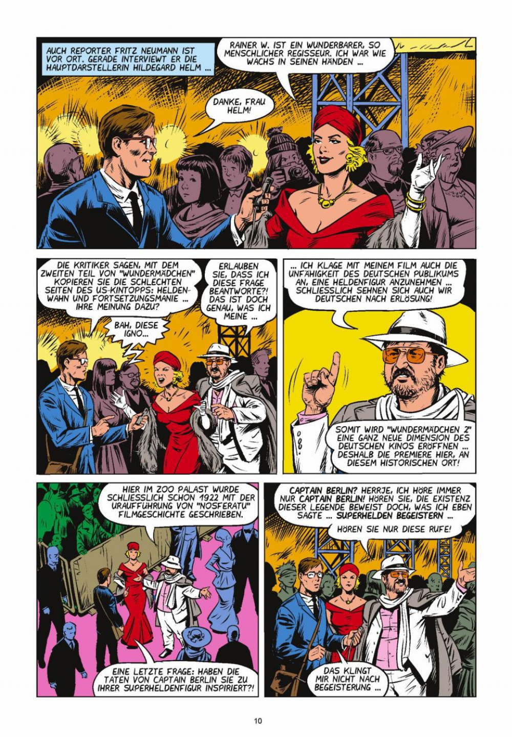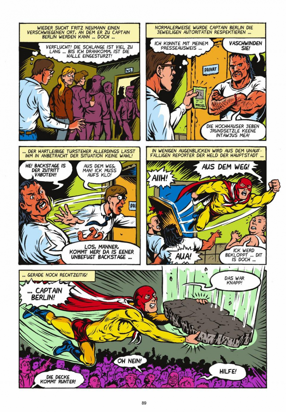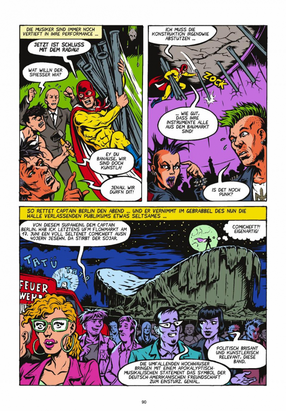 Wieder bekommt es Captain Berlin mit den unglaublichsten Bösewichten der Zeitgeschichte und anderen Supergegnern zu tun: Der nordkoreanische Diktator Kim Jong-il mit seinem Riesen-Gorilla-Robo Kim Kong, DDR-Oberhaupt Erich Honecker und sein linientreuer Ost-Superheld Genosse Berlin, der horrible VHS-Mann mit seinem hirnzersetzenden Videodrom-Strahler, Altnazi Otto Todt und die East-Side-Zombies aus Tschernobyl, Hollywoods einfältiger Superheld Einhorn mit dem Bilderheft des Todes und natürlich Captain Berlins Erzfeindin, die teuflische Femme Fatale Ilse von Blitzen, sie alle machen dem Helden der Hauptstadt in diesem 132 Seiten starken Brocken das Leben schwer!