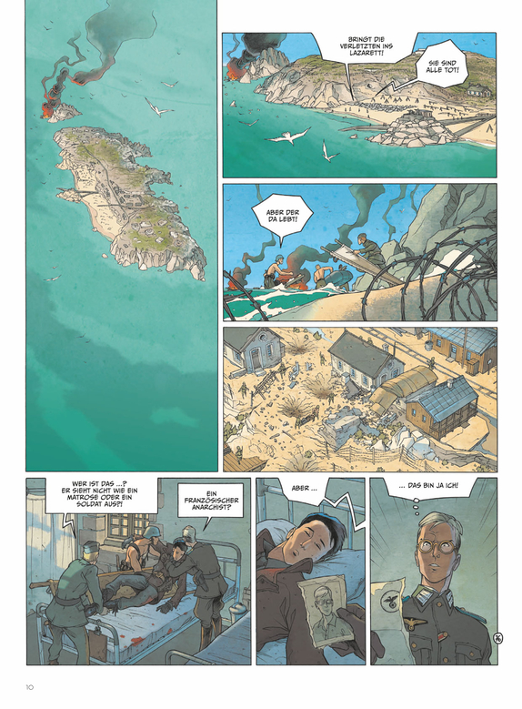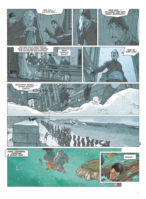 Saint-Malo, August 1944. Die Deutschen widersetzen sich dem Angriff der Amerikaner. Von Cézembre aus verteidigen sie ihre Stellungen und die Insel scheint uneinnehmbar. Die im Fort National gefangenen Malouinen beobachten die Kämpfe aus der Ferne. Ewan verzweifelt bei dem Gedanken daran, dass Françoise im Kampf um die Rückeroberung der Stadt gefallen sein könnte. Er beschließt, zum Festland zu schwimmen, um den Alliierten die Nachricht des Widerstands zu bringen, und um nach Françoise zu suchen … Françoise ihrerseits landet gegen ihren Willen auf Cézembre, entführt von dem Verräter Bastien. Sie fi ndet eine Garnison vor, die auf Befehl eines Soldaten, der davon überzeugt ist, dass das Dritte Reich sie retten wird, in die Enge getrieben wurde … Neben der minutiösen Rekonstruktion einer von Feuer und Stahl zerstörten Stadt, stellt Nicolas Malfi n feinfühlig und präzise die Situation der Menschen in Kriegszeiten dar. Er ist sowohl Drehbuchautor als auch Zeichner und beweist mit dem Ende dieser historischen Tragödie, dass er auch romantisch sein kann.