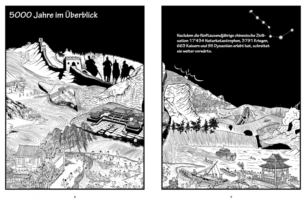 Der Autor Jing Liu entwirft in seiner auf vier Bände angelegten historischen Comic-Reihe einen Überblick über 5000 Jahre der chinesischen Geschichte von den Anfängen der halblegendären Shang-Dynastie (circa 3000 v. Chr.) bis zum Ende der Qing-Dynastie mit der Abdankung des letzten Kaisers (1912).