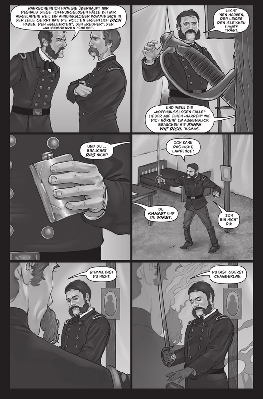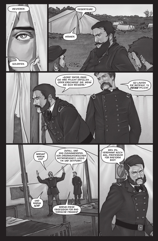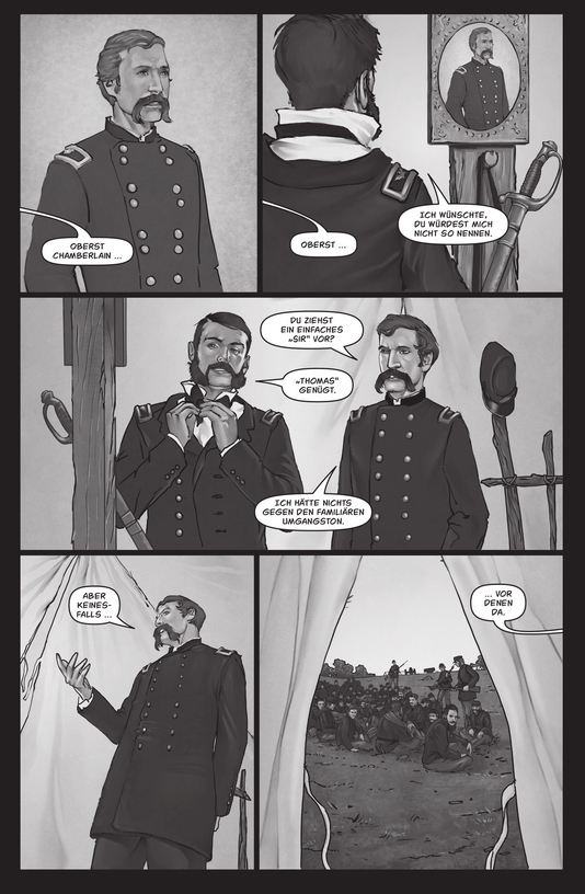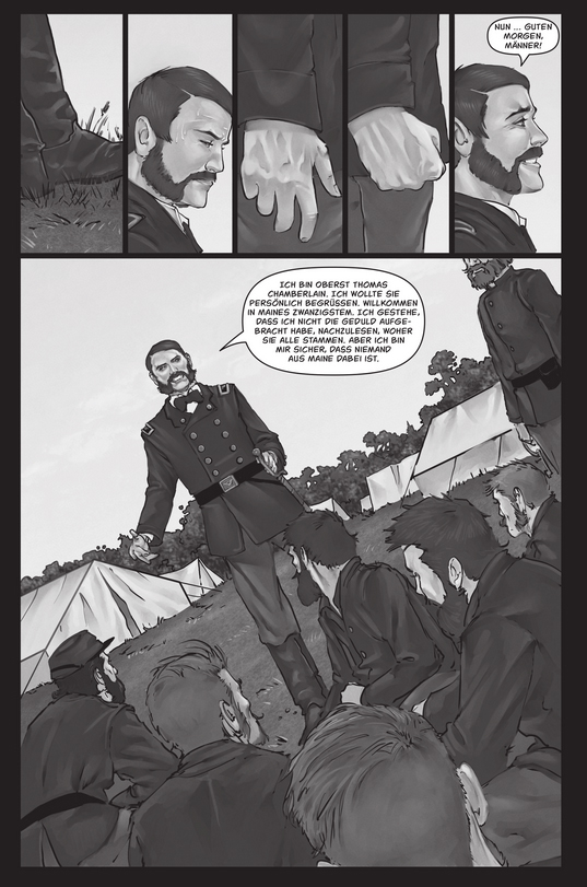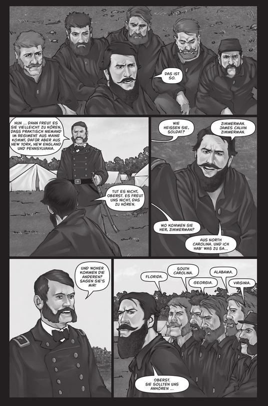 Hier ist etwas für die Freunde und Freundinnen von Kriegsfilmen und Historienschinken. Max Brooks (Saturday Night Live, The Zombie Survival Guide) und seine beiden Zeichner, Michael DiPascale (Hero Worship, Rover Red Charlie) und Gabriel Andrade (Crossed, Über) führen uns in die Zeit des amerikanischen Bürgerkriegs (1861-1865), eine Zeit „großer“ Schlachten und größeren Schlachtens. Sie war geprägt von technischen „Innovationen“, die bereits die Grauen der totalen Kriege des 20. Jahrhunderts ankündigten. „Ein vervollkommneter Bund“, wie A More Perfect Union übersetzt lauten müsste, ist ein Zitat aus der nur aus einem Satz bestehenden Präambel der Verfassung der Vereinigten Staaten von Amerika, in der die Gründe für den Zusammschluss der Bürgerinnen und Bürger der Einzelstaaten zu einem Staatenbund benannt werden, darunter die gemeinsame Landesverteidigung. So kämpfen denn im alternativen Universum von A More Perfect Union nicht Nord- gegen Südstaatler, Weiße gegen Schwarze, Frauen gegen Männer oder Amerikaner gegen den Rest der Welt, sondern alle zusammen gegen … eine mörderische Ameisenarmee!