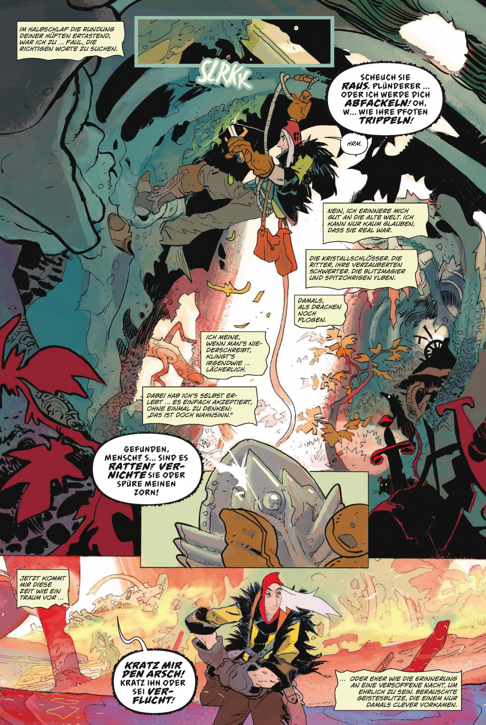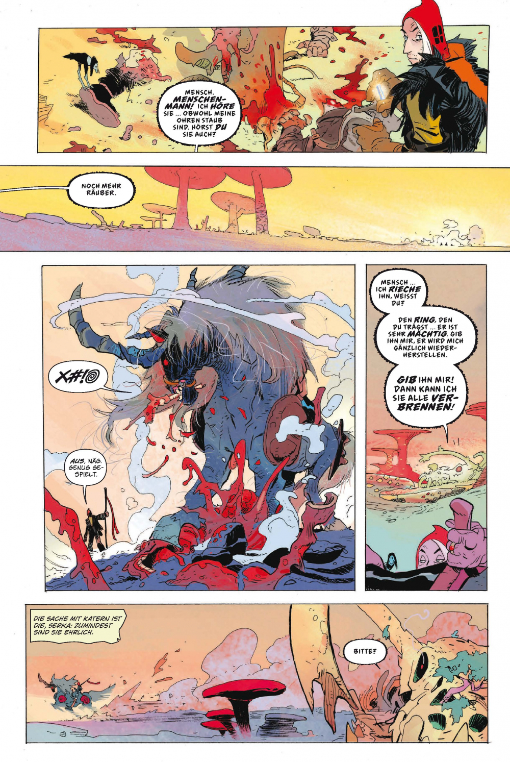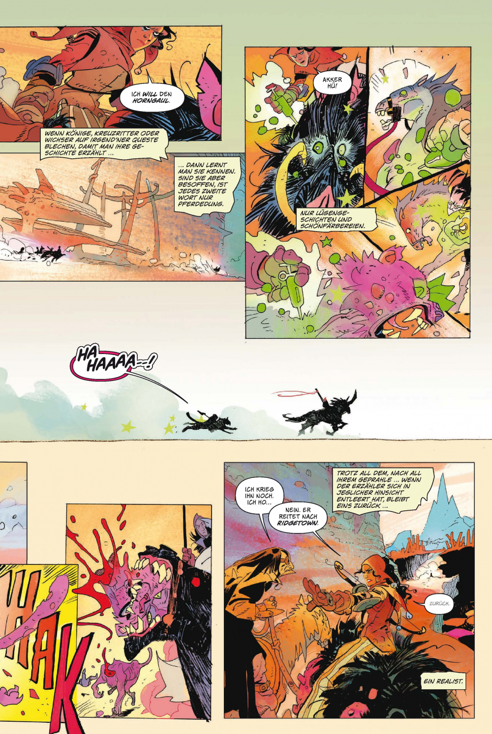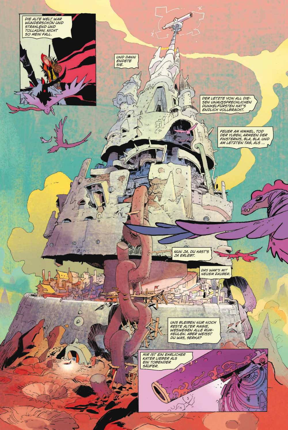 Inmitten der Folgen einer Apokalypse, die fast alle Magie aus einer einst so wundersamen Fantasiewelt ausgelöscht hat, sucht ein einstiger und nun verstummter Barde namens Hum nach einem Weg, die Seele seiner Frau zu retten – mit nichts und niemandem an seiner Seite außer einem übellaunigen, mutierten Einhorn und seinem eigenen Verstand, der seinen Weg leitet. Dabei wird er jedoch ungewollt in einen brutalen Machtkampf hineingezogen, der ein für alle Mal entscheiden soll, wer das düstere Ödland bis ans Ende der Zeit regiert ... Geschrieben von dem für den Eisner Award nominierten Autor Simon Spurrier (The Spire, GODSHAPER) und aufwendig illustriert von dem Künstler Matías Bergara (SUPERGIRL, CANNIBAL), ist Coda ein gnadenloses Kaleidoskop visueller Wunder der postapokalyptischen High-Fantasy, das Leserinnen und Leser durch die Linse eines griesgrämigen Einzelgängers auf der Suche nach seiner verlorenen Liebe betrachten.
