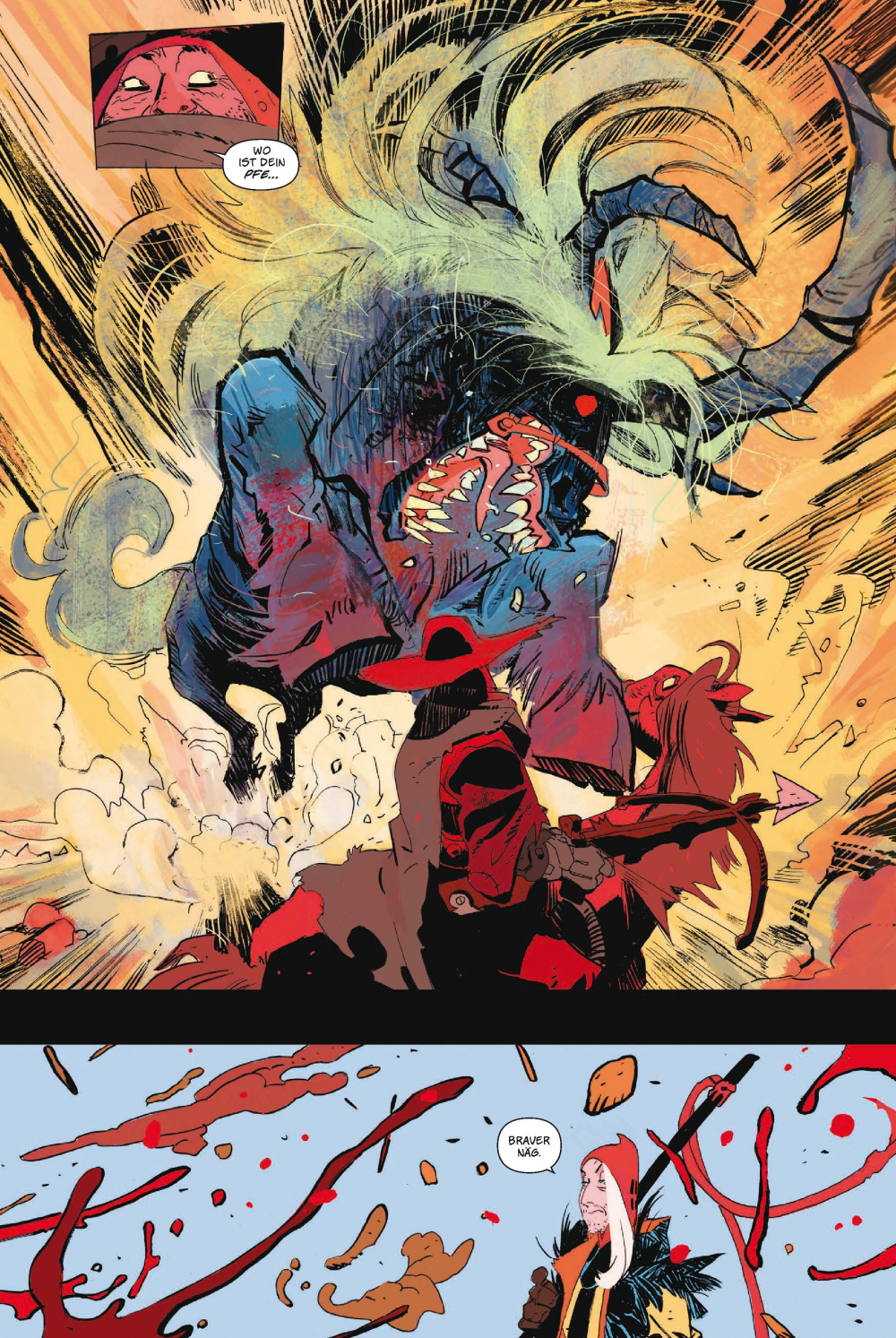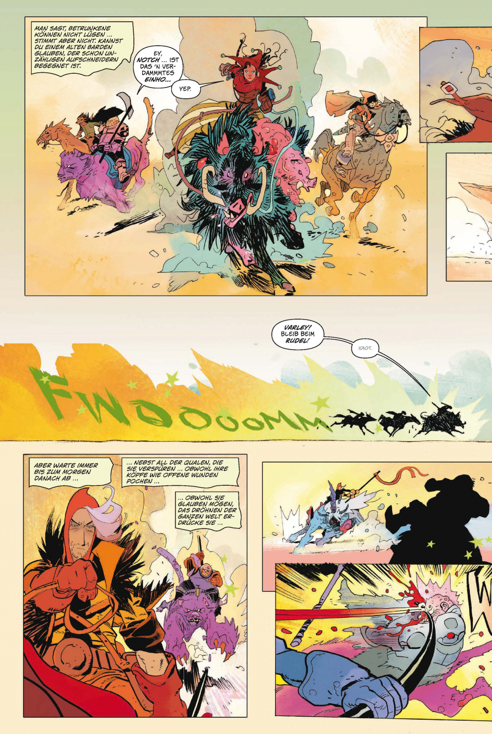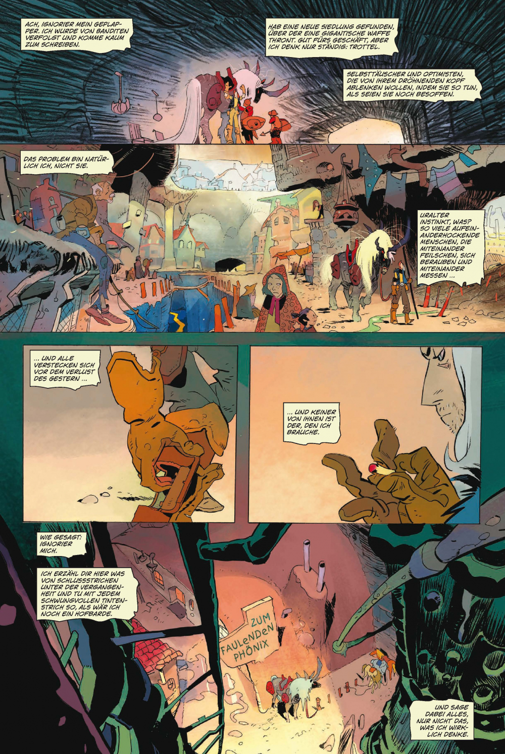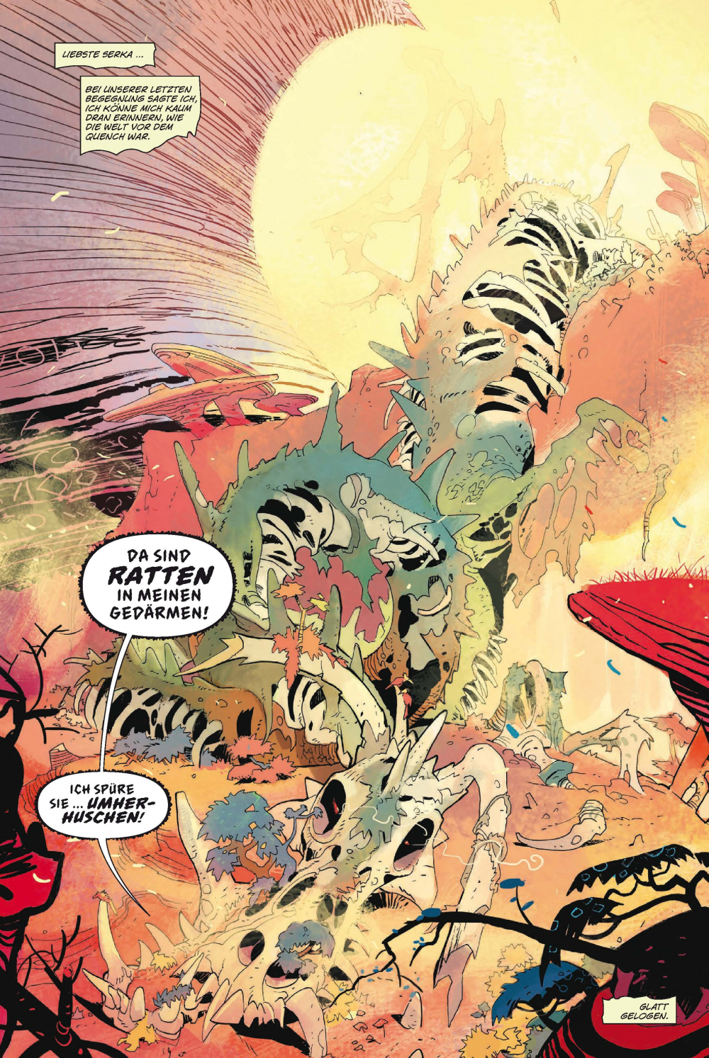 Inmitten der Folgen einer Apokalypse, die fast alle Magie aus einer einst so wundersamen Fantasiewelt ausgelöscht hat, sucht ein einstiger und nun verstummter Barde namens Hum nach einem Weg, die Seele seiner Frau zu retten – mit nichts und niemandem an seiner Seite außer einem übellaunigen, mutierten Einhorn und seinem eigenen Verstand, der seinen Weg leitet. Dabei wird er jedoch ungewollt in einen brutalen Machtkampf hineingezogen, der ein für alle Mal entscheiden soll, wer das düstere Ödland bis ans Ende der Zeit regiert ... Geschrieben von dem für den Eisner Award nominierten Autor Simon Spurrier (The Spire, GODSHAPER) und aufwendig illustriert von dem Künstler Matías Bergara (SUPERGIRL, CANNIBAL), ist Coda ein gnadenloses Kaleidoskop visueller Wunder der postapokalyptischen High-Fantasy, das Leserinnen und Leser durch die Linse eines griesgrämigen Einzelgängers auf der Suche nach seiner verlorenen Liebe betrachten.