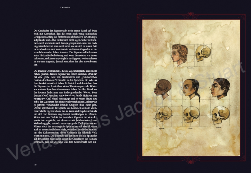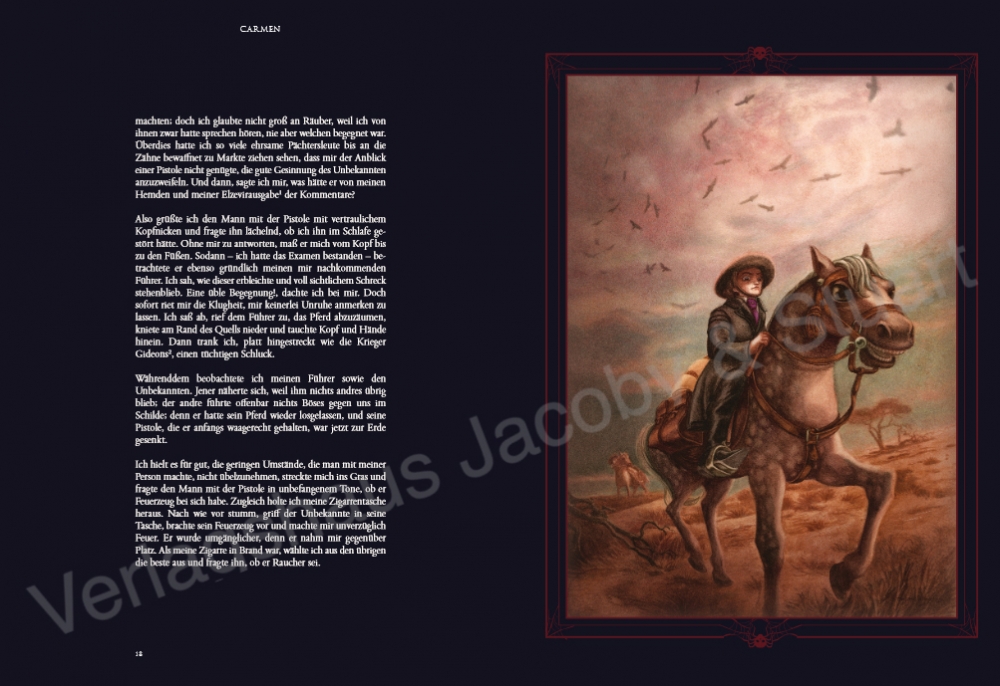 Diese Prachtausgabe von »Carmen« enthält nicht nur Mérimées Novelle mit den großformatigen Bildern von Benjamin Lacombe, sondern auch einen fünfzehn Jahre früher erschienenen sehr ausführlichen Brief des Autors, in dem er sich zum ersten Mal mit dem Carmen-Stoff befasst, sowie einen ausführlichen Anhang mit Erläuterungen, biografischen und bibliografischen Angaben.