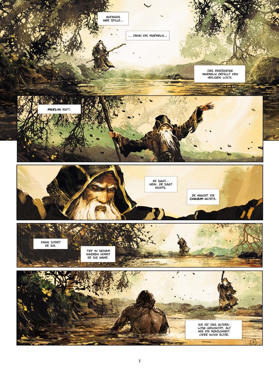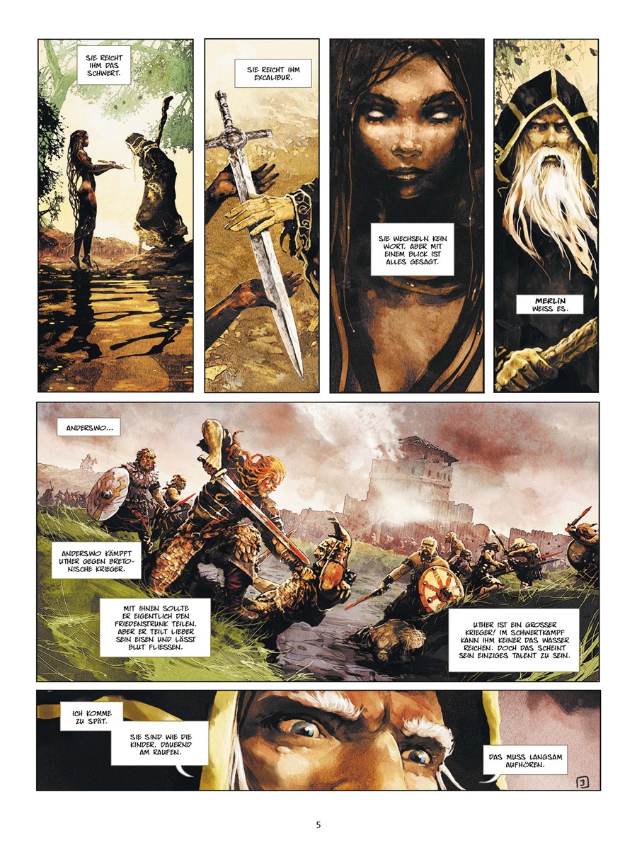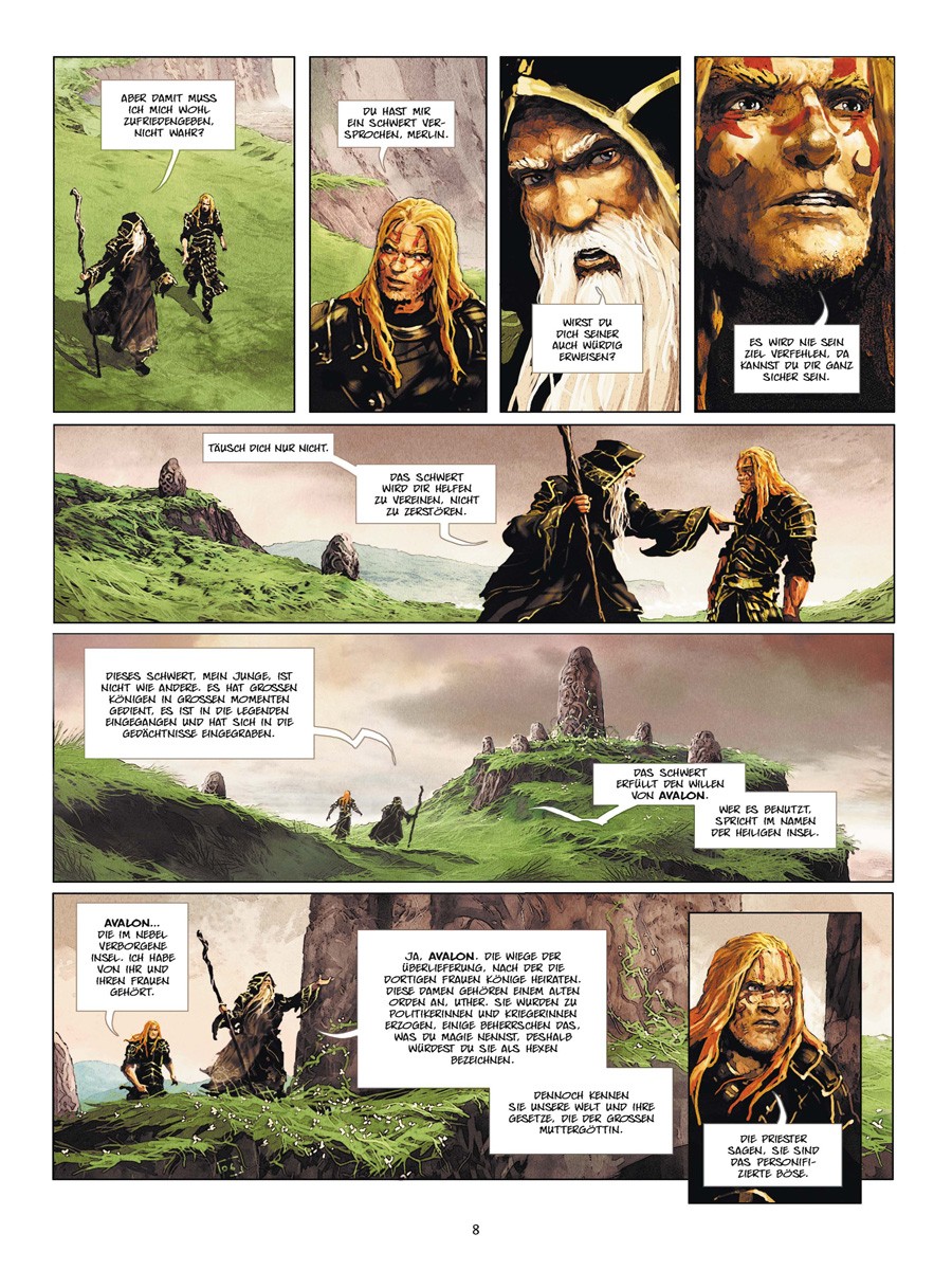 Dieses Schwert ist die Verlängerung des Willens von Avalon. Der, der es führt, spricht im Namen der heiligen Insel. Merlin ein alter seherischer, aber nicht unfehlbarer Druide. Uther Pendragon, ein junger Rohling, der lernt ein wahrer König zu werden. Ygraine, eine Frau, geschlagen für ihre religiösen Überzeugungen. Gorlois, ein perverser Sadist von fanatischer Gottesfurcht und Henker seiner Frau. Und Morgane, ein bezauberndes Kind, das Dinge sieht, die sonst niemand sieht, nicht einmal Merlin. Ein Kind das darunter leidet zu wissen, dass es unweigerlich eines Tages böse sein wird.