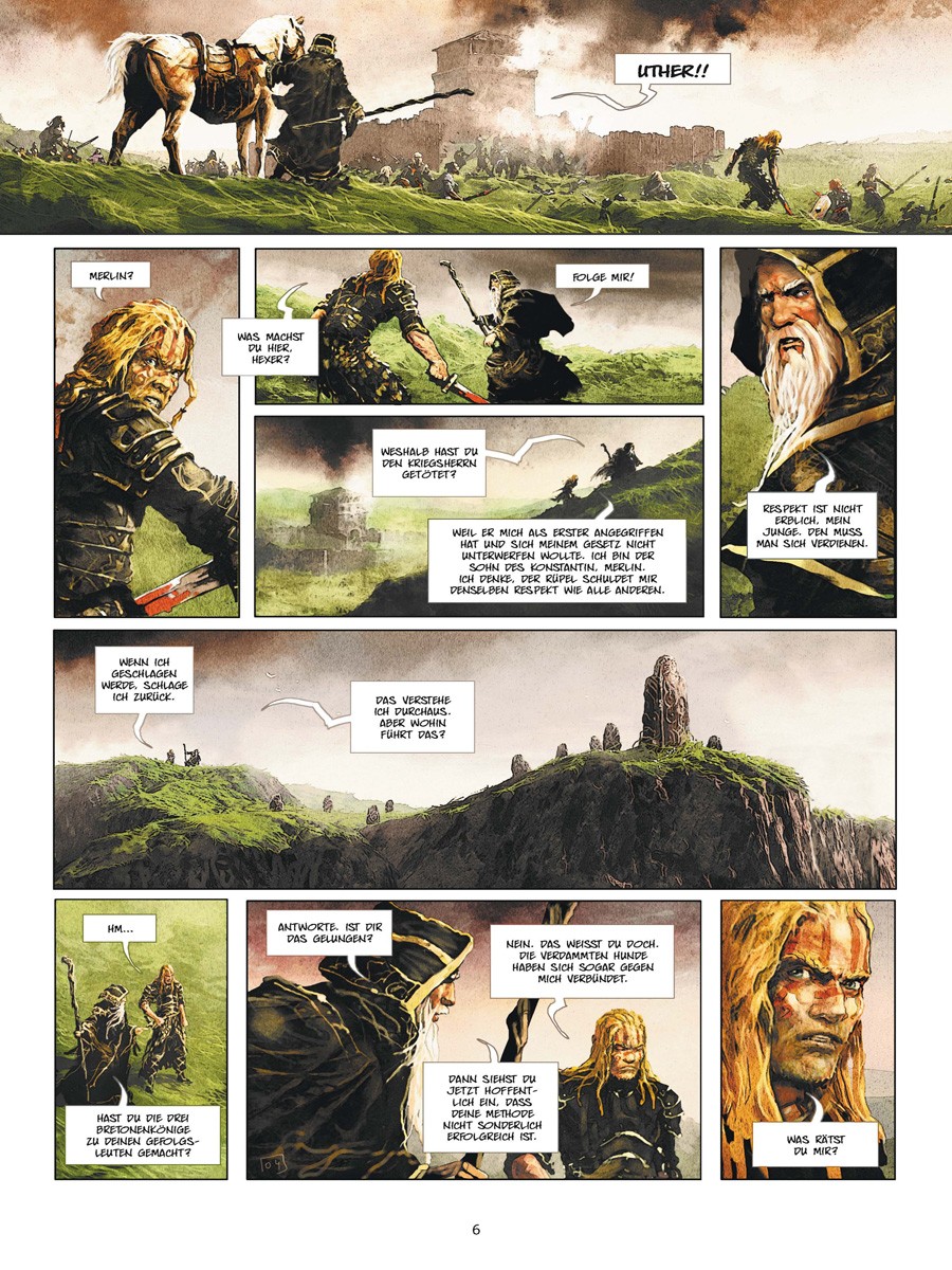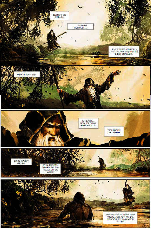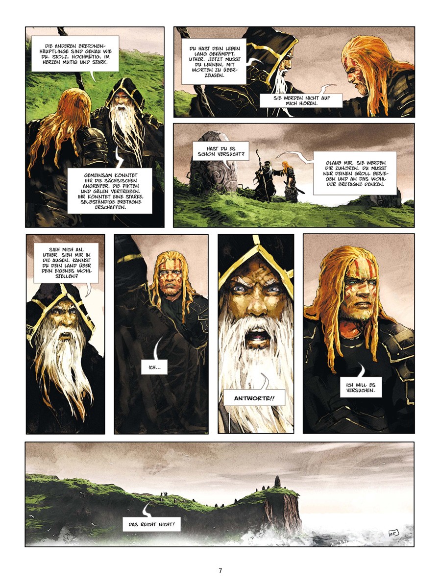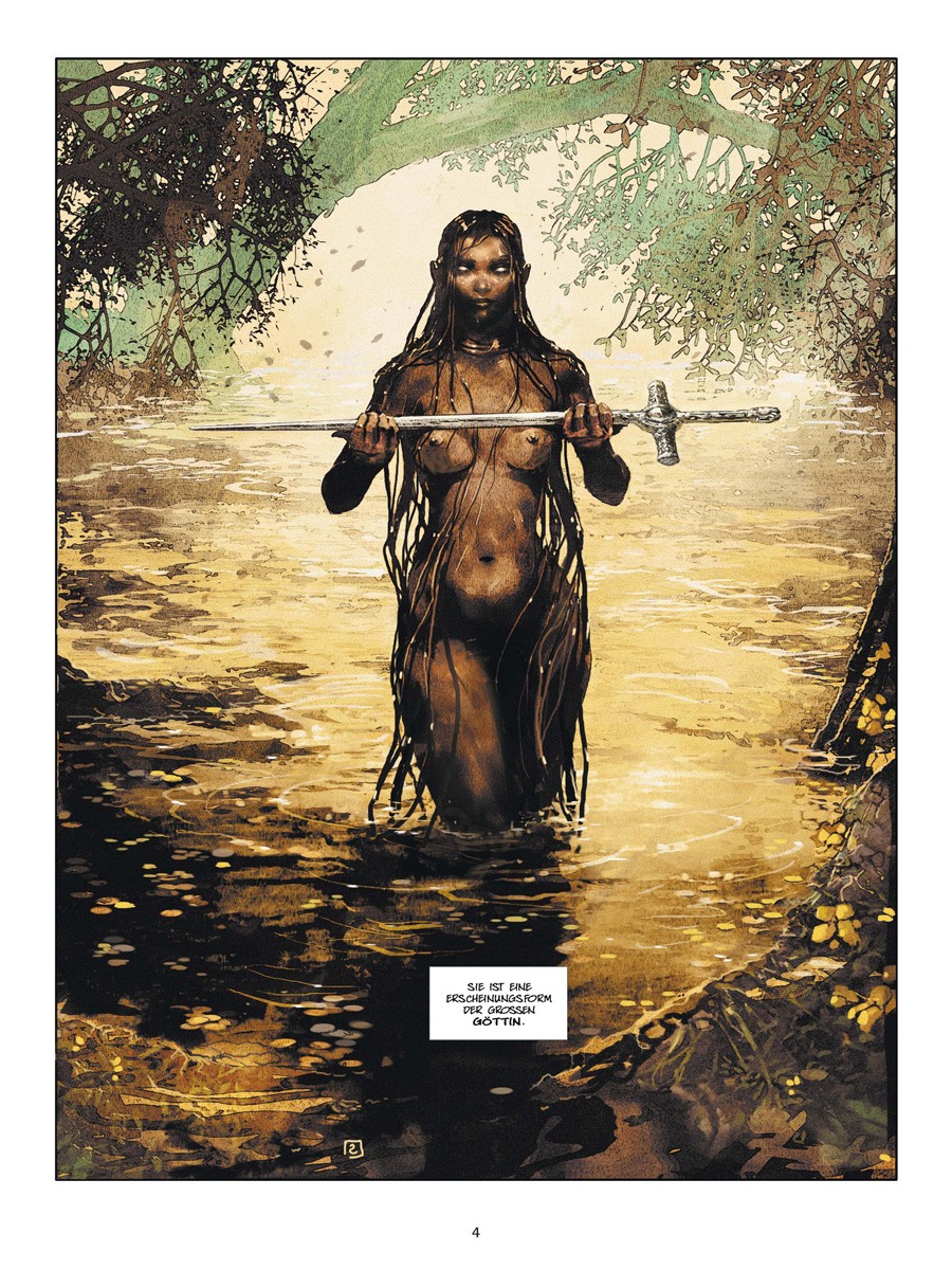 Dieses Schwert ist die Verlängerung des Willens von Avalon. Der, der es führt, spricht im Namen der heiligen Insel. Merlin ein alter seherischer, aber nicht unfehlbarer Druide. Uther Pendragon, ein junger Rohling, der lernt ein wahrer König zu werden. Ygraine, eine Frau, geschlagen für ihre religiösen Überzeugungen. Gorlois, ein perverser Sadist von fanatischer Gottesfurcht und Henker seiner Frau. Und Morgane, ein bezauberndes Kind, das Dinge sieht, die sonst niemand sieht, nicht einmal Merlin. Ein Kind das darunter leidet zu wissen, dass es unweigerlich eines Tages böse sein wird.