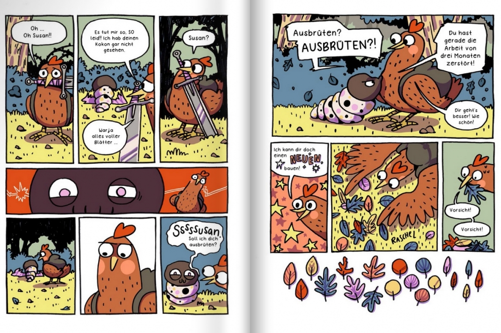Franziska Ruflair erzählt hier in ihrem ersten Comic eine fantastische Geschichte. Die ungewöhnliche Freundschaft einer Raupe und einem Huhn ist ein Märchen in einer dementsprechenden Welt, in der allerlei seltsame Wesen auftreten.