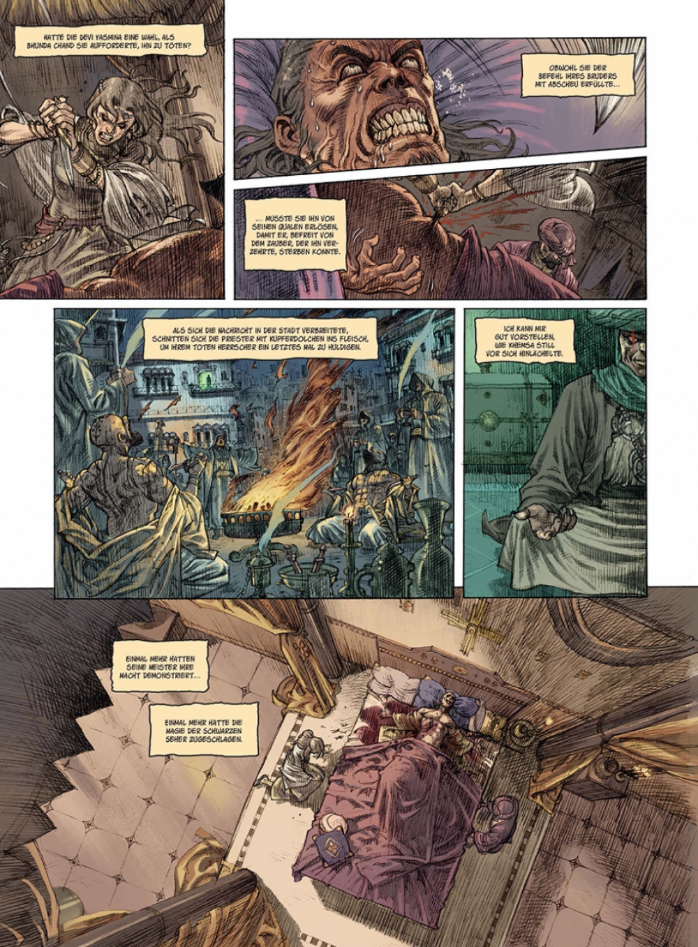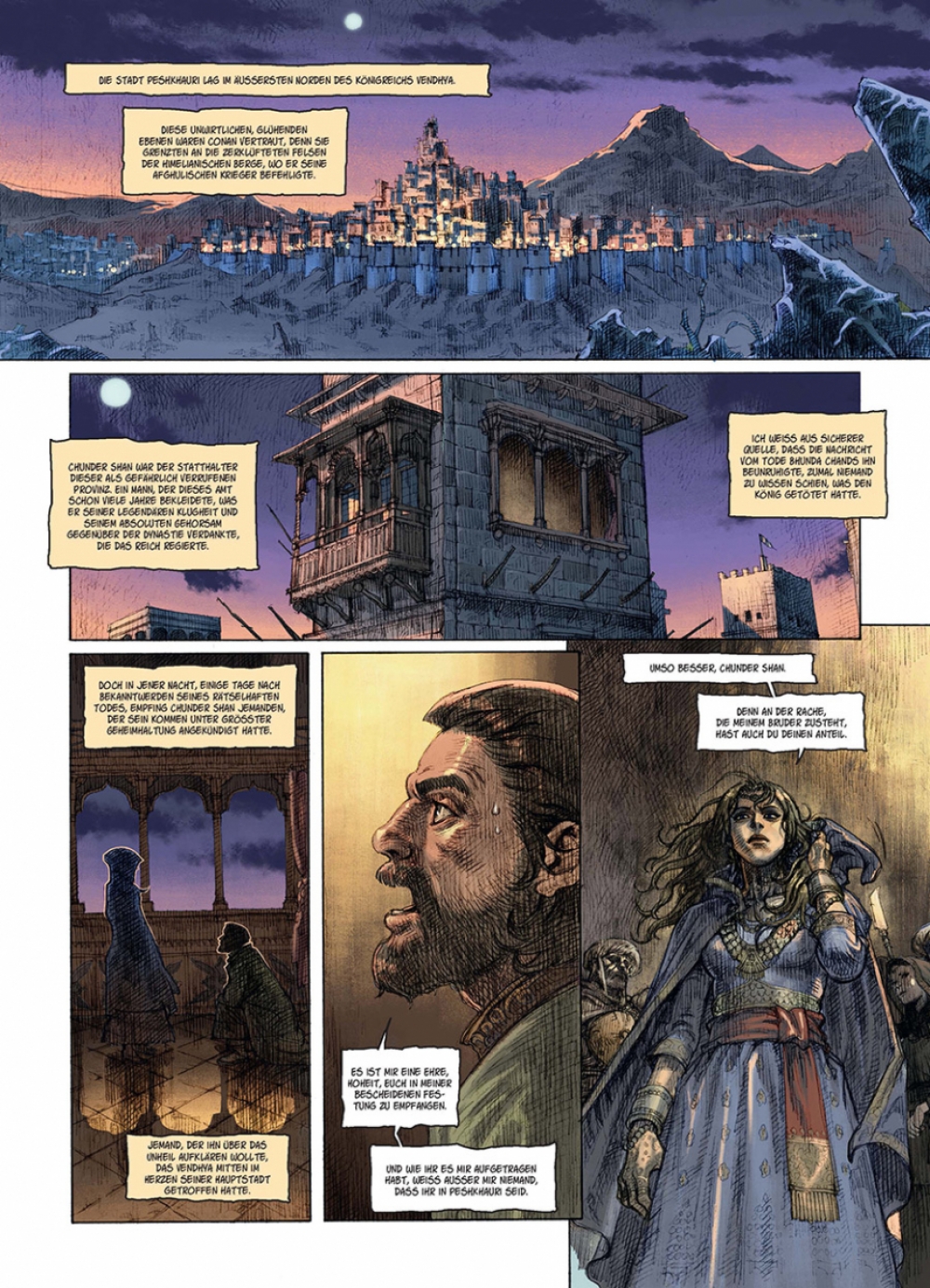"Rache ist eine Kunst! Der schwarze Prophet Yimsha hat mit seinen finsteren Zaubern den König des Reichs Vendhya niedergestreckt, und jetzt sinnt dessen Schwester Yasmina auf Vergeltung. Sie entscheidet, dafür auf die Hilfe des legendären Kriegers Conan zurückzugreifen. Der hat jedoch selbst noch eine Rechnung mit Vendhya offen, denn viele seiner Gefolgsleute sind im Kampf gegen die Soldaten des Königs gestorben. Und während die Prinzessin denkt, dass Conan ihr dient, ist sie es, die zur Marionette wird...
