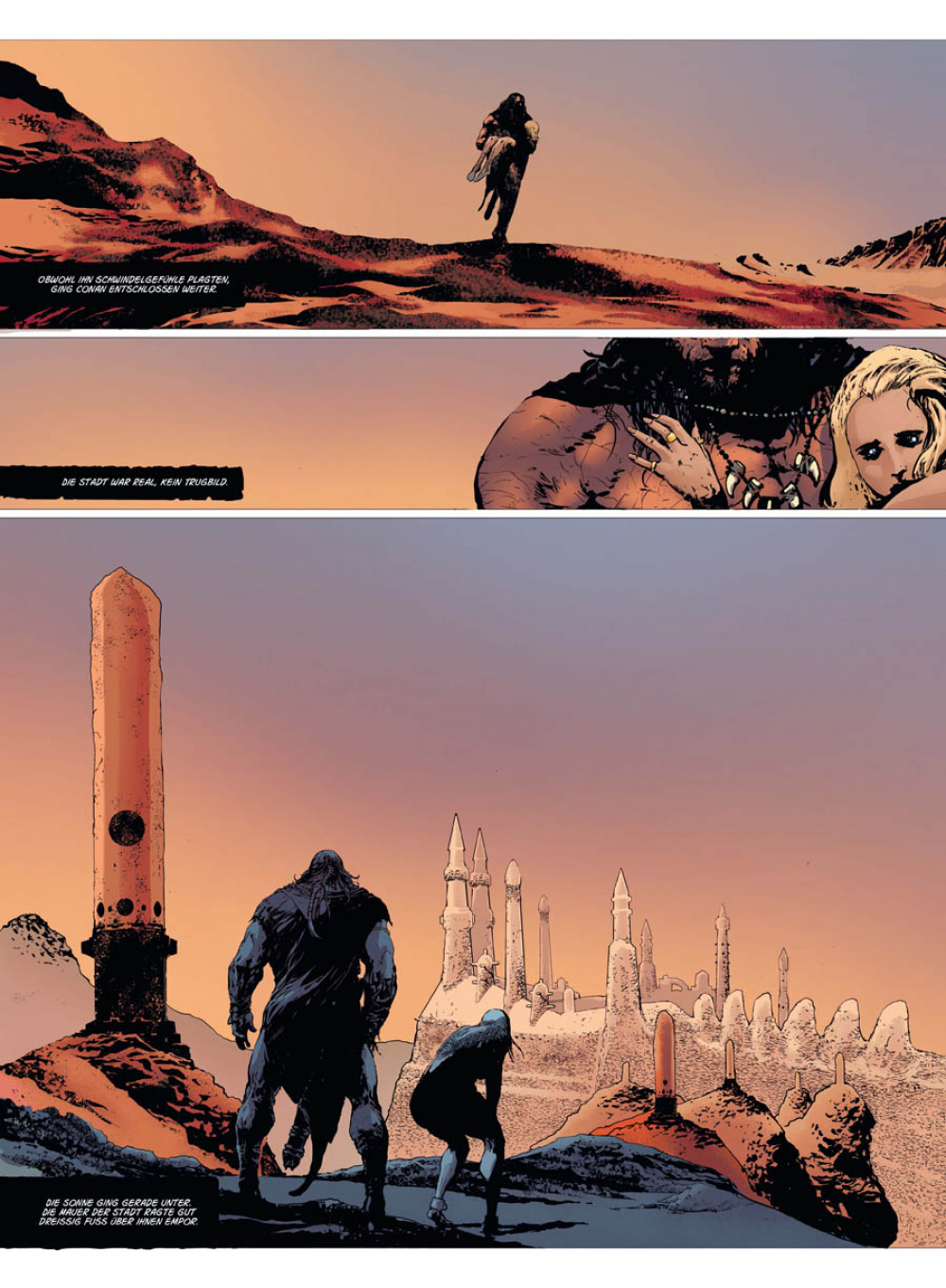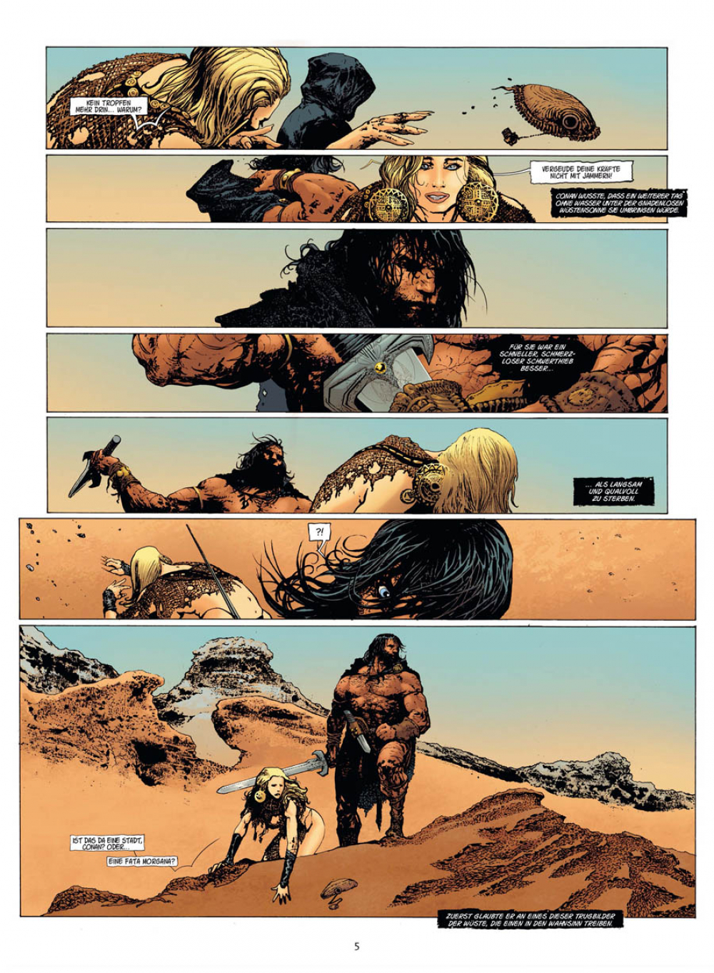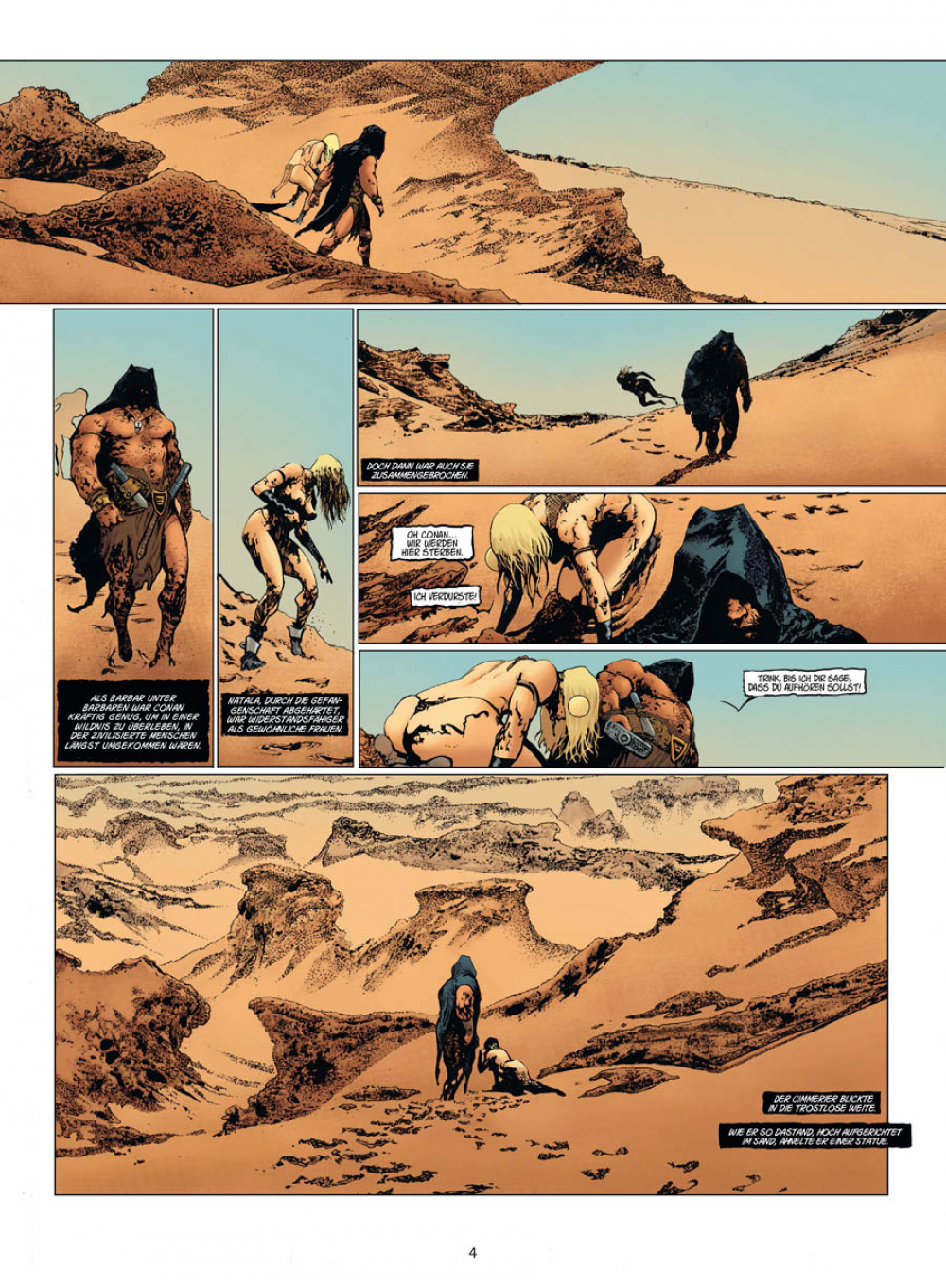 Verloren in den endlosen Sandwogen der Wüste, der sengenden Sonne und dem Durst wehrlos ausgeliefert, schleppen Conan und die befreite Sklavin Natala sich voran. Nahrung und Wasser gehen zur Neige, und an diesem Ort bedeutet das nur eins: den Tod. Da erblickt Conan in der Ferne eine Stadt, die er fast für eine Fata Morgana hält. Doch es ist Xuthal. In diesem Moment verheißt Xuthal die Rettung für das Paar, doch kaum haben die Liebenden die Stadt betreten, überkommt sie eine düstere Vorahnung, denn abgesehen vom kalten Leichnam eines Mannes begrüßt sie dort nur Stille. Ohne es zu wissen, sind Conan und Natala in das Reich eines uralten Gottes geraten, der über die verlassenen Gemäuer herrscht...