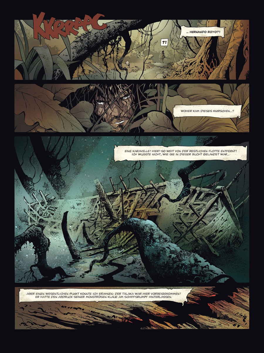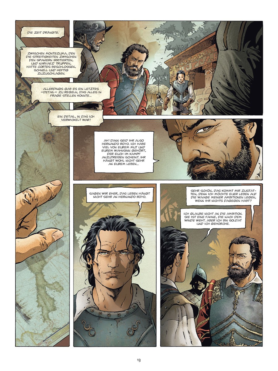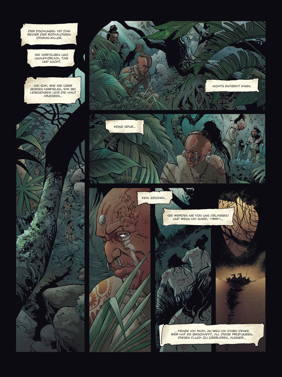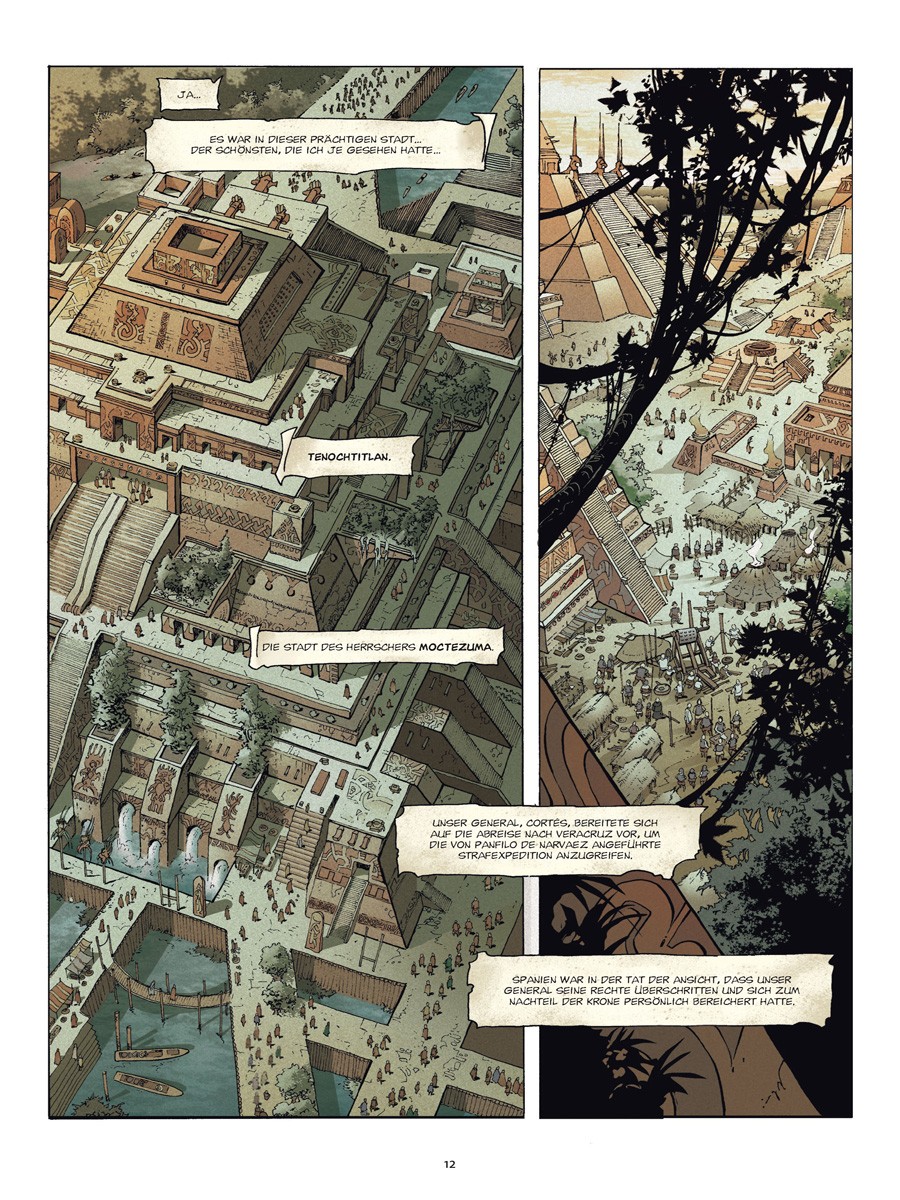Seit der Ankunft in Amerika werden Hernán Cortés und seine Armee vom Herrscher der Azteken, Moctezuma, als Gottheiten betrachtet. Schon lange wirtschaftet Cortés eher in die eigene Tasche als in jene der weit entfernten spanischen Krone. Während er selbst aufbricht, um eine Strafexpedition zu treffen, die ihn an seine Pflicht erinnern soll, beauftragt Cortés eine zusammengewürfelte Truppe aus Soldaten und Söldnern, den sagenhaften Schatz von Moctezuma zu rauben. Unter ihnen befindet sich auch der loyale Soldat Hernando Royo... Schon bald wird die Gruppe der Abenteurer auf mysteriöse Art dezimiert. Doch wer verfolgt sie durch den Dschungel? Ein Mensch? Ein Dämon? Eines ist sicher: Niemand vergreift sich ungestraft an den uralten und mächtigen Azteken-Legenden... Eine mystisch-fantastische Abenteuersaga vom Autorenduo der Serie Kreuzzug.
