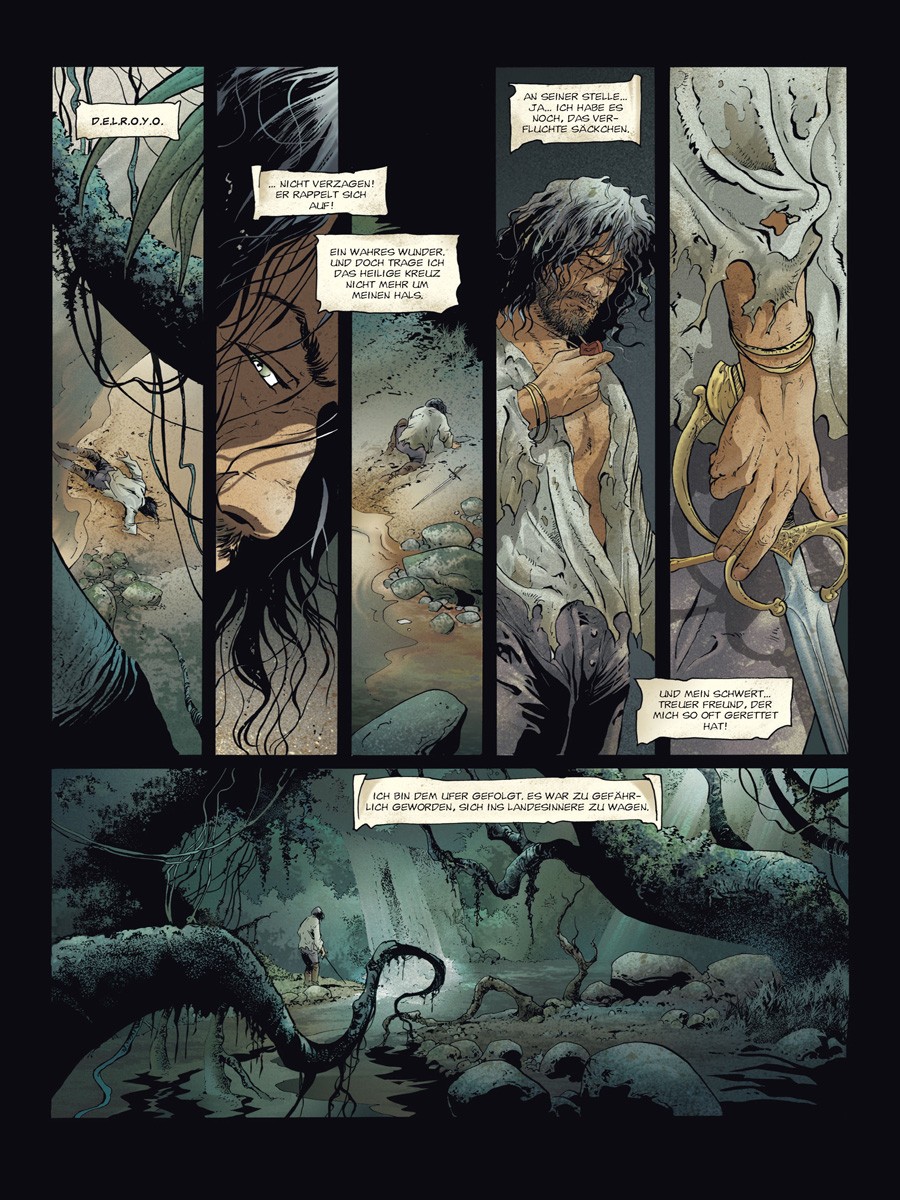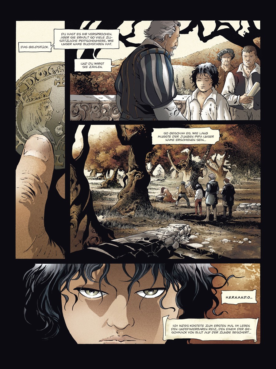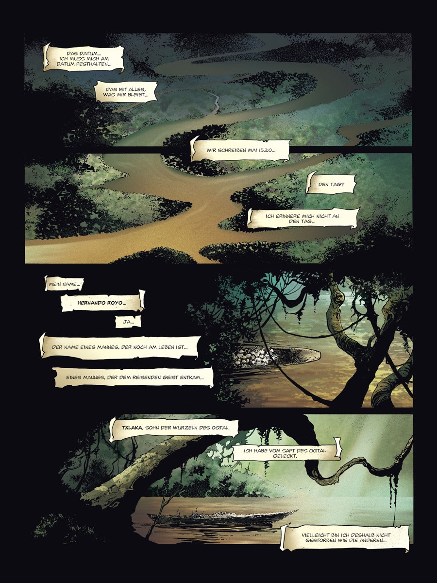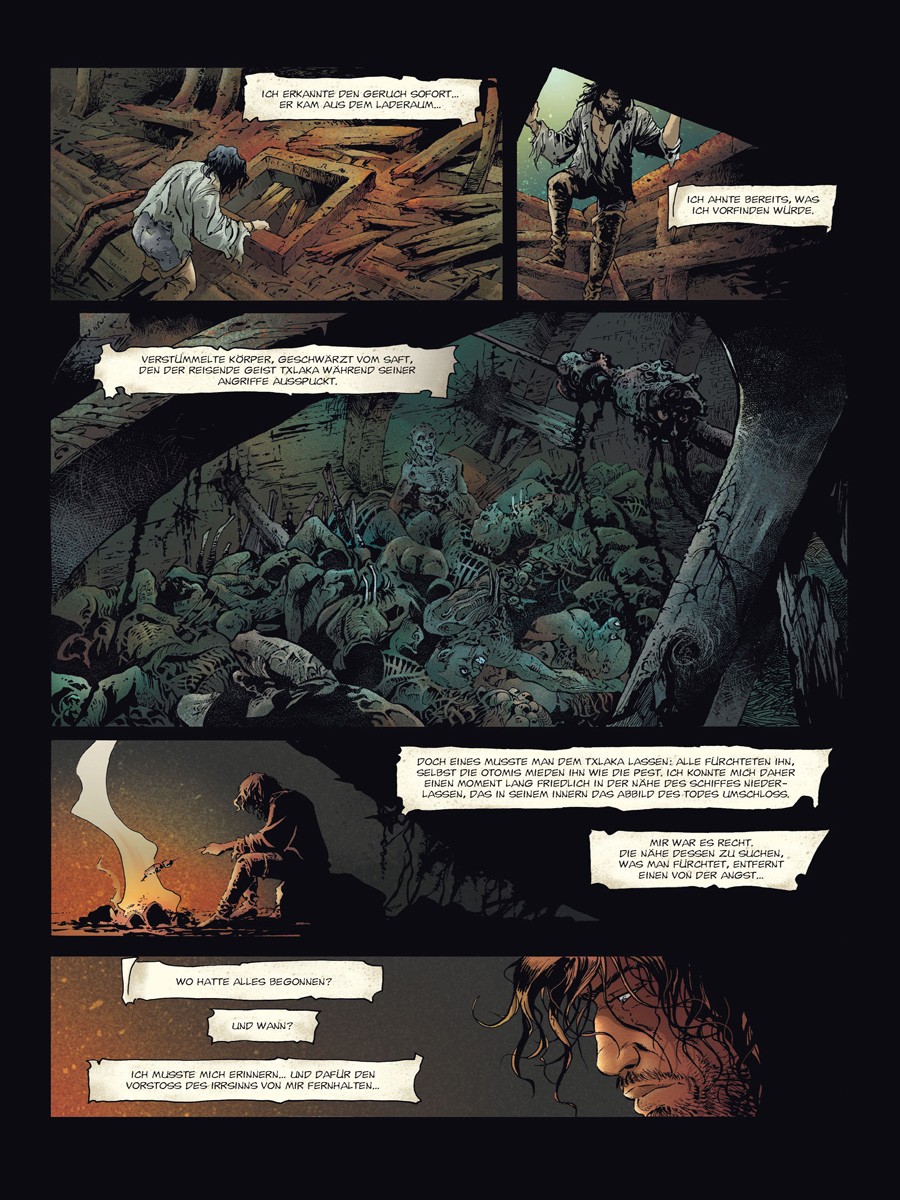 Seit der Ankunft in Amerika werden Hernán Cortés und seine Armee vom Herrscher der Azteken, Moctezuma, als Gottheiten betrachtet. Schon lange wirtschaftet Cortés eher in die eigene Tasche als in jene der weit entfernten spanischen Krone. Während er selbst aufbricht, um eine Strafexpedition zu treffen, die ihn an seine Pflicht erinnern soll, beauftragt Cortés eine zusammengewürfelte Truppe aus Soldaten und Söldnern, den sagenhaften Schatz von Moctezuma zu rauben. Unter ihnen befindet sich auch der loyale Soldat Hernando Royo... Schon bald wird die Gruppe der Abenteurer auf mysteriöse Art dezimiert. Doch wer verfolgt sie durch den Dschungel? Ein Mensch? Ein Dämon? Eines ist sicher: Niemand vergreift sich ungestraft an den uralten und mächtigen Azteken-Legenden... Eine mystisch-fantastische Abenteuersaga vom Autorenduo der Serie Kreuzzug.