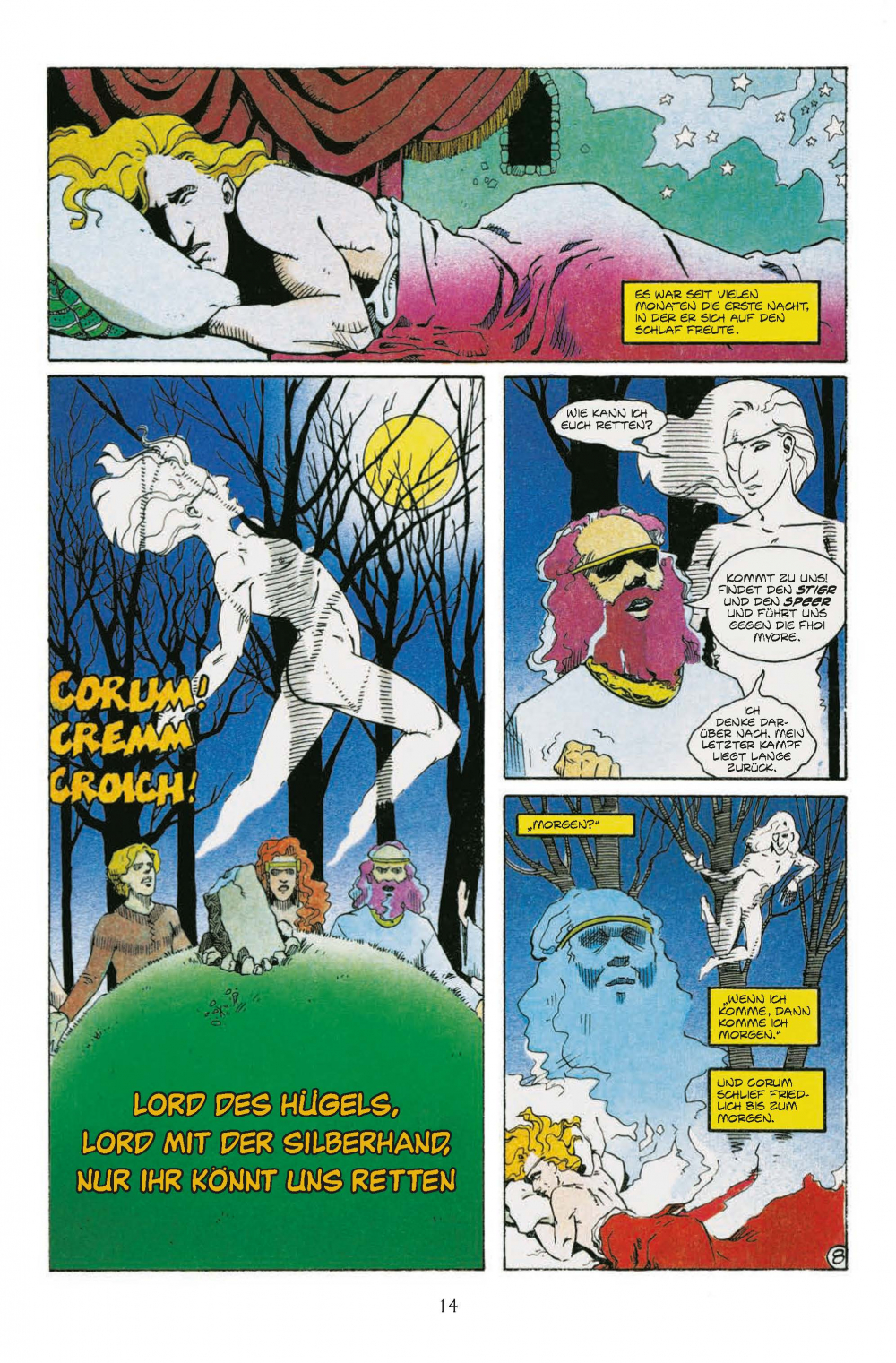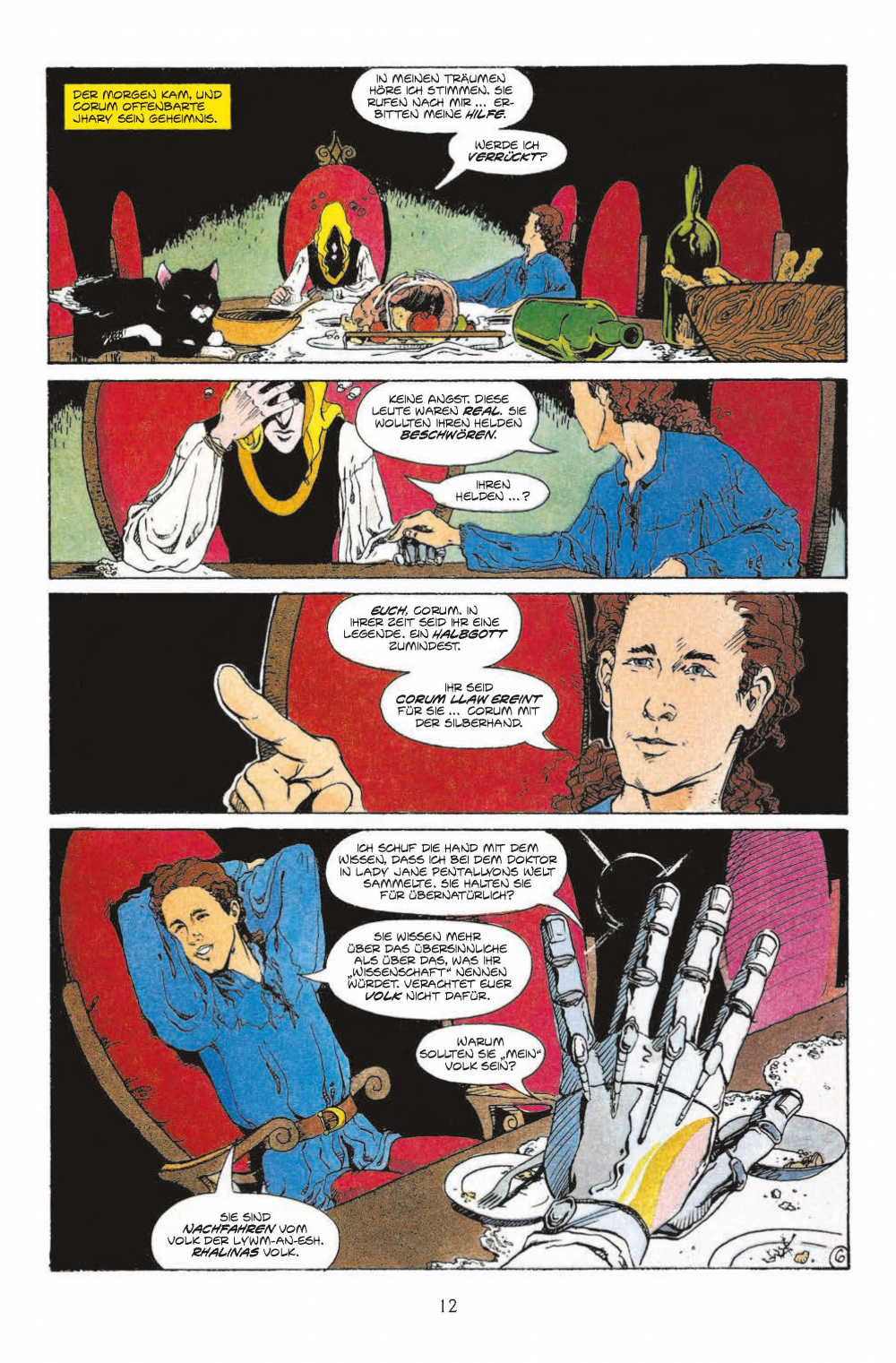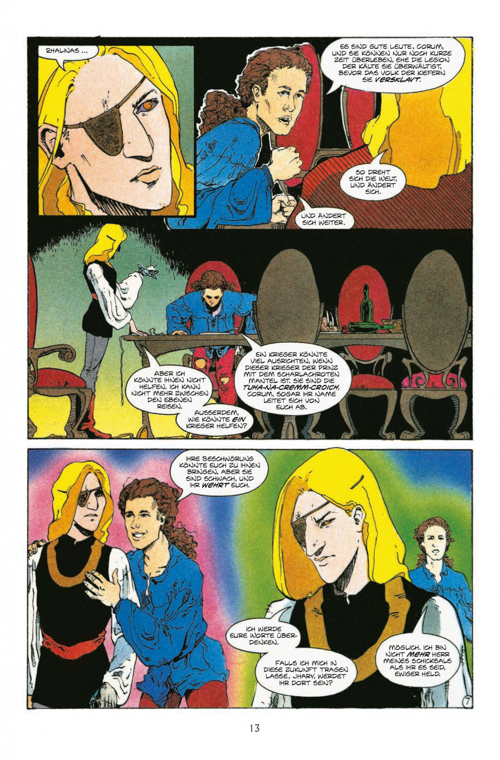 Die Chaos-Lords und der König der Schwerter sind längst tot, und es herrscht Frieden in den 15 Reichen. Aber nicht so für Corum, den scharlachroten Prinzen, der immer noch den Tod seiner einzig wahren Liebe Rhalina betrauert. Seltsame Stimmen beginnen, seine Träume heimzusuchen, und Corum muss erfahren, dass die Nachkommen von Rhalinas Volk, die Mabden, von den sieben Göttern der Vorhölle terrorisiert werden – das Volk der Mabden steht kurz vor der ewigen Vernichtung! Nun muss sich Corum auf die Suche nach dem schwarzen Stier von Crinanass begeben, wenn er auch nur den Hauch einer Chance auf die Rettung der Mabden haben will. Ein weiteres Kapitel der Comic-Adaption von Michael Moorcocks Saga um Corum und den Legenden des ewigen Helden wird aufgeschlagen. Diesmal an Bord: der renommierte Autor Mark Shainblum und die sechsfach mit dem Eisner Award ausgezeichnete Künstlerin Jill Thompson.
