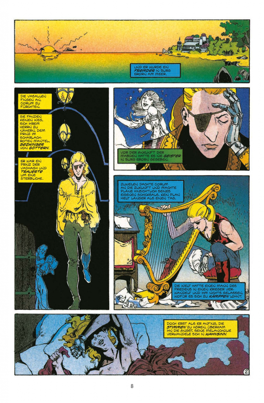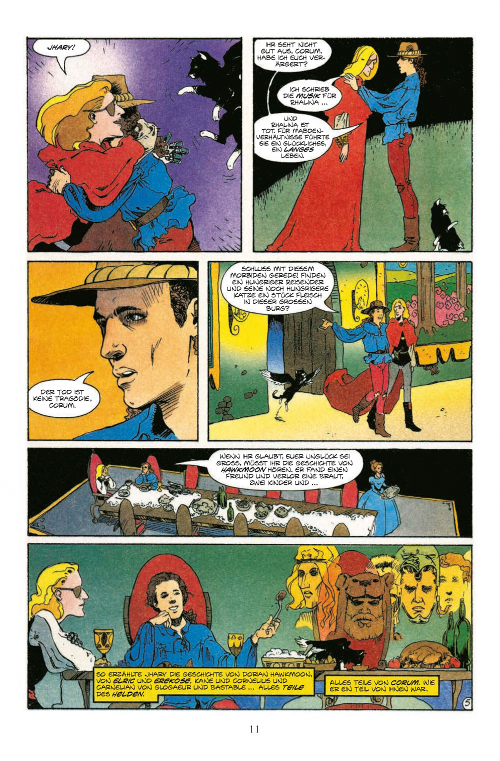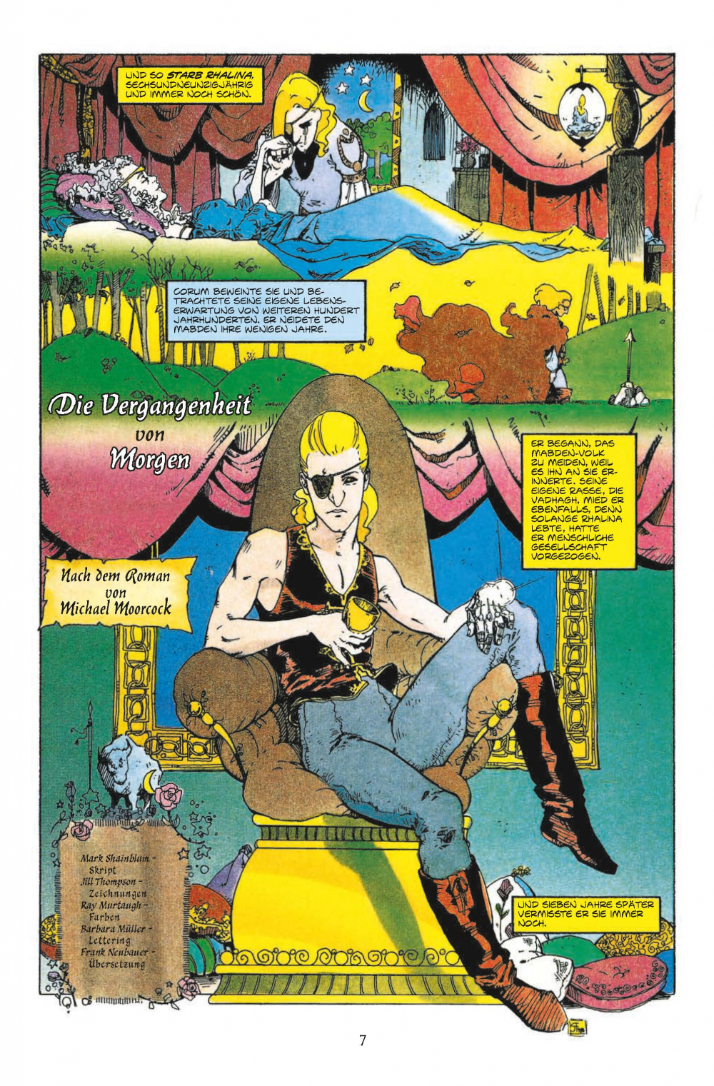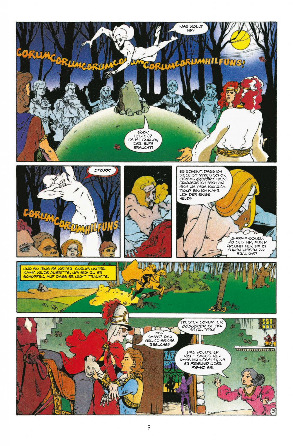 Die Chaos-Lords und der König der Schwerter sind längst tot, und es herrscht Frieden in den 15 Reichen. Aber nicht so für Corum, den scharlachroten Prinzen, der immer noch den Tod seiner einzig wahren Liebe Rhalina betrauert. Seltsame Stimmen beginnen, seine Träume heimzusuchen, und Corum muss erfahren, dass die Nachkommen von Rhalinas Volk, die Mabden, von den sieben Göttern der Vorhölle terrorisiert werden – das Volk der Mabden steht kurz vor der ewigen Vernichtung! Nun muss sich Corum auf die Suche nach dem schwarzen Stier von Crinanass begeben, wenn er auch nur den Hauch einer Chance auf die Rettung der Mabden haben will. Ein weiteres Kapitel der Comic-Adaption von Michael Moorcocks Saga um Corum und den Legenden des ewigen Helden wird aufgeschlagen. Diesmal an Bord: der renommierte Autor Mark Shainblum und die sechsfach mit dem Eisner Award ausgezeichnete Künstlerin Jill Thompson.