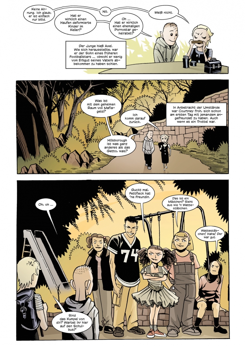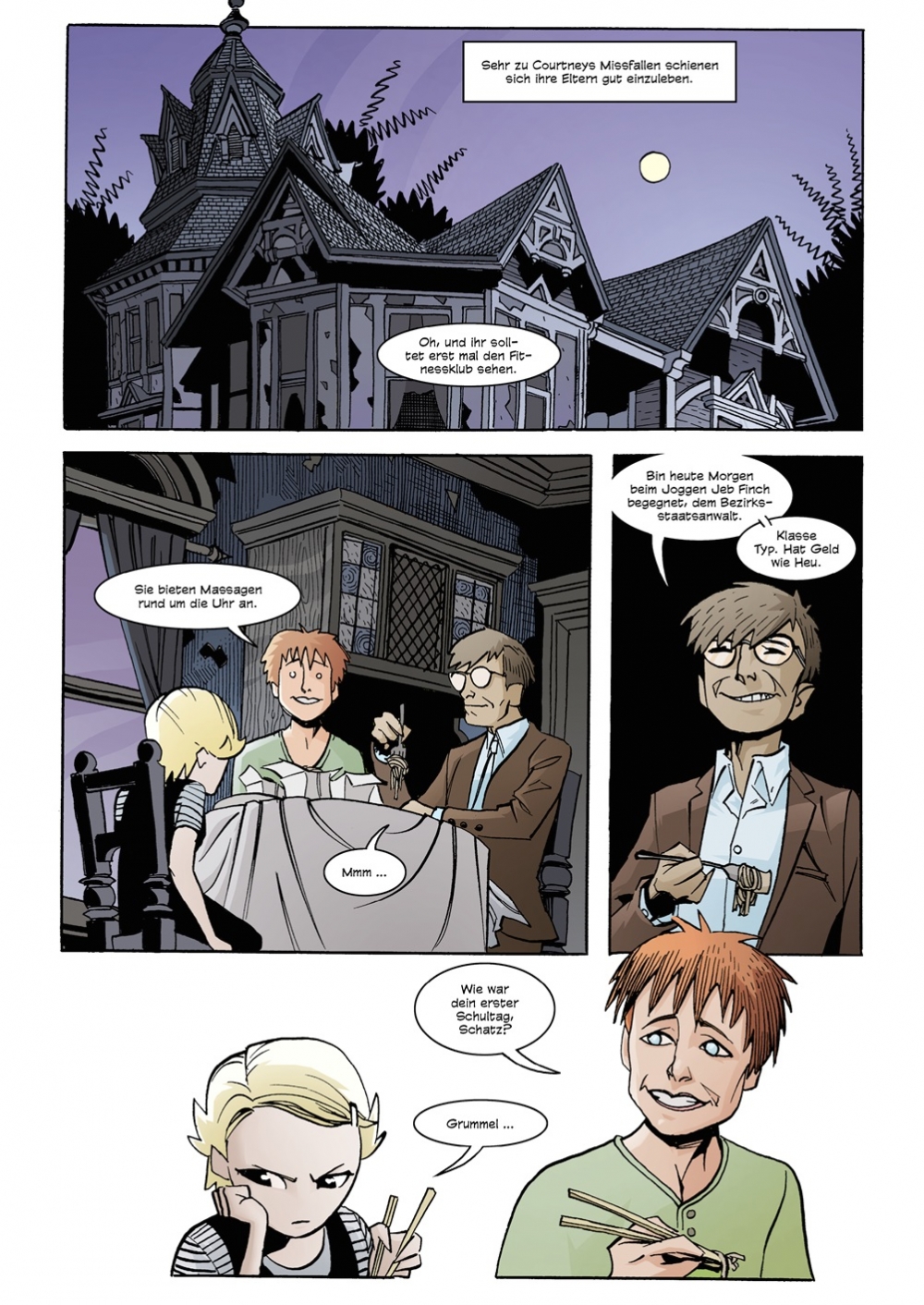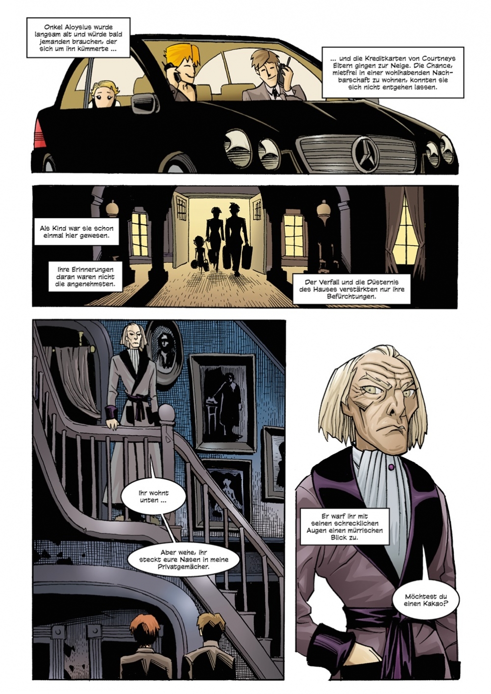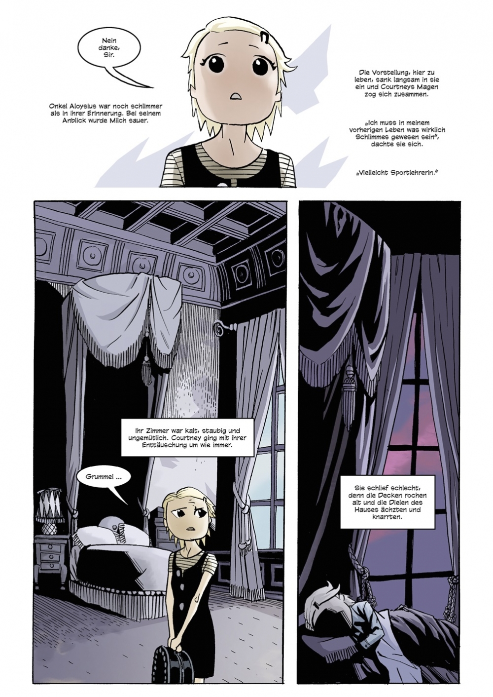 Courtney war mit ihrem Leben immer ganz zufrieden. Sie hatte in ihrem Viertel viele Freunde und ihr machte die Schule Spaß, denn sowohl die Lehrer als auch der Unterricht waren super! Doch das ist nun vorbei. Ihre Eltern haben sie in irgendeinen Nobelvorort geschleppt, wo sie mit ihr fortan im alten Spukhaus des gruseligen Großonkels Aloysius wohnen wollen. Und während sich der Rest der Familie problemlos mit seinem neuen sozialen Status abfindet, muss sich Courtney nun mit hochnäsigen Klassenkameraden und den seltsamen zwielichtigen Besuchern herumschlagen, die oft bei ihrem Onkel vorbeischauen. Statt der Kinder aus der Nachbarschaft sind nun grausige Ghule und gräuliche Geister ihre einzigen Freunde. Hmm ... vielleicht wird das ja doch gar nicht so übel ...