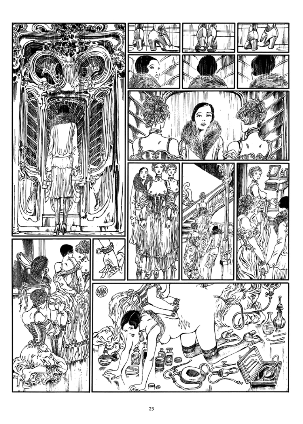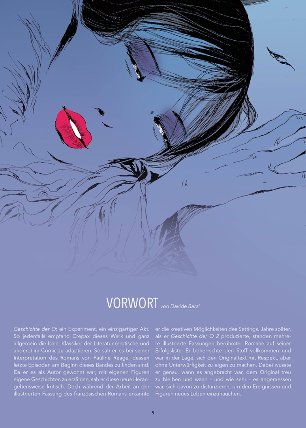 »Geschichte der O« von Pauline Réage ist das Skandalbuch schlechthin: Die Chronologie der Versklavung einer Frau aus ihrem eigenen Wunsch heraus wirft auch heute, 70 Jahre nach ihrer Erstveröffentlichung, Fragen zum Verhältnis von Liebe und Unterwerfung, von Freiheit und Hörigkeit, von Begeisterung und Zwang auf. Die titelgebende O und ihre Ausbildung zum idealen Sadomaso-Sub und zum regelrechten Besitz ihres Herren ist aufrüttelnd und vollkommen tabulos. Von vielen als gefährliche Exzess-Pornographie verschrien, sehen andere in diesem Werk ein Paradebeispiel der anspruchsvollen erotischen Literatur. Guido Crepax macht sich den Roman gewohnt virtuos zu eigen, indem er eine originalgetreue, durch seine Zeichenkunst jedoch ungleich intensivere Adaption vorlegt – maßlos, betörend und extrem.